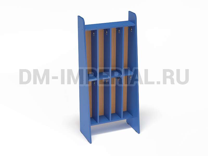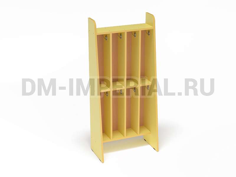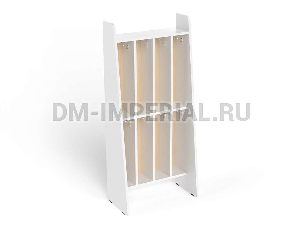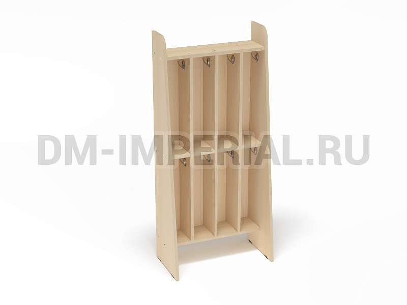 Шкаф обладает продуманным, эргономичным дизайном. Конструкция модели включает сразу четыре вертикальные секции и восемь отделений для хранения. Каждый оснащается крючком и полочкой. В верхней части есть перекладина, которую также можно задействовать под хранение или украсить интерьерными аксессуарами или цветами. Модель устанавливается на опоры, между которыми также есть немного свободного пространства. По желанию его также можно приспособить для хранения.