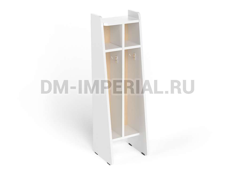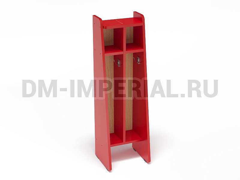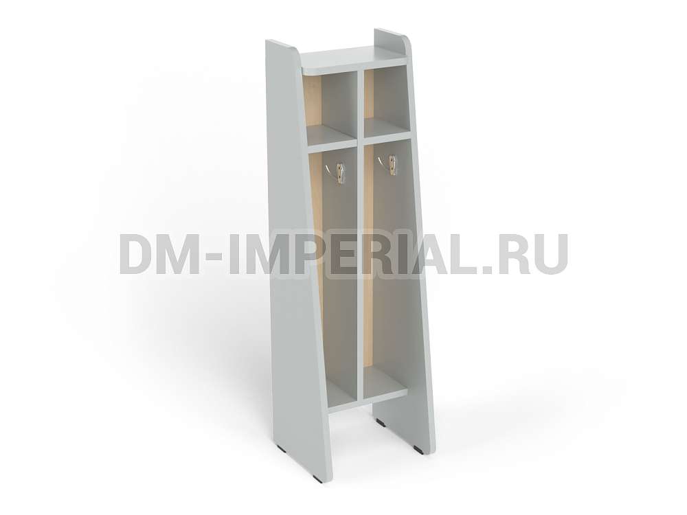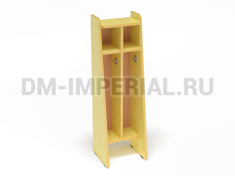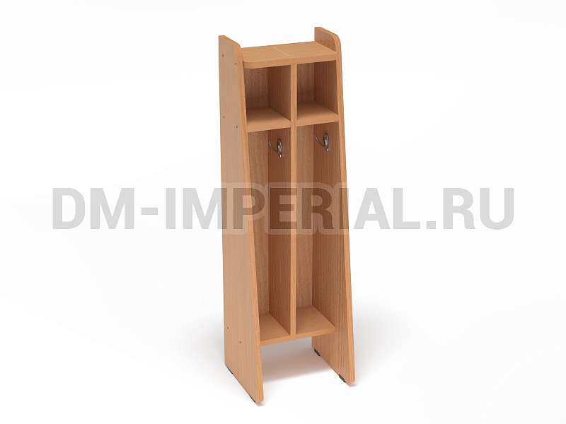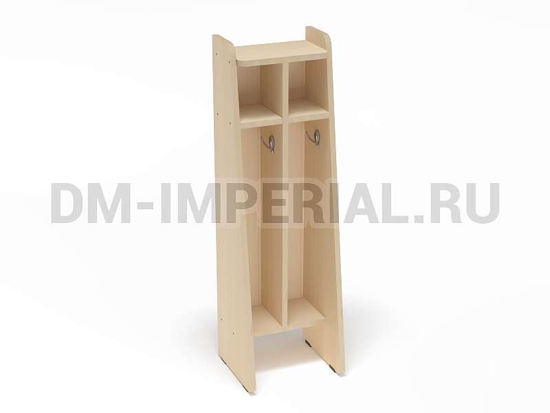 Данная модель спроектирована и изготовлена в рамках серии напольных шкафчиков для полотенец. Отлично впишется в интерьер ванной комнаты в детском дошкольном учреждении. Конструкция предназначена для пользования одновременно двумя детьми. Для каждого ребенка предусмотрена индивидуальная секция с крючком для полотенца и вместительной ячейкой сверху для хранения предметов гигиены, аксессуаров, личных вещей.
