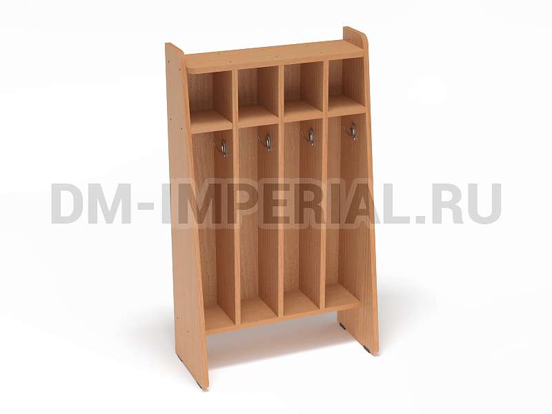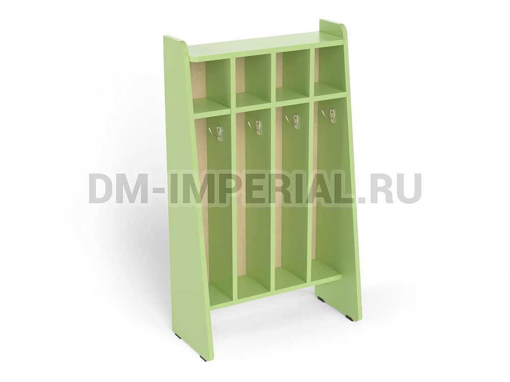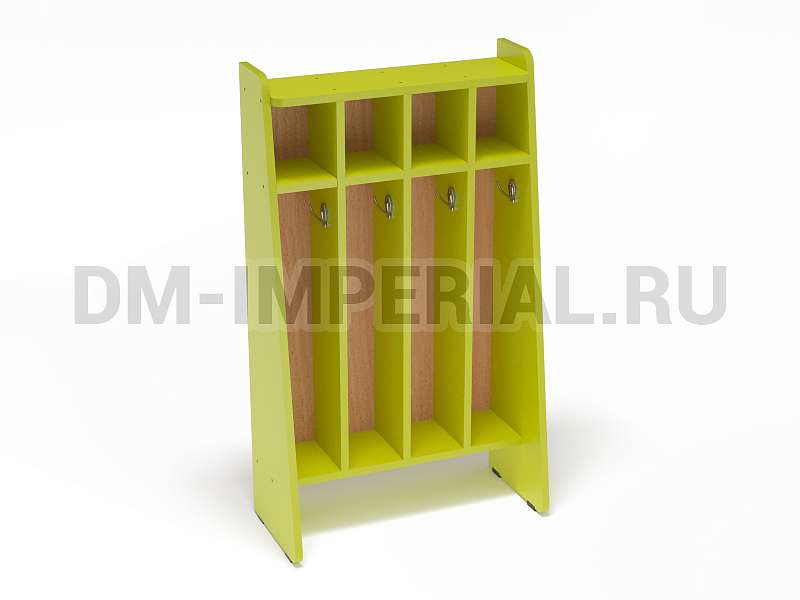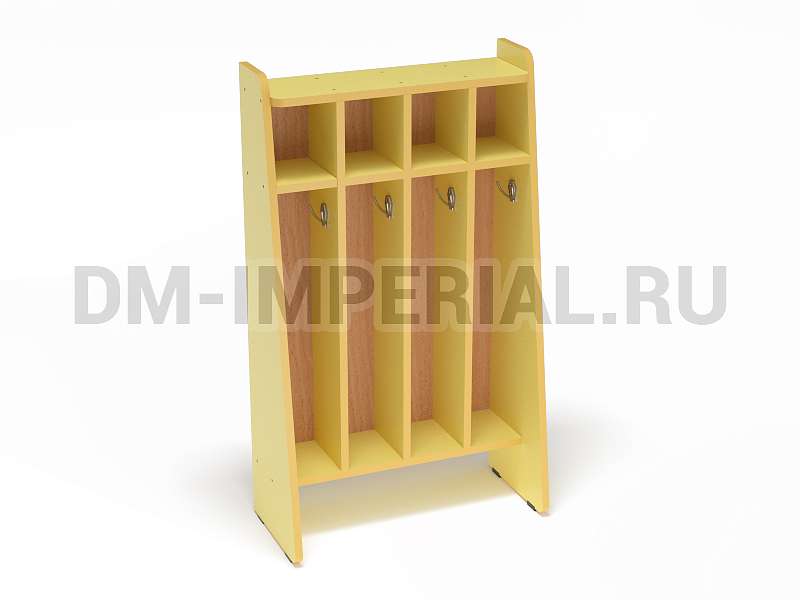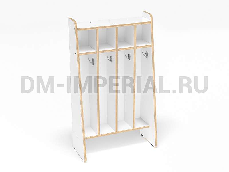 Представленная на данной странице модель предназначена для пользования одновременно четырьмя детьми. Для каждого ребенка предусмотрена собственная, индивидуальная секция, оборудованная крючком для полотенец и ячейкой для нужных вещей. В верхней части шкафчика есть свободное пространство, на котором можно разместить декор (например, цветы).