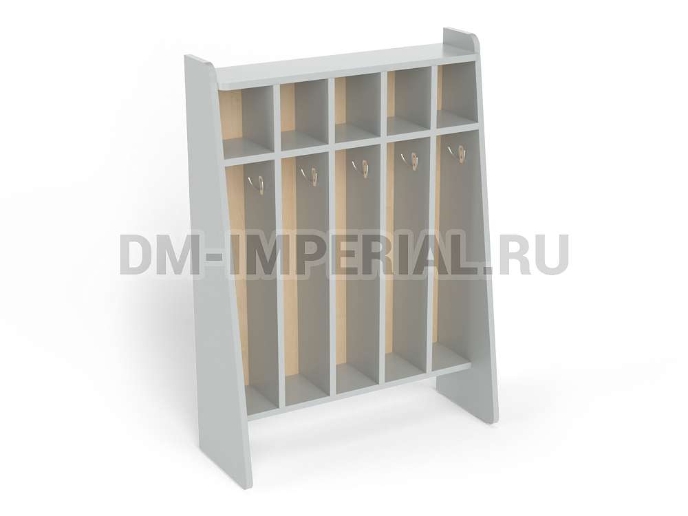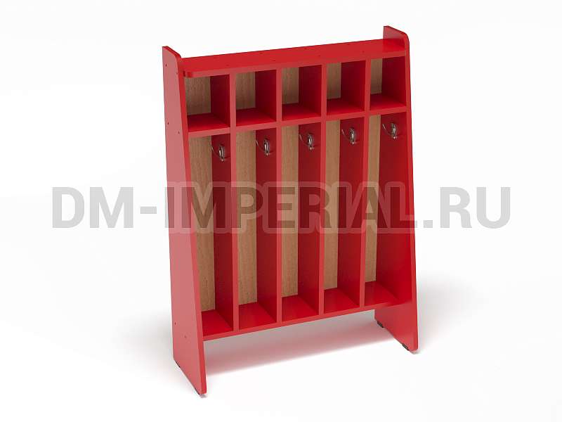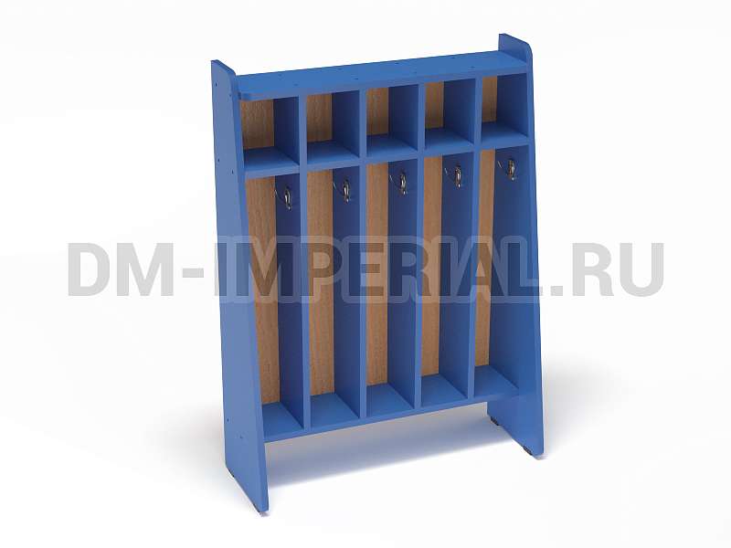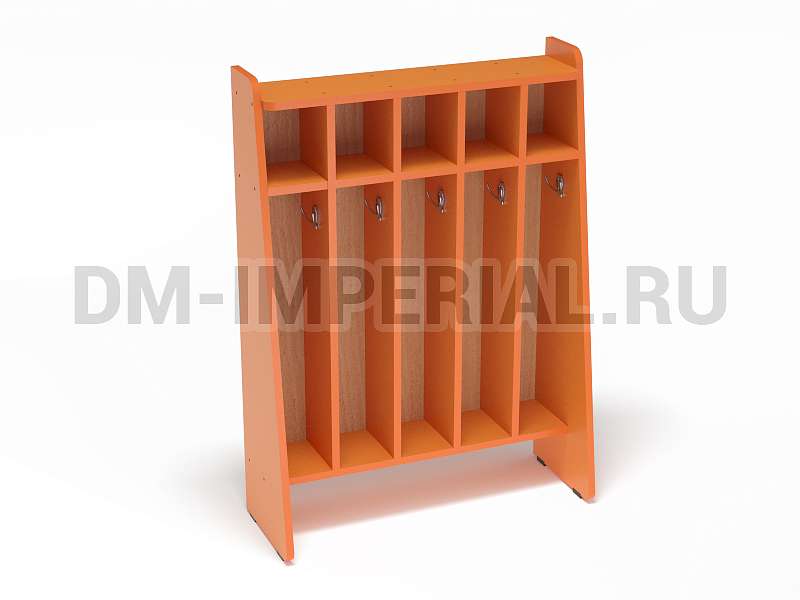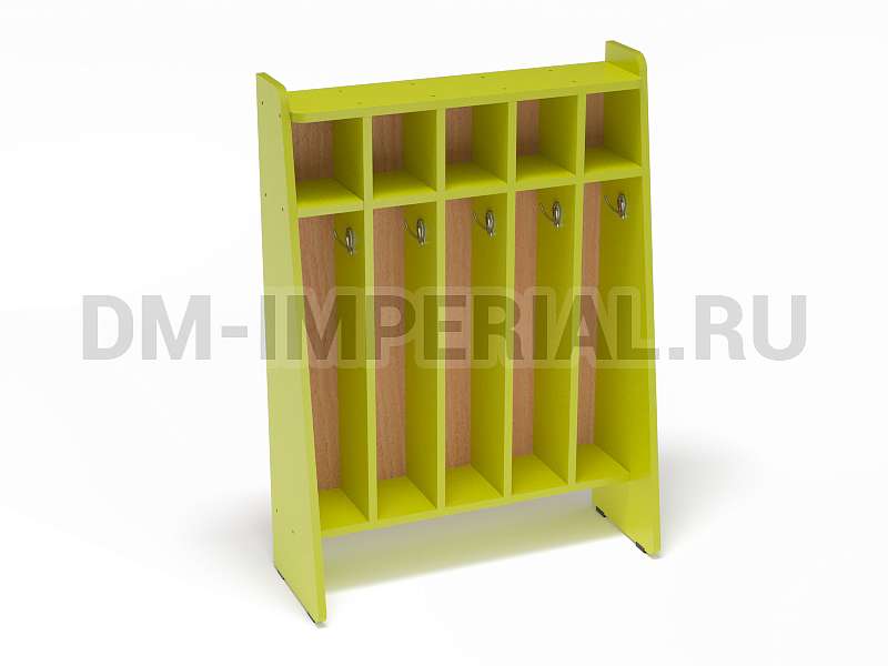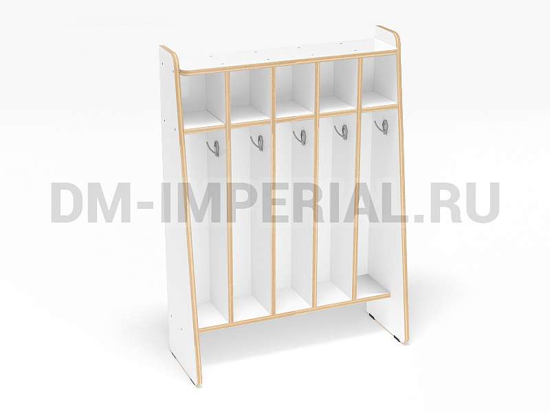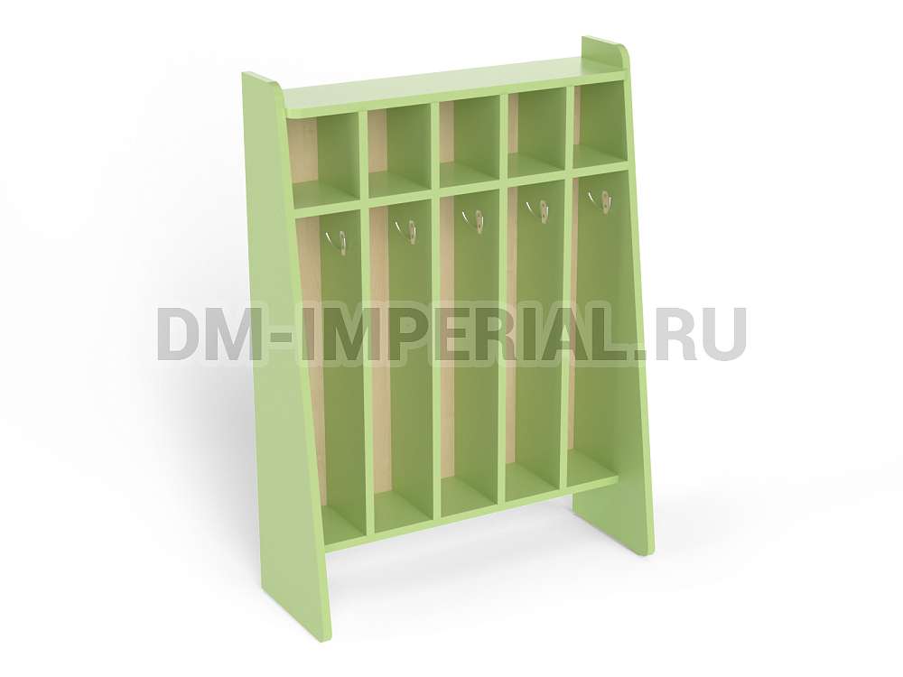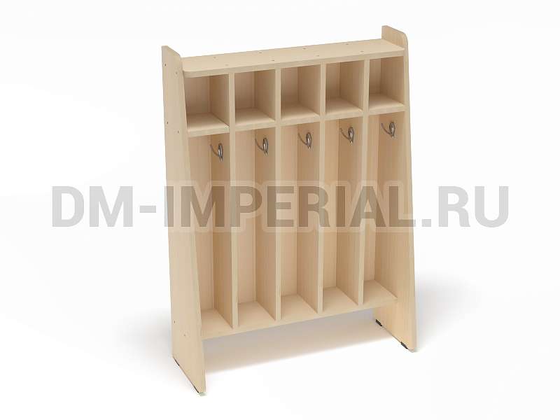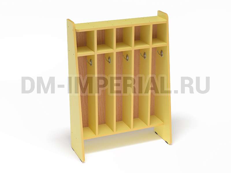 Данный шкаф предназначен для хранения полотенец и предметов гигиены в детских дошкольных учебно-развлекательных учреждениях. Включает сразу пять секций, которыми одновременно могут пользоваться пятеро ребятишек. Каждое отделение имеет место для хранения полотенца, оборудованное крючком, и полочку для различных мелочей (зубной пасты, мыла, мочалки и т.д).
