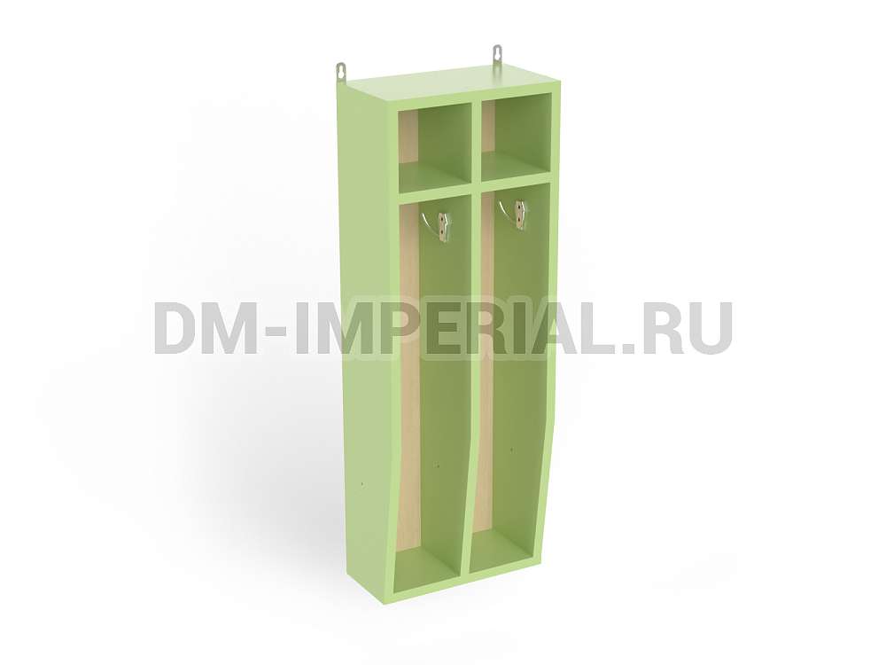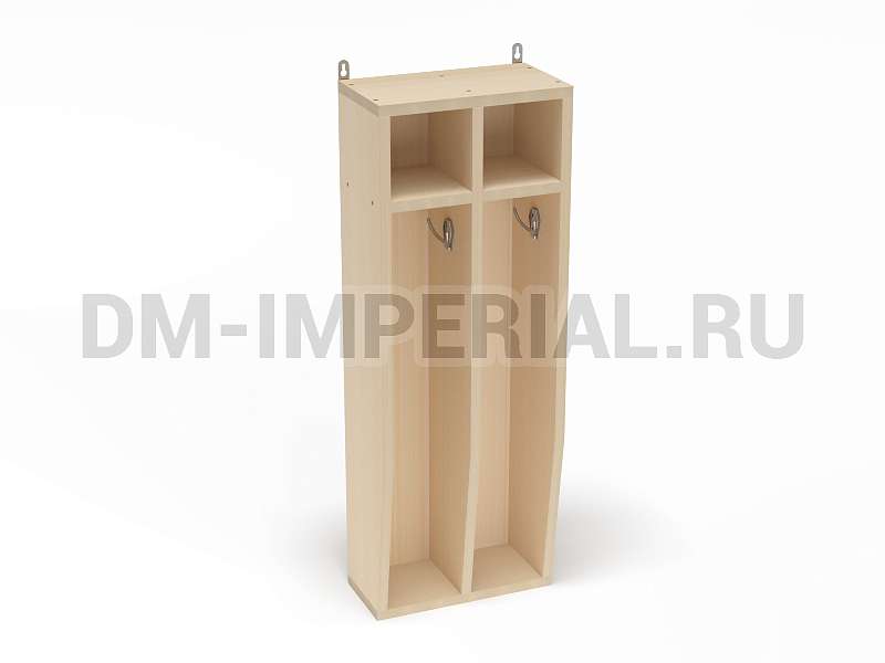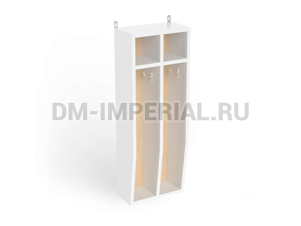 Навесной шкафчик включает две секции, оснащенные крючком и небольшой ячейкой (например, для предметов гигиены) сверху. Подходит для размещения полотенец. Изготавливается из ламинированных панелей ЛДСП толщиной 16 мм. Торцы мебели отделаны кромкой ПВХ толщиной 2 мм. Данные материалы хорошо подходят для влажных помещений. ЛДСП отличается высокой прочностью, износостойкостью, устойчивостью к попаданию жидкости на поверхность. Такой шкаф не разбухает, не гниет, не деформируется.