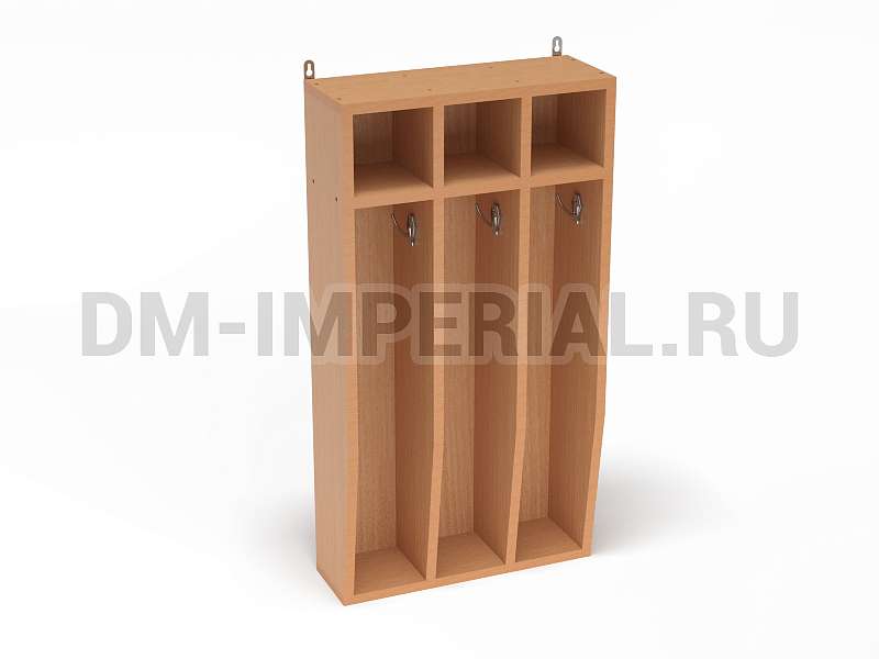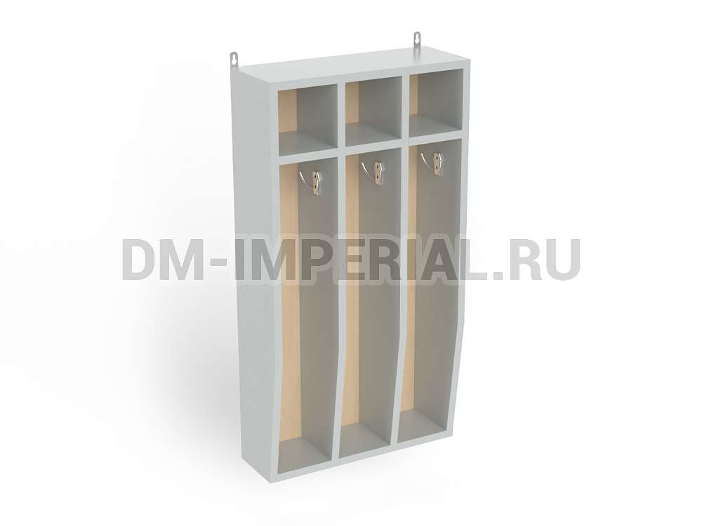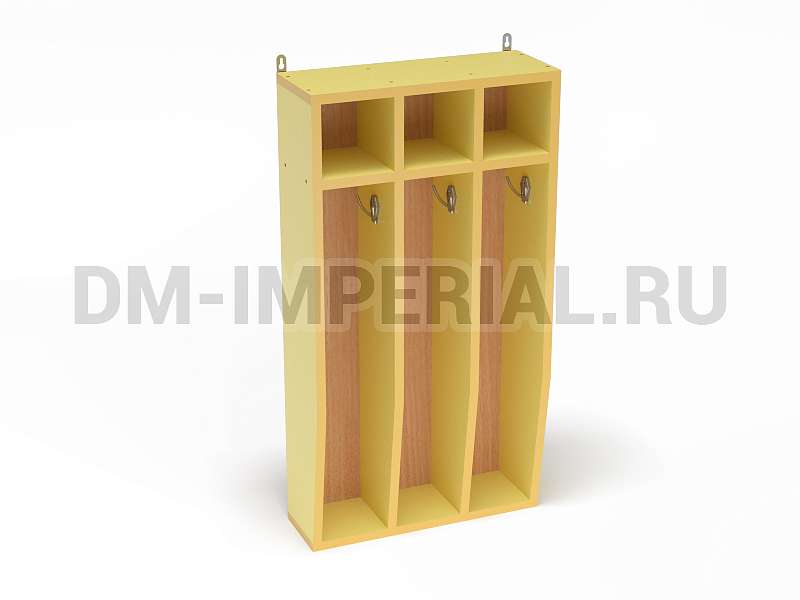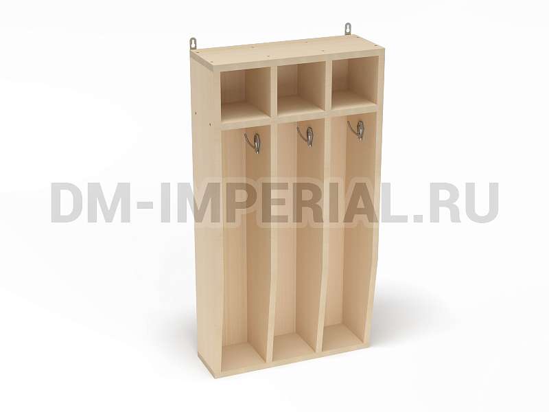 Конструкция шкафчика включает три отделения для трех детей. Каждая секция оснащается вместительной полочкой сверху и крючком для полотенца. В нижней части также есть небольшое пространство для хранения личных вещей. Шкаф является навесным и размещается на стене с помощью предусмотренных креплений.