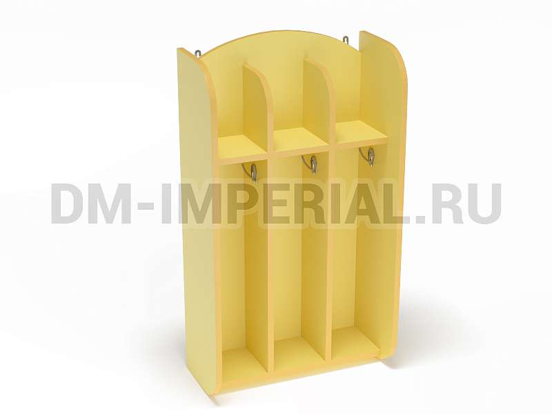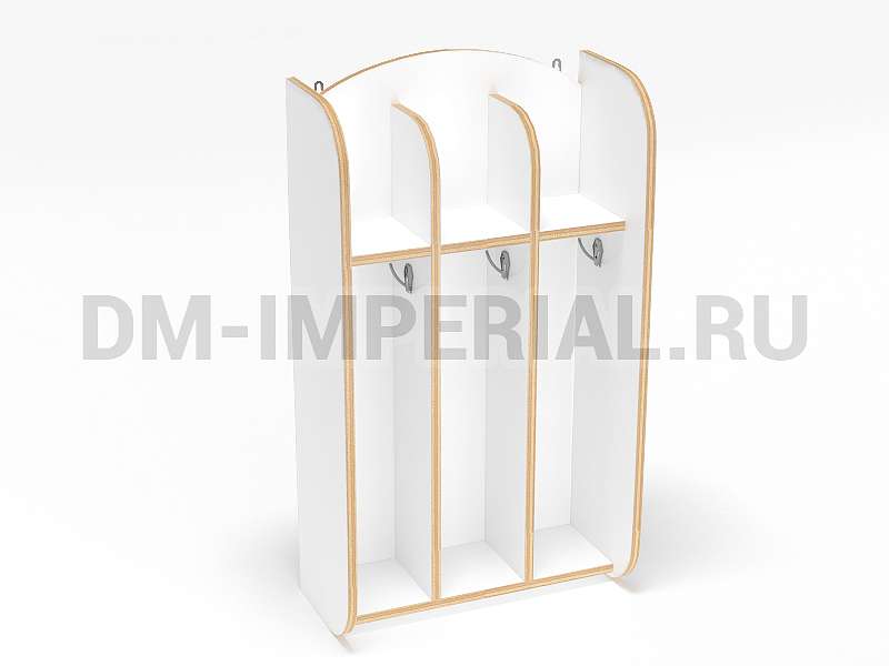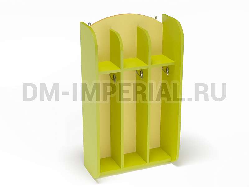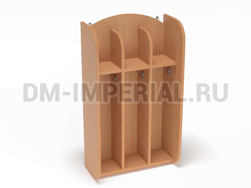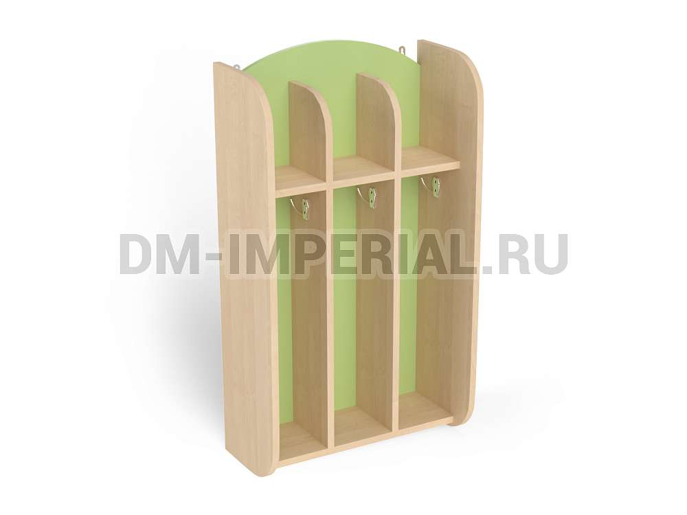 Шкафчик включает три секции для хранения для трех детей. Для каждого ребенка предусмотрено индивидуальное отделение, в котором можно разместить полотенце, а также все необходимые для проведения гигиенических процедур предметы. Интересен дизайн шкафа. Верхние полки не имеют ограничения сверху, что делает конструкцию визуально более легкой и красивой.