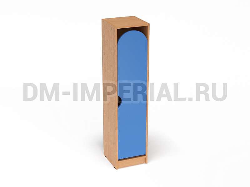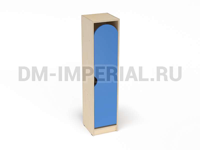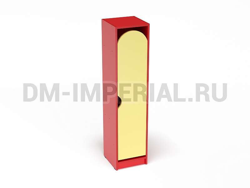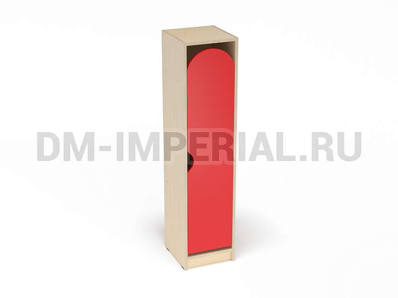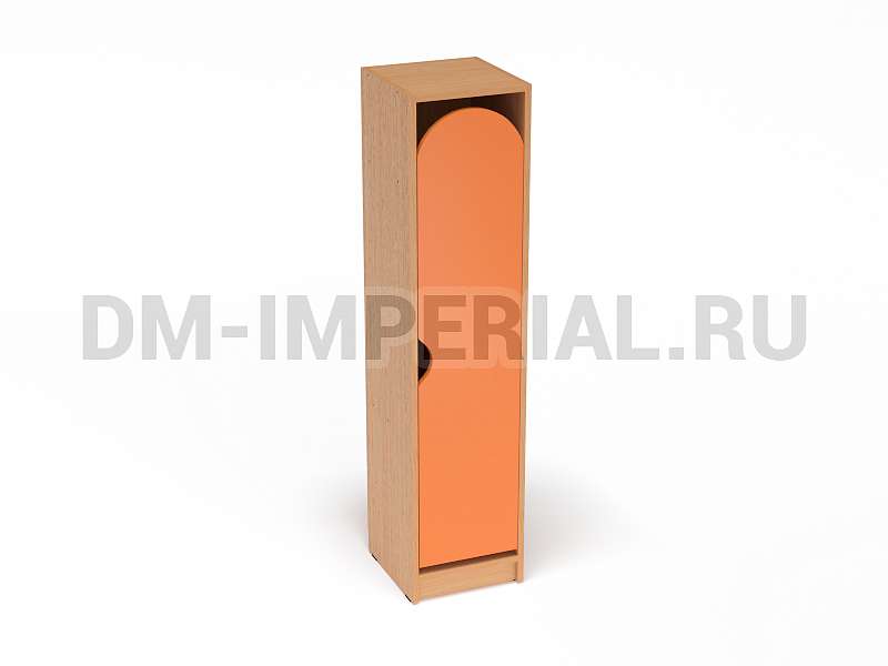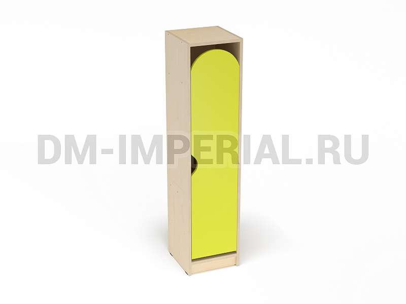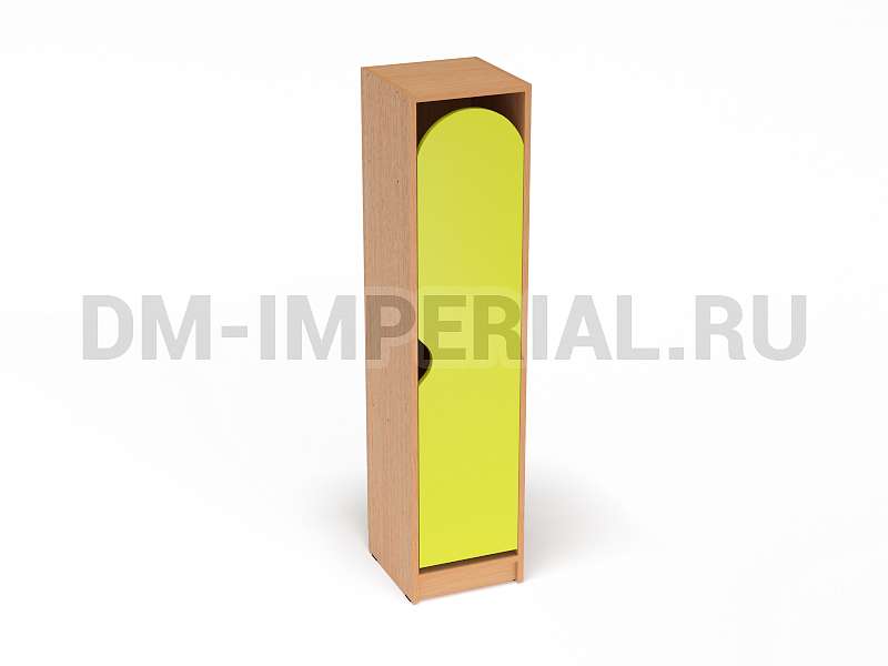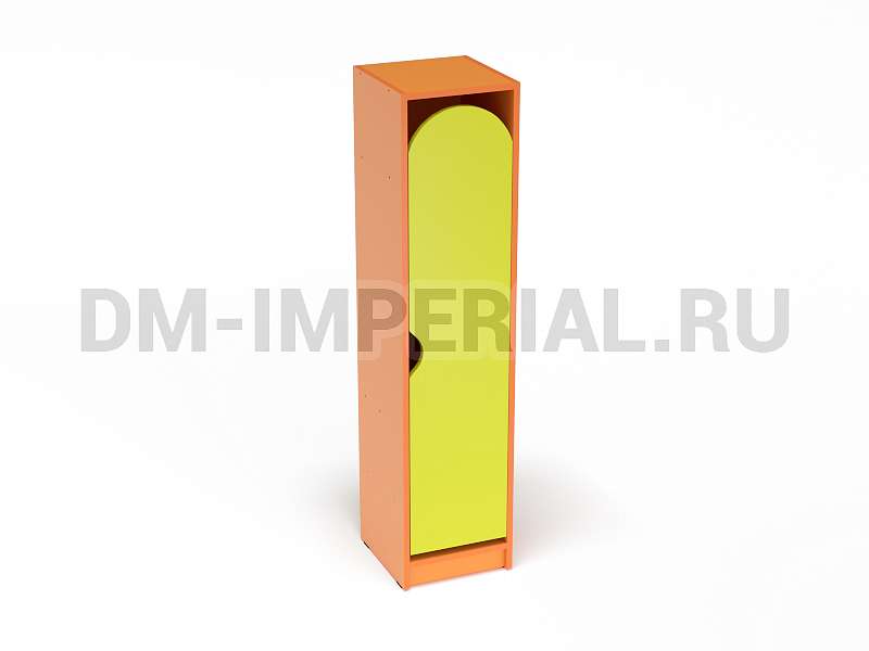 На данной странице размещен шкаф детский односекционный, выпускаемый в рамках серии модульной мебели. Модель может размещаться отдельно, либо сочетаться с другими шкафами. Линейка предоставляет широкий выбор вариантов: угловые, 1-5 секционные. Конструкция стандартная: зона для хранения вещей с дверцей, устанавливаемая на цоколь. Дверь оснащается полукруглой выемкой-ручкой. В верхней и нижней части шкафа есть отверстия для обеспечения беспрепятственной циркуляции воздуха.