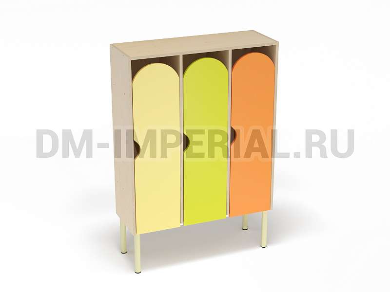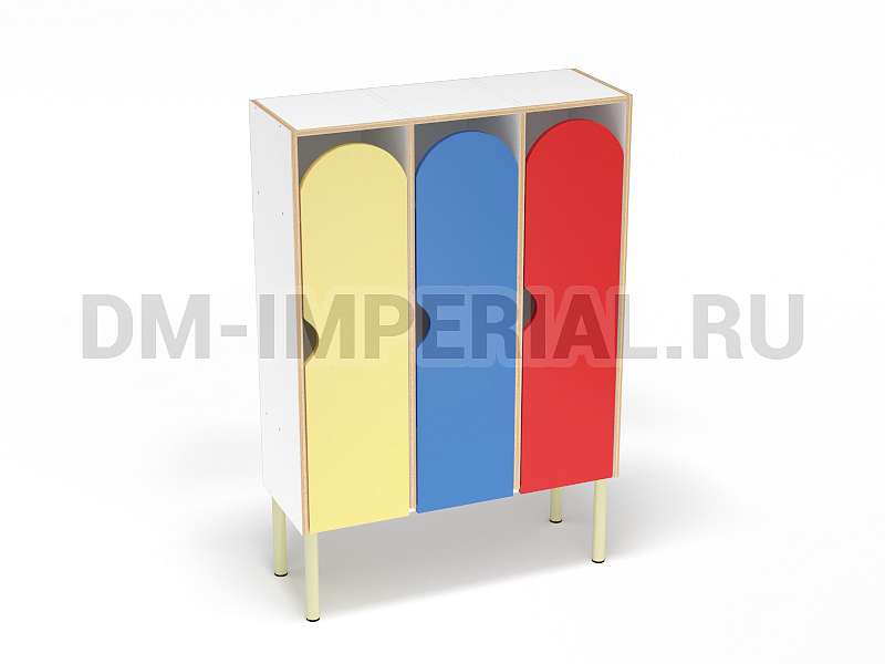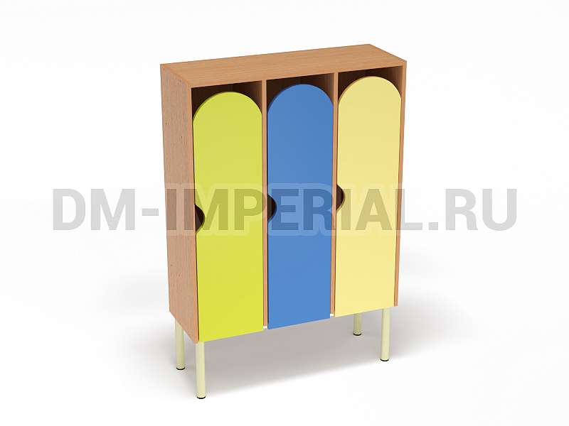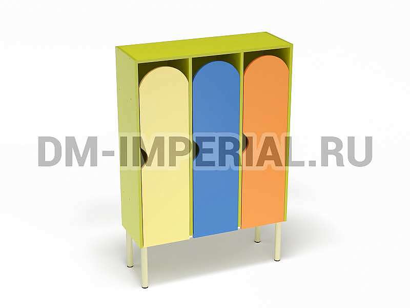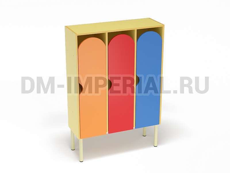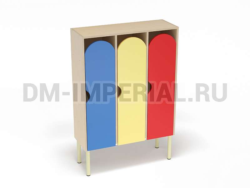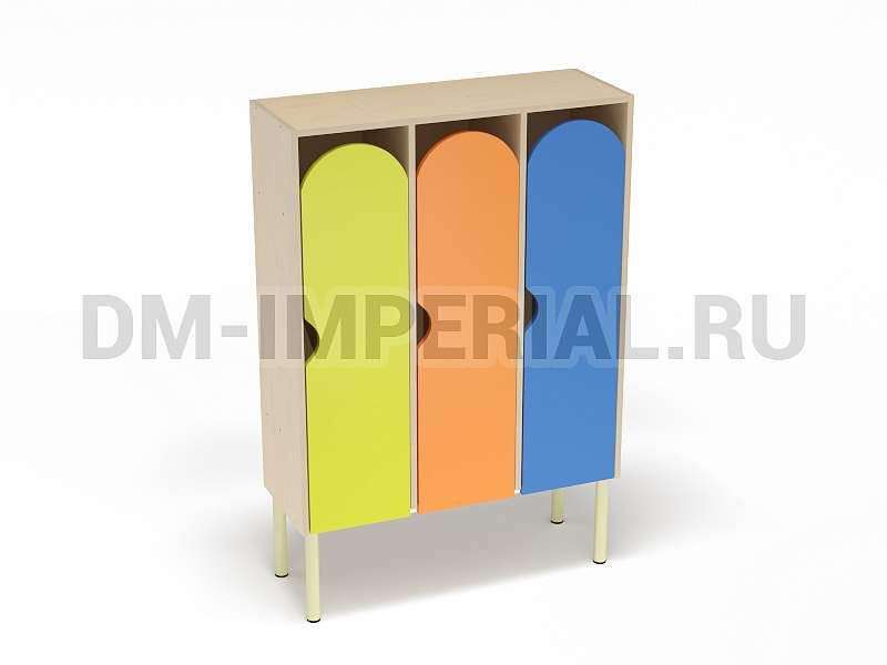 Шкаф трехсекционный детский выпускается в рамках серии модульной мебели для оснащения детских учебно-развлекательных заведений. Оснащается тремя отделениями для хранения вещей, что позволяет им пользоваться одновременно трем детям. В отличие от других трехсекционных моделей оснащается укрепленным металлическим каркасом и устанавливается на ножки. Шкаф находится на достаточно большом расстоянии от пола, что допускает использование пространства внизу для размещения чего-либо. Например, детских вещей или лавочек для переодевания.