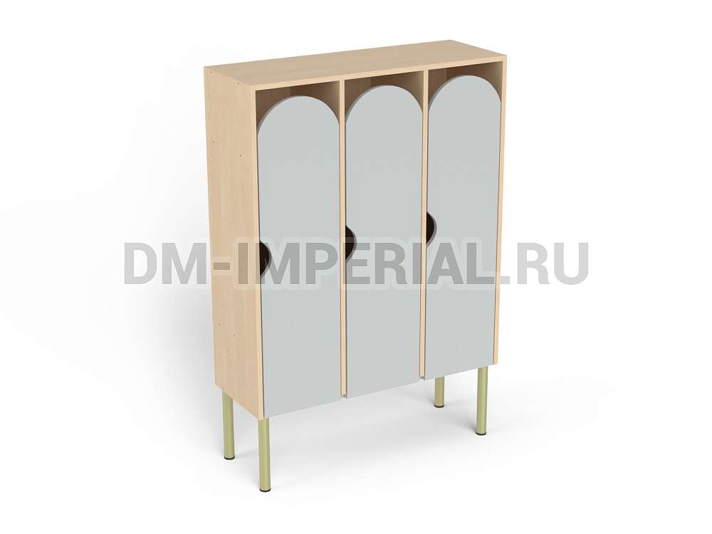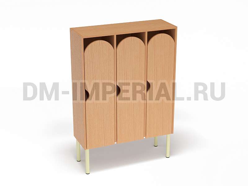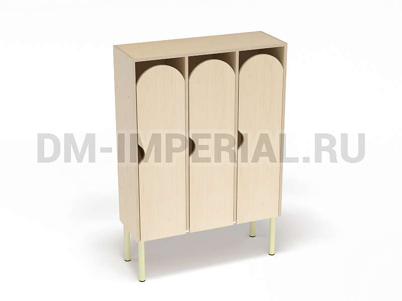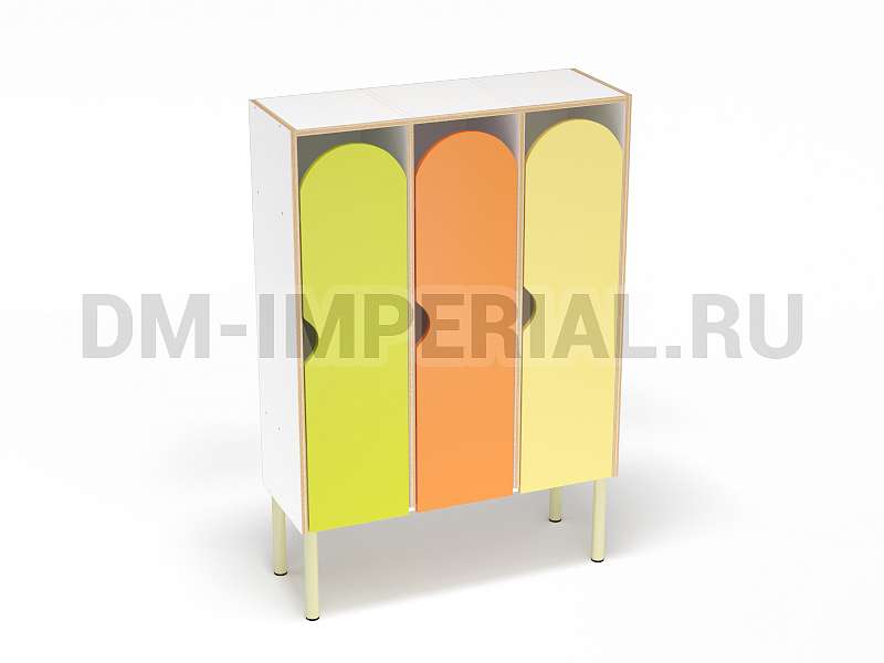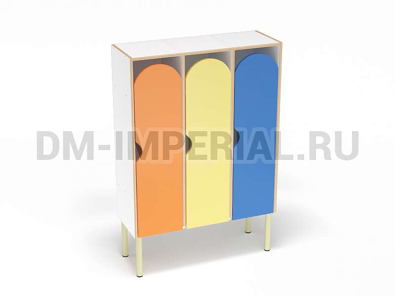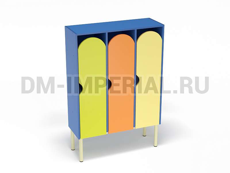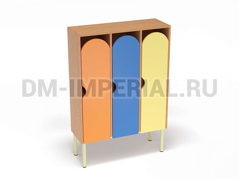 Шкаф трехсекционный детский выпускается в рамках серии модульной мебели для оснащения детских учебно-развлекательных заведений. Оснащается тремя отделениями для хранения вещей, что позволяет им пользоваться одновременно трем детям. В отличие от других трехсекционных моделей оснащается укрепленным металлическим каркасом и устанавливается на ножки. Шкаф находится на достаточно большом расстоянии от пола, что допускает использование пространства внизу для размещения чего-либо. Например, детских вещей или лавочек для переодевания.