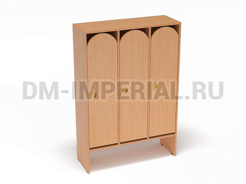 Конструкция шкафчика включает в себя три личные ниши для хранения одежды и сумок, располагающиеся на устойчивых опорах. Пространство внизу можно использовать для обуви, спортинвентаря и прочих предметов. Шкаф изготавливается в размере 900х320х1320 мм. Этого вполне достаточно, чтобы вместить все необходимое количество вещей, включая объемную зимнюю одежду и обувь.