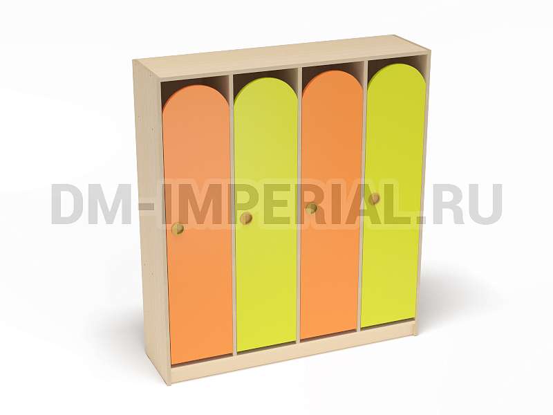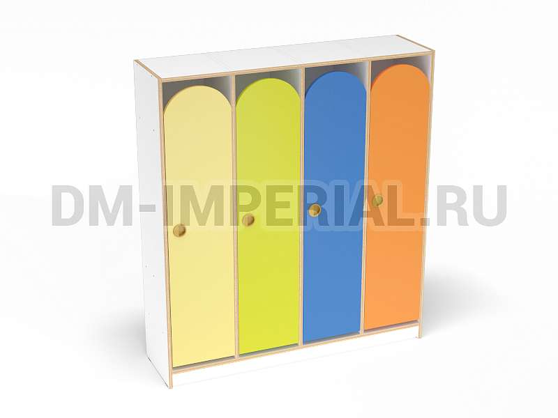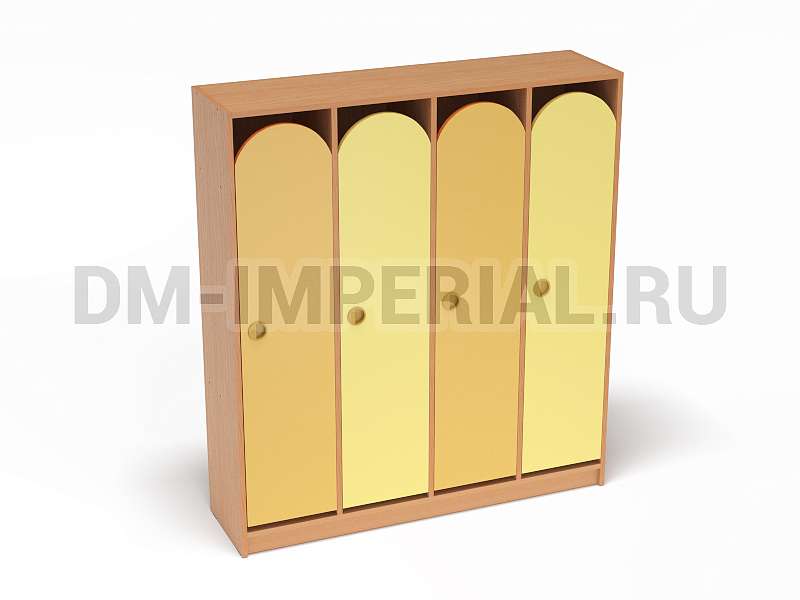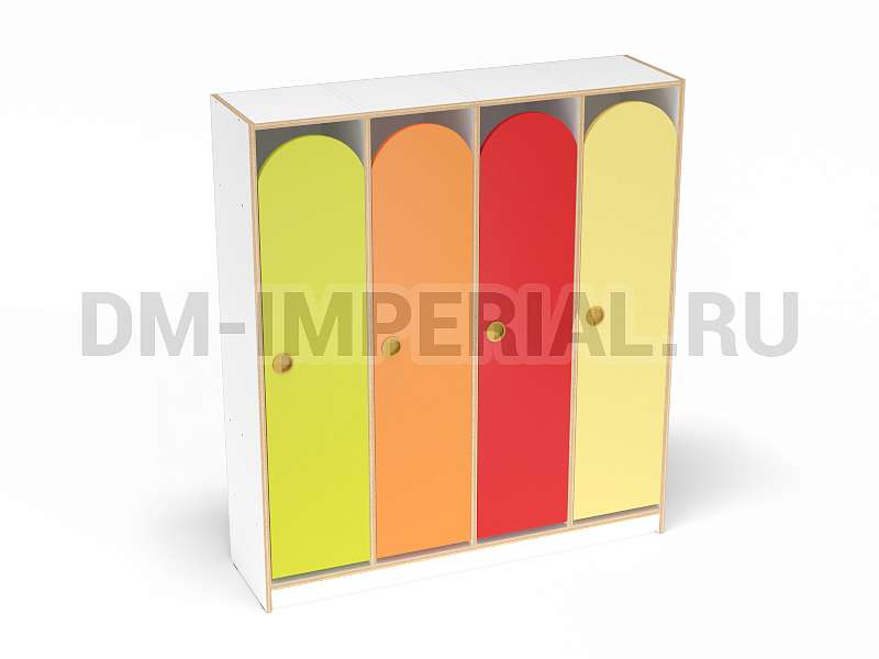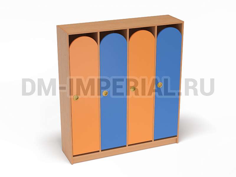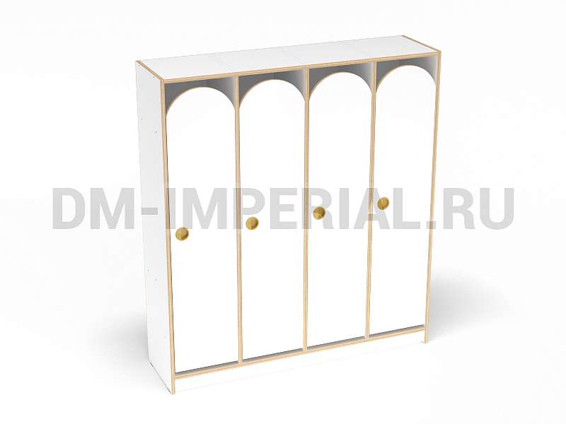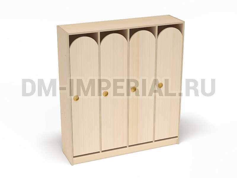 Данный шкаф оснащается сразу четырьмя секциями для хранения одежды. Устанавливается на цоколь. Каждая секция закрывается дверцей с удобной круглой ручкой. Двери обладают полукруглой формой. При закрывании в верхней части образуется вентиляционное отверстие, позволяющее воздуху нормально циркулировать. Такая особенность конструкции создает внутри шкафа нормальный микроклимат, препятствует скапливанию излишней влаги, не дает распространяться плесени. Актуально на осенне-зимний сезон.