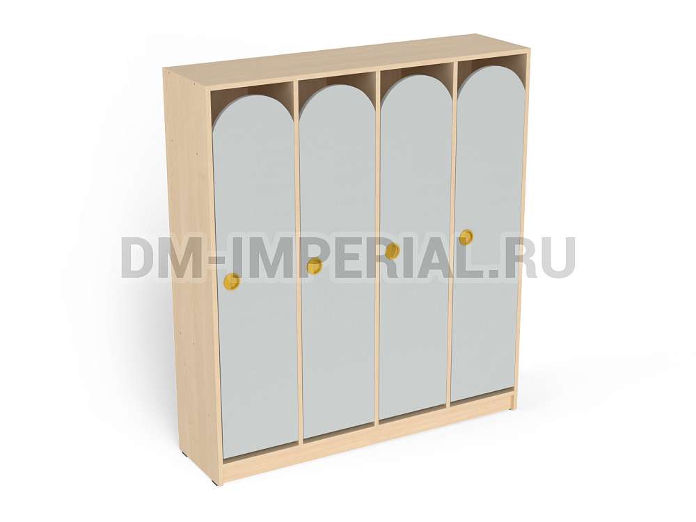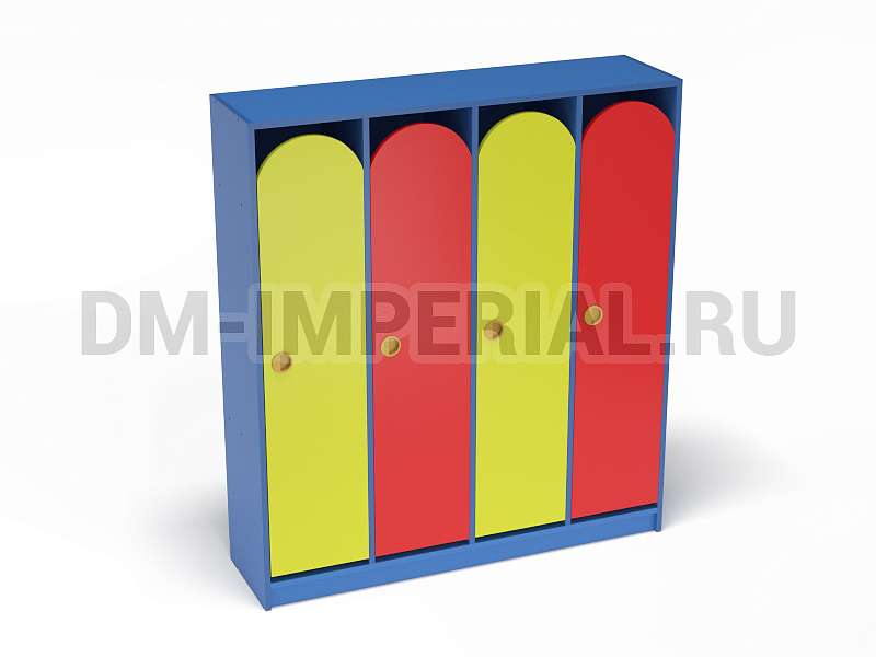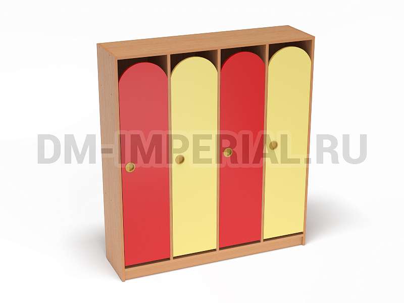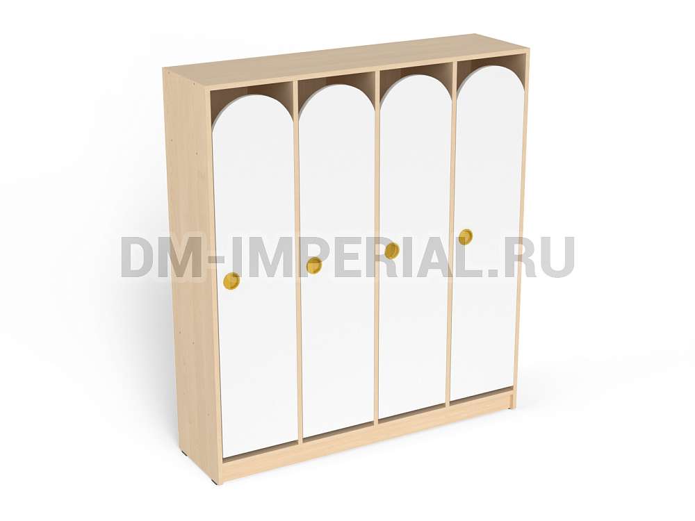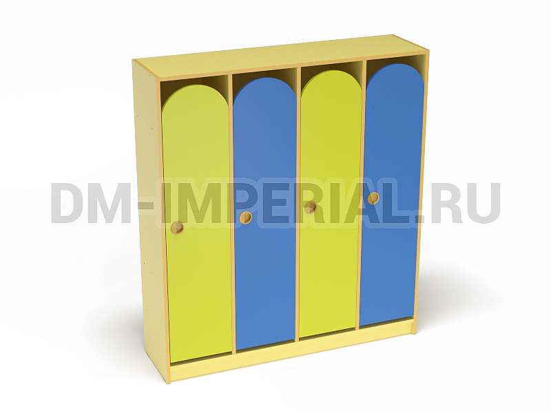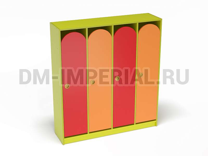 Данный шкаф оснащается сразу четырьмя секциями для хранения одежды. Устанавливается на цоколь. Каждая секция закрывается дверцей с удобной круглой ручкой. Двери обладают полукруглой формой. При закрывании в верхней части образуется вентиляционное отверстие, позволяющее воздуху нормально циркулировать. Такая особенность конструкции создает внутри шкафа нормальный микроклимат, препятствует скапливанию излишней влаги, не дает распространяться плесени. Актуально на осенне-зимний сезон.