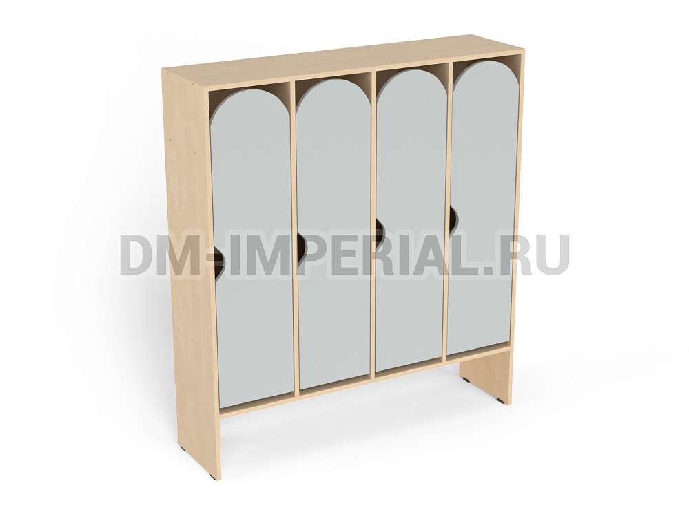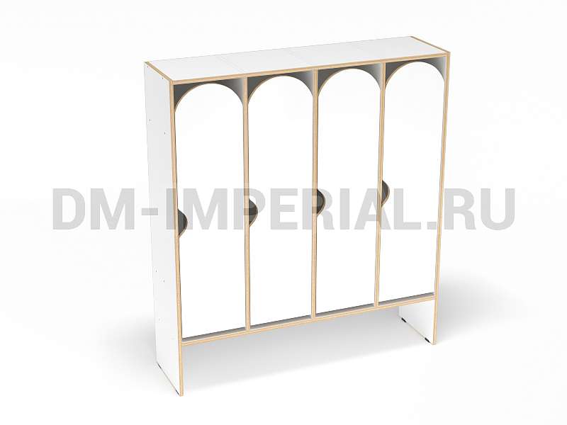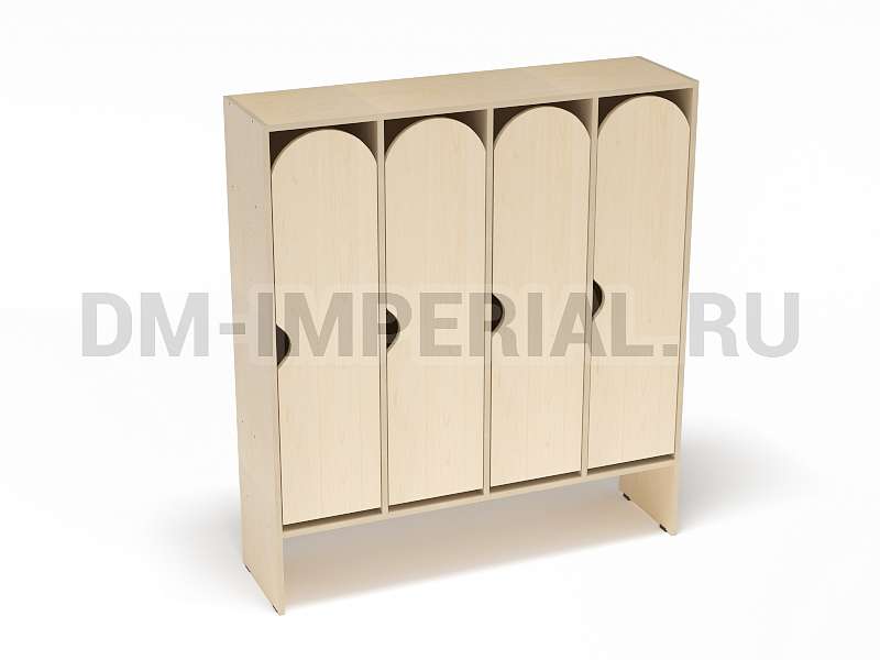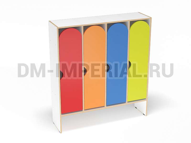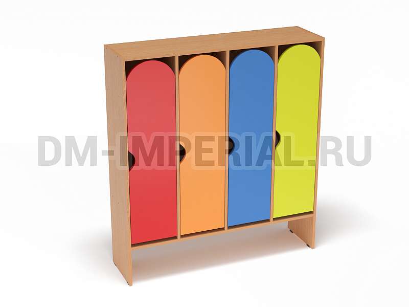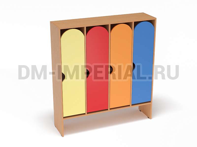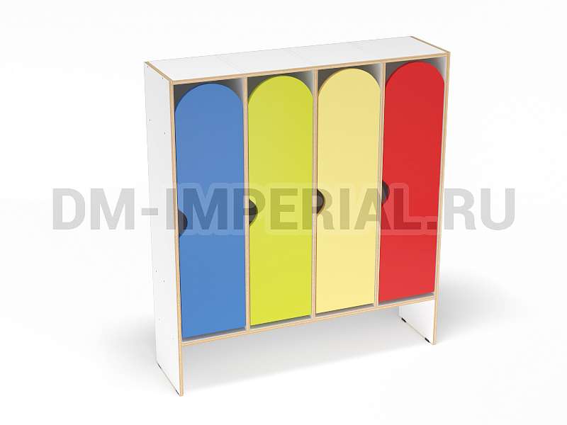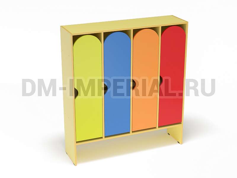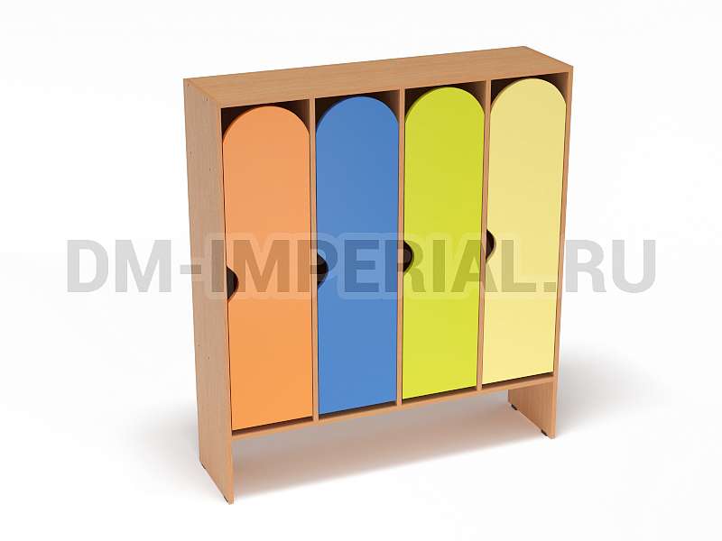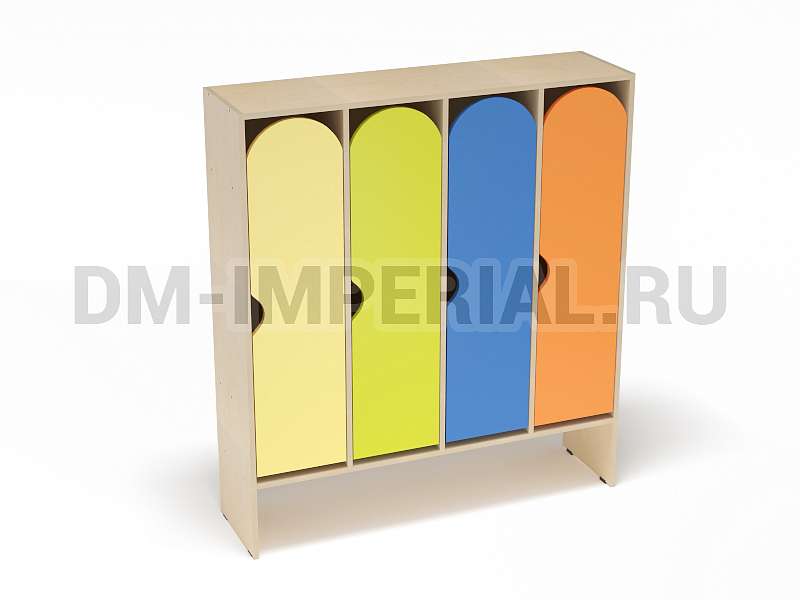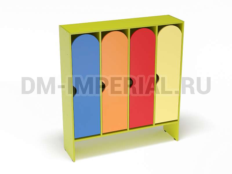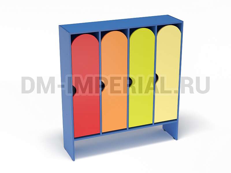 Предлагаем вариант оснащения детской раздевалки данными моделями шкафчиков. Конструкция рассчитана на использование одновременно четырьмя детьми. Для каждого ребенка предусмотрена собственная секция для хранения одежды и личных вещей. Отделы шкафа закрываются дверцами с полукруглыми ручками. В нижней части предусмотрено свободное пространство, которое можно использовать для размещения уличной обуви, объемных сумок, спортинвентаря и т.д.