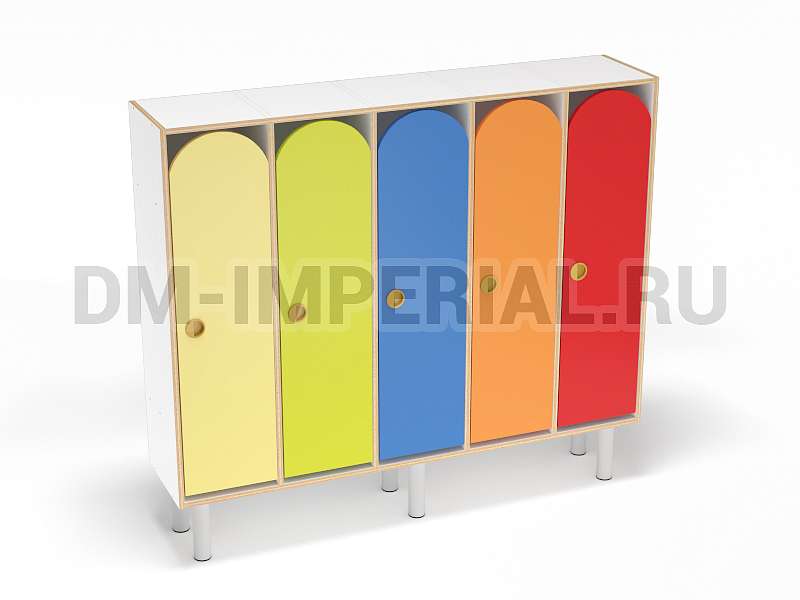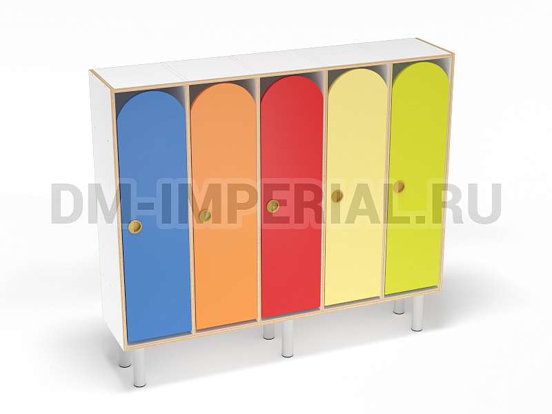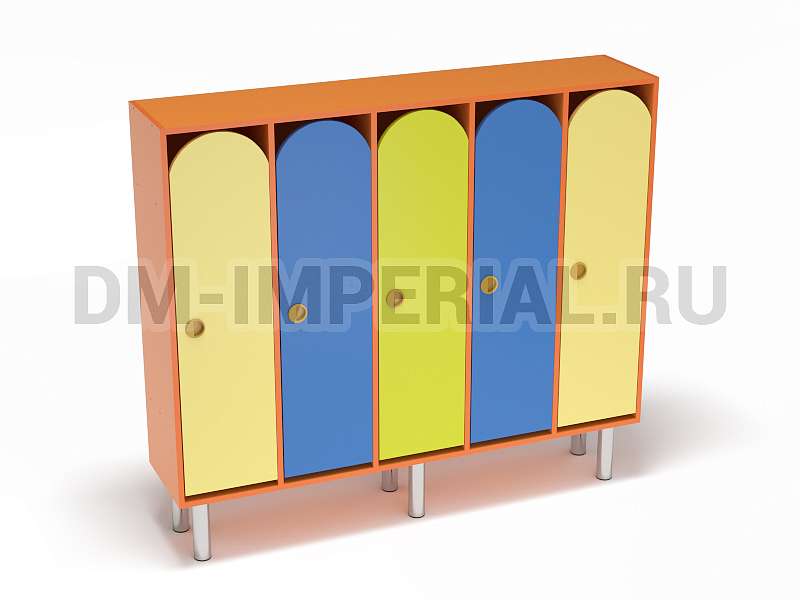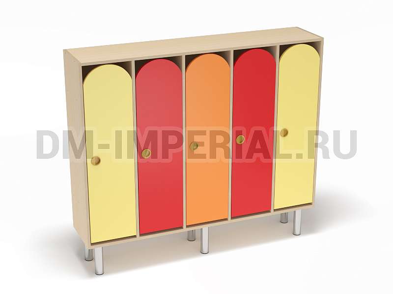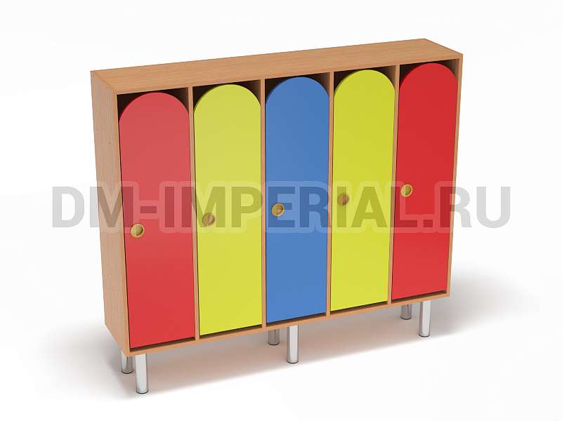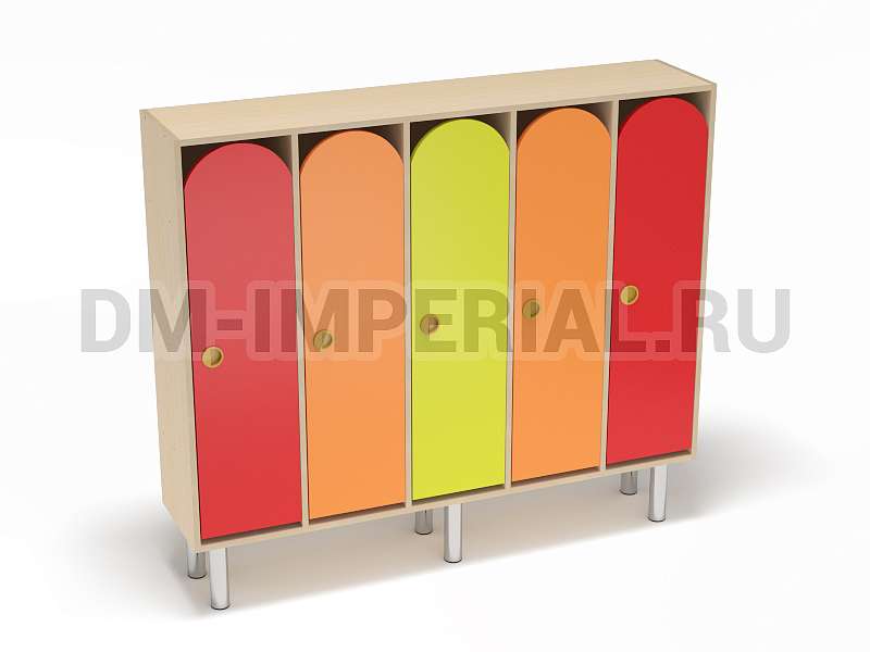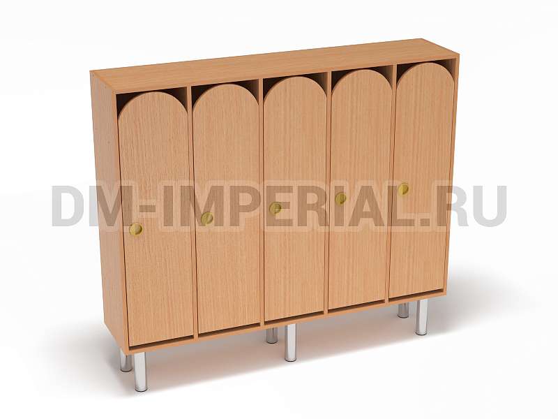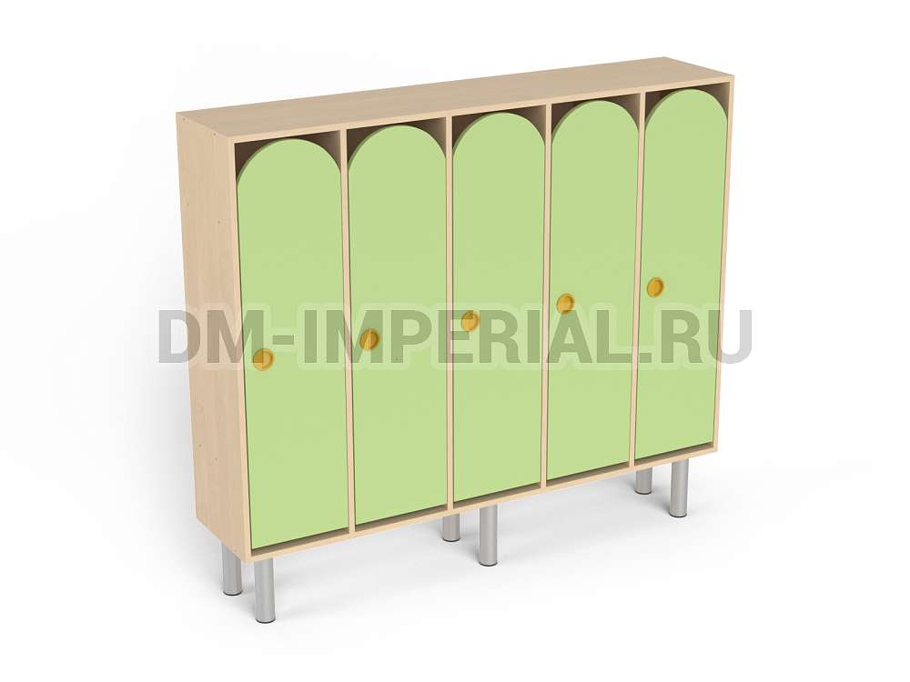 Данный шкаф выпускается в рамках детской мебели для оснащения раздевалок и является самым большим в линейке моделей с ножками. Габариты конструкции - 1490*320*1320 мм. Шкаф оснащается пятью секциями и предназначен, соответственно, для пользования одновременно пятью детьми. Для каждого ребенка предусмотрен свой, индивидуальный шкафчик с закрывающейся дверцей. Внутри есть все необходимое для аккуратного размещения личных вещей.