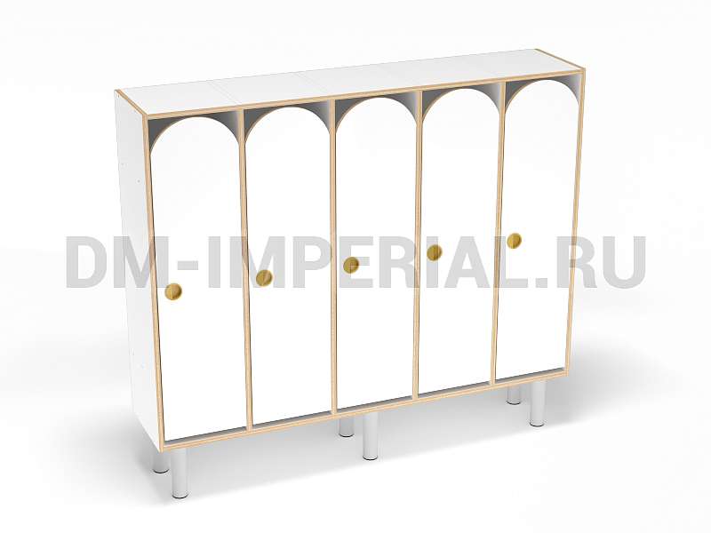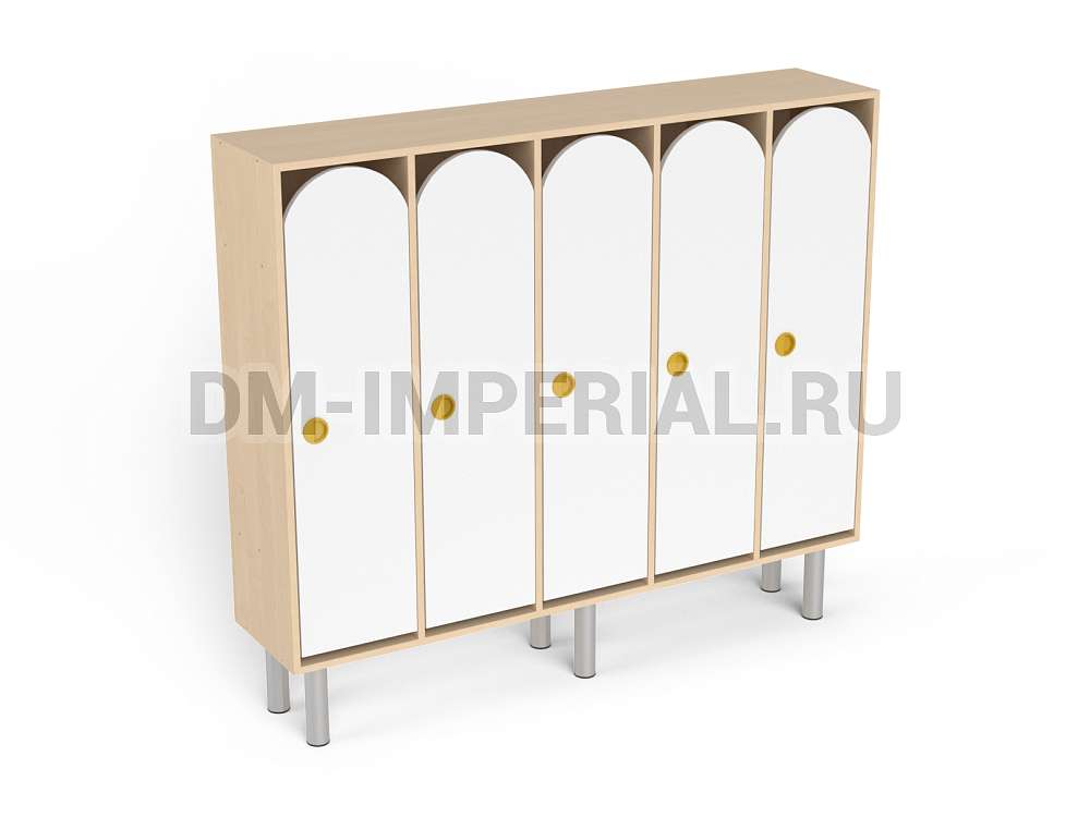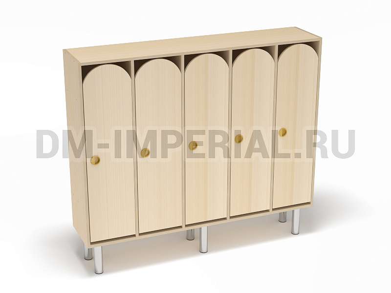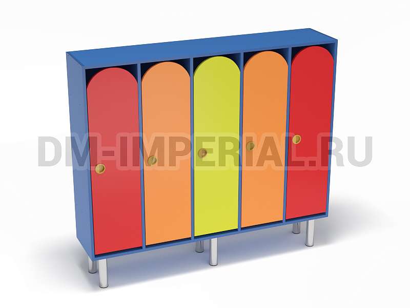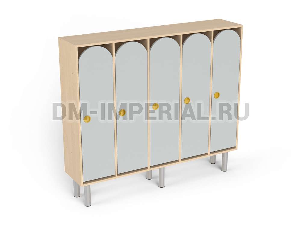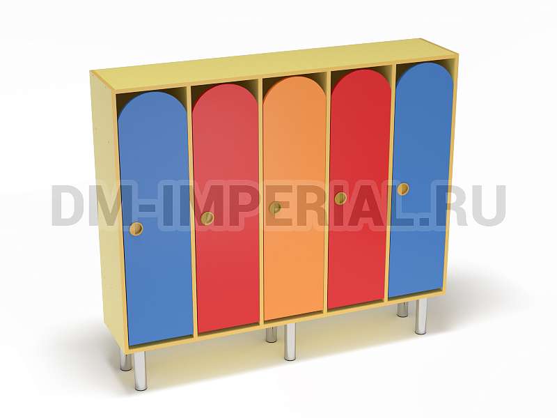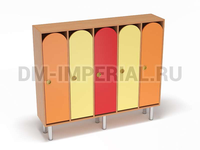 Данный шкаф выпускается в рамках детской мебели для оснащения раздевалок и является самым большим в линейке моделей с ножками. Габариты конструкции - 1490*320*1320 мм. Шкаф оснащается пятью секциями и предназначен, соответственно, для пользования одновременно пятью детьми. Для каждого ребенка предусмотрен свой, индивидуальный шкафчик с закрывающейся дверцей. Внутри есть все необходимое для аккуратного размещения личных вещей.