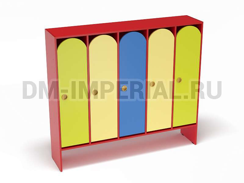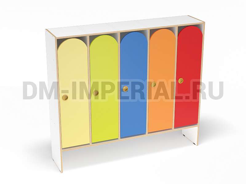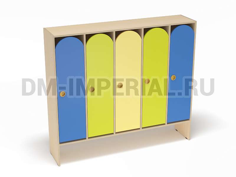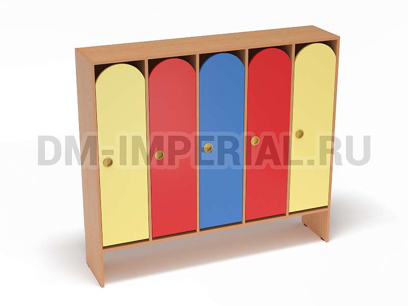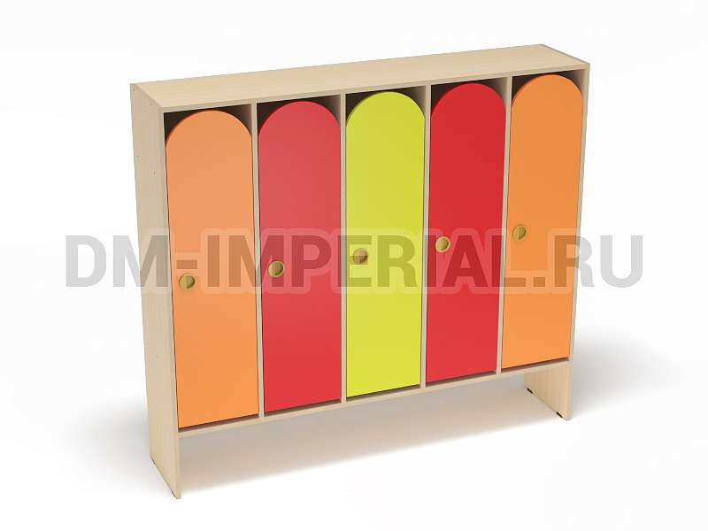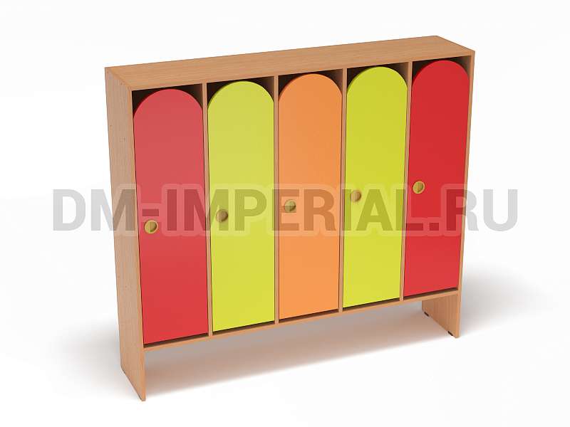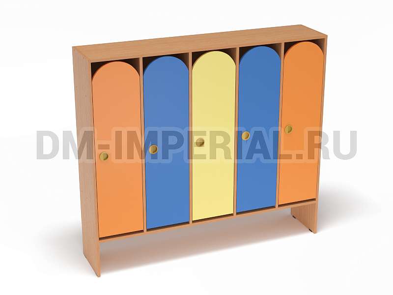 Данный шкаф состоит из пяти секций и рассчитан на одновременное пользование сразу пятью ребятишками. Конструкция шкафа классическая: вместительные ниши для хранения одежды закрываются дверцами с круглой, удобной ручкой. Дверь прилегает не плотно, оставляя зазоры для циркуляции воздуха. Попадающая внутрь влага испаряется, не оказывая разрушительного воздействия на поверхность мебели.