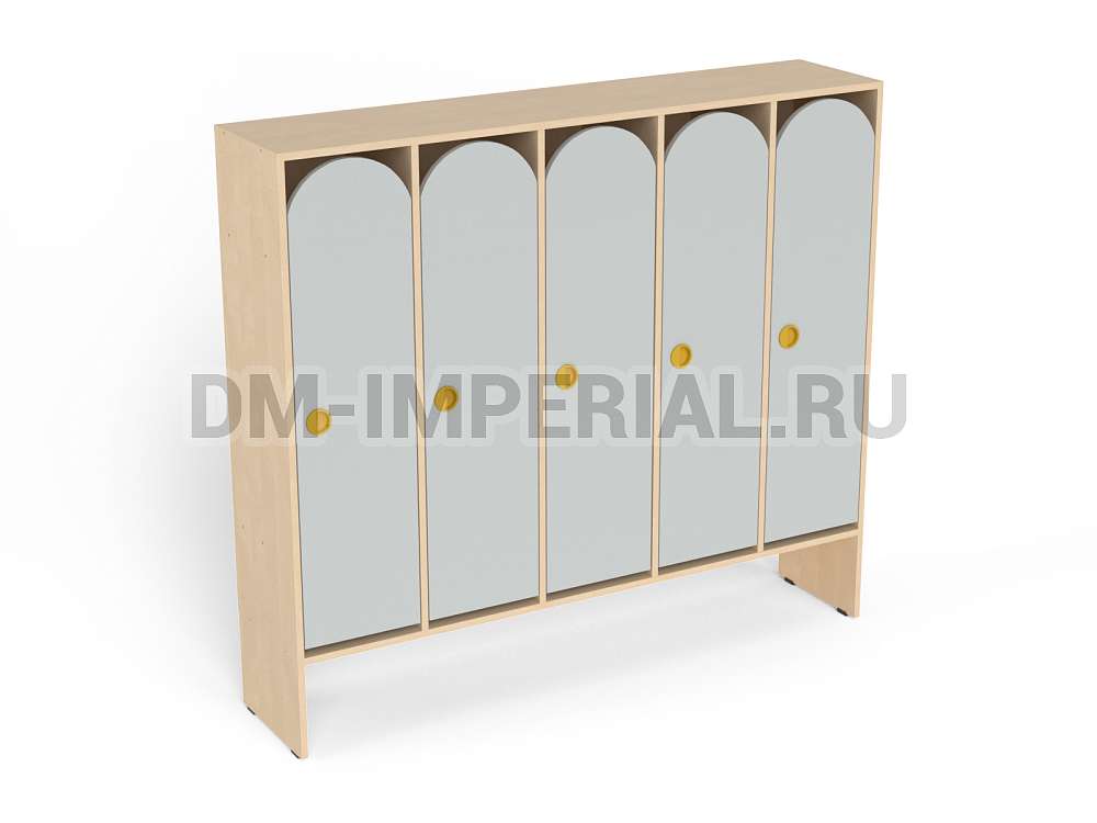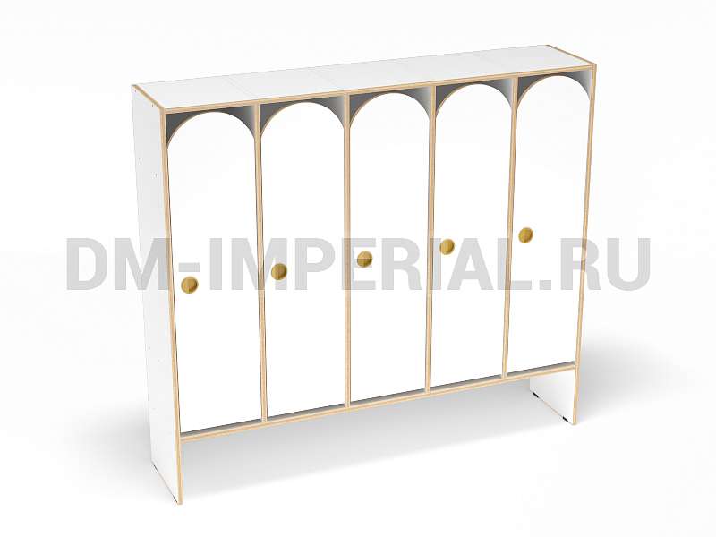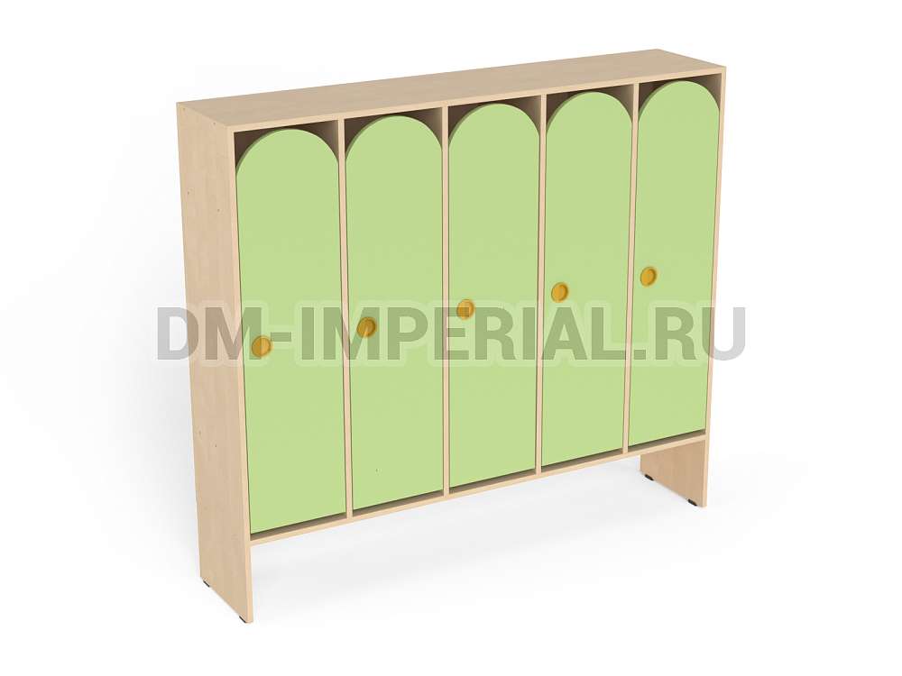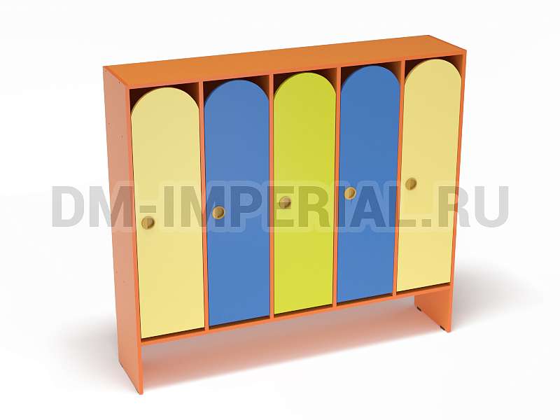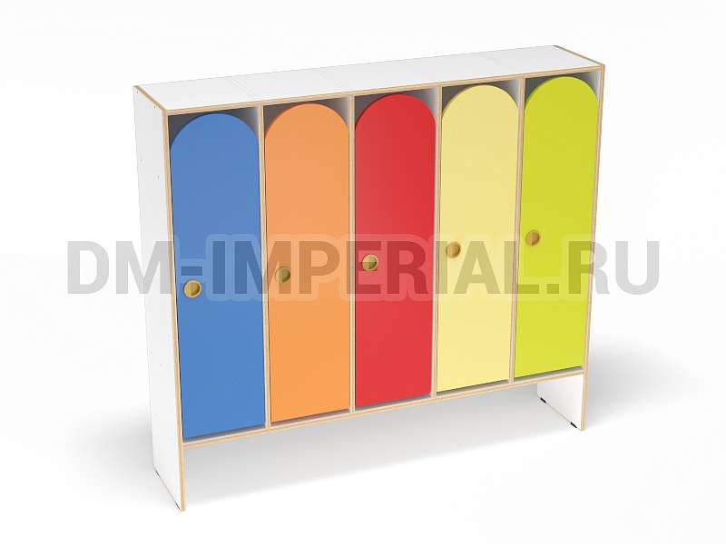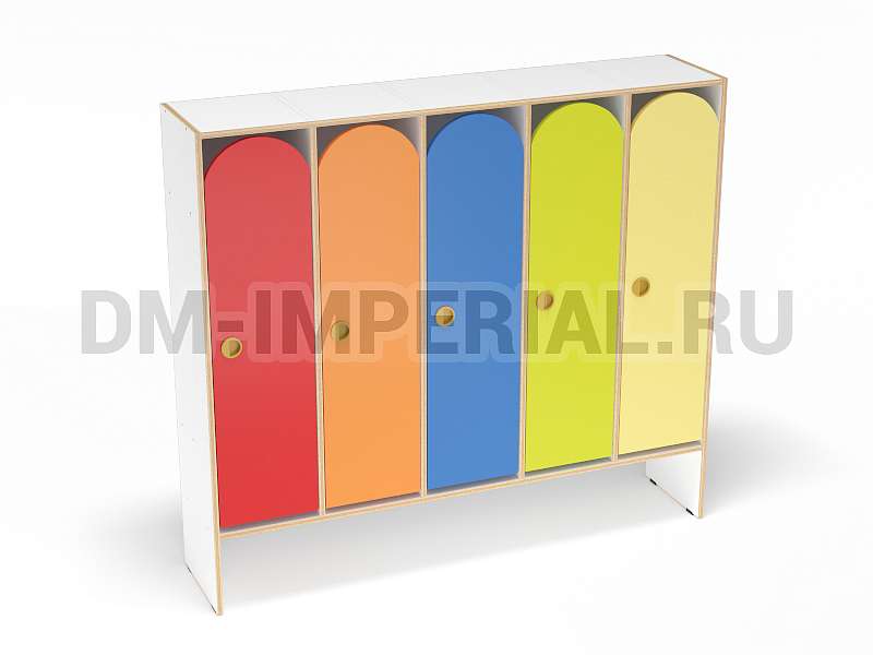 Данный шкаф состоит из пяти секций и рассчитан на одновременное пользование сразу пятью ребятишками. Конструкция шкафа классическая: вместительные ниши для хранения одежды закрываются дверцами с круглой, удобной ручкой. Дверь прилегает не плотно, оставляя зазоры для циркуляции воздуха. Попадающая внутрь влага испаряется, не оказывая разрушительного воздействия на поверхность мебели.