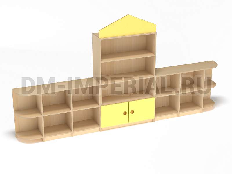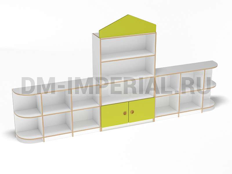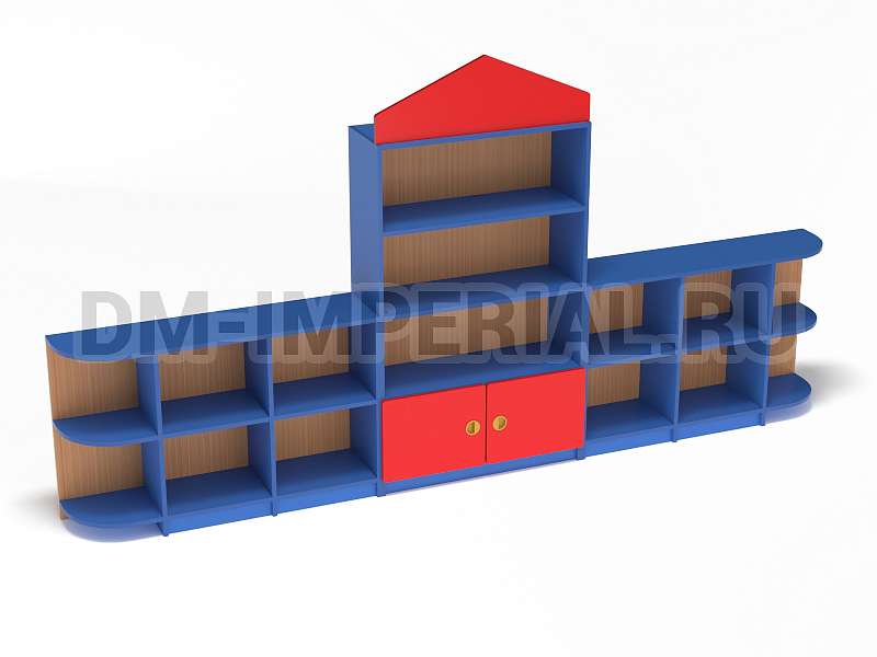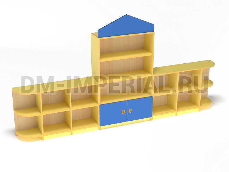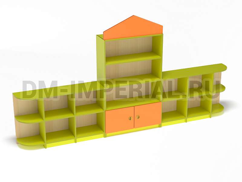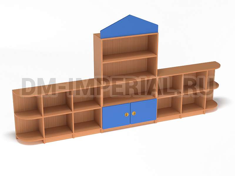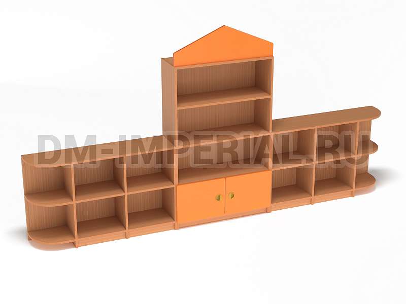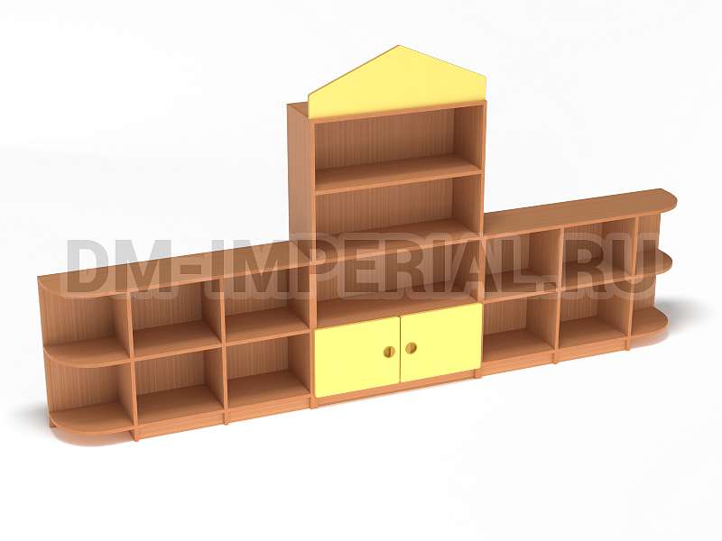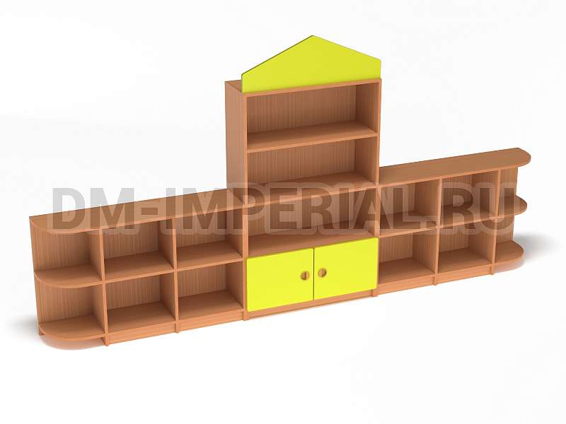 Данный детский стеллаж представляет собой достаточно массивную конструкцию, поэтому подойдет для просторных помещений. Очень вместителен. Оснащается преимущественно открытыми системами хранения. В нижней части есть два закрытых шкафчика. Габариты модели - 3000*300*1570 мм. Глубины полок вполне достаточно для размещения учебников, книжек, игрушек и прочих необходимых детям и воспитателям предметов. Также стеллаж подойдет для создания выставочного уголка, где можно красиво разместить рисунки и поделки малышей.