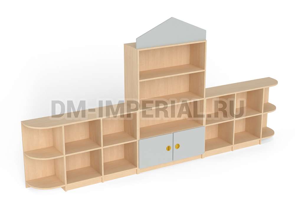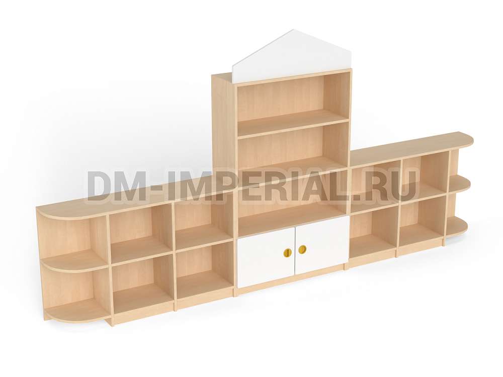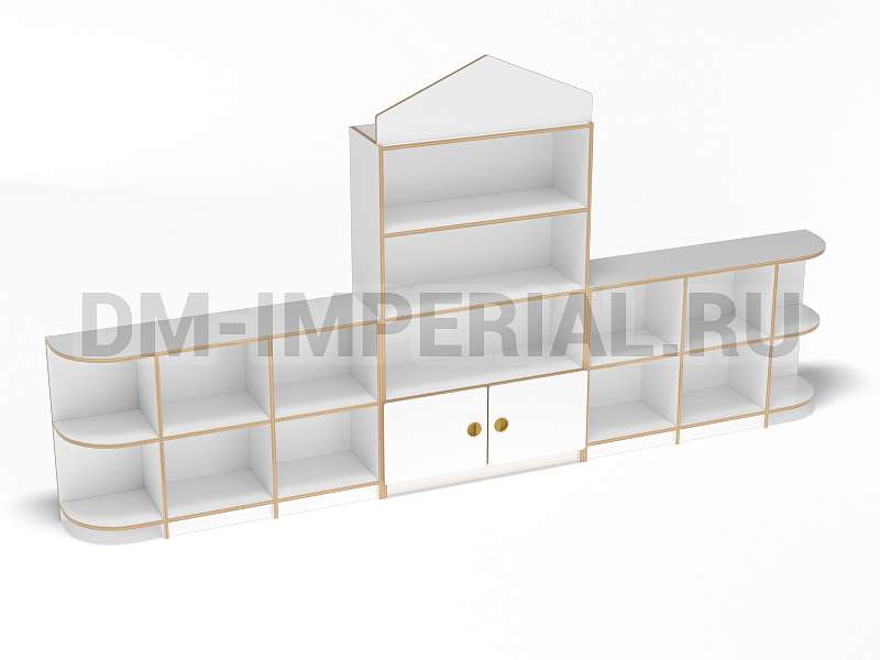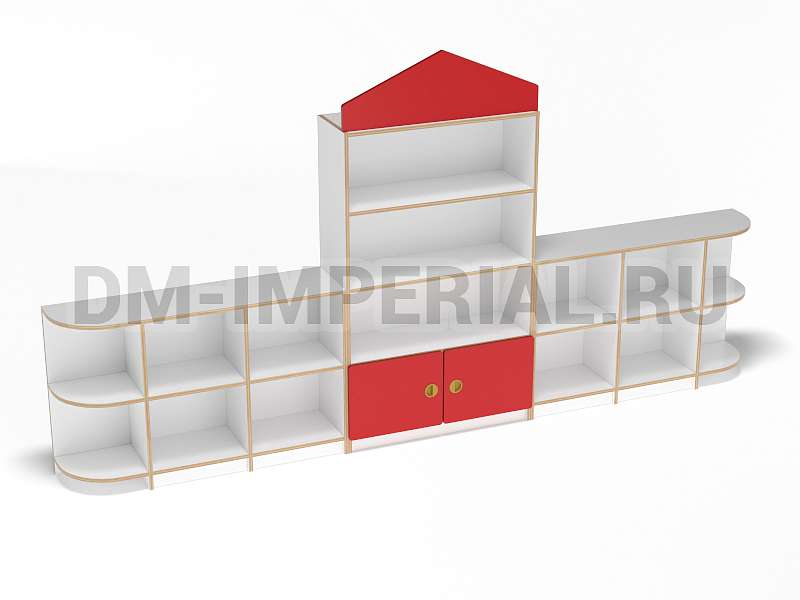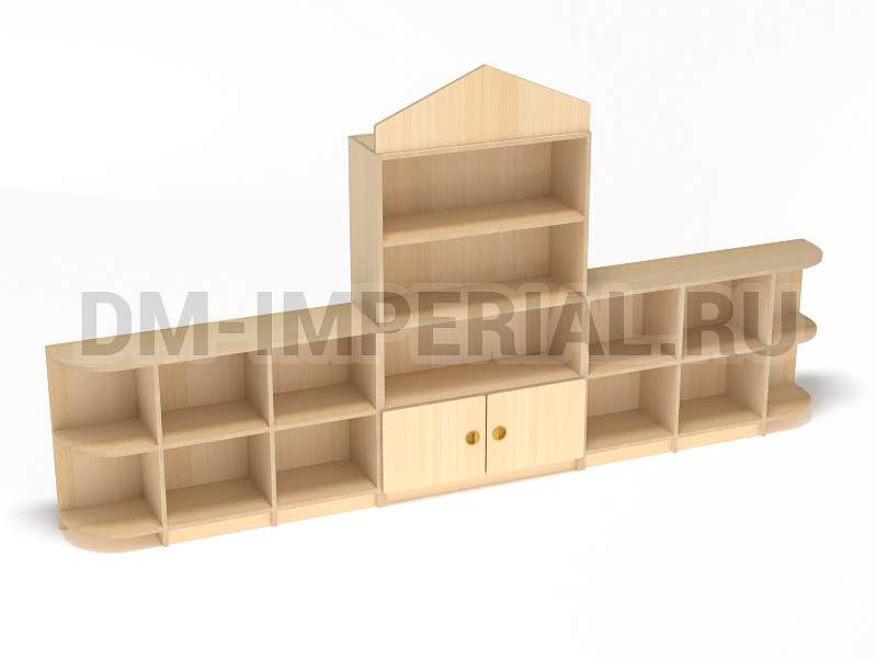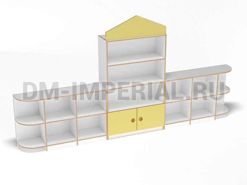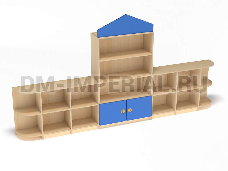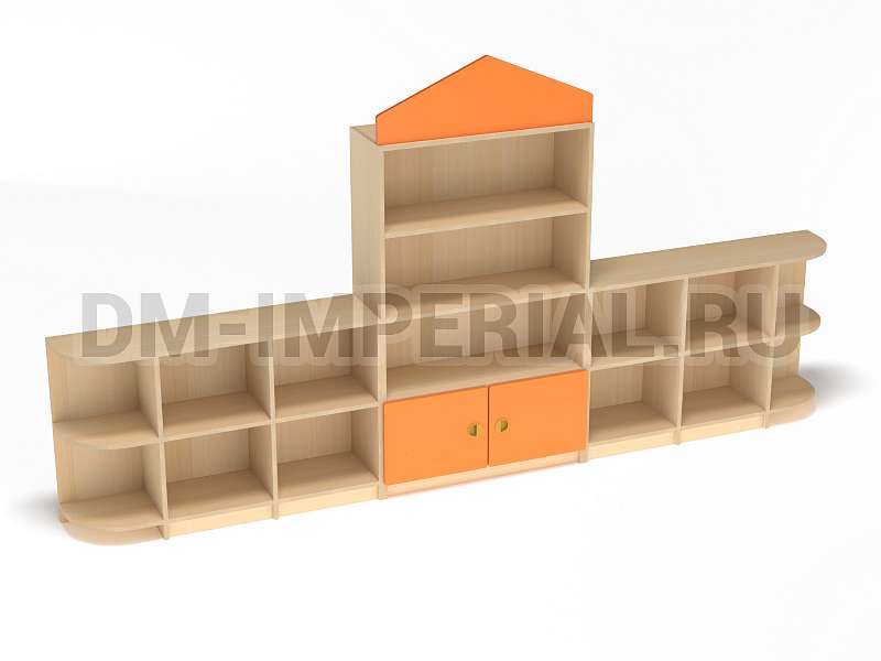 Данный детский стеллаж представляет собой достаточно массивную конструкцию, поэтому подойдет для просторных помещений. Очень вместителен. Оснащается преимущественно открытыми системами хранения. В нижней части есть два закрытых шкафчика. Габариты модели - 3000*300*1570 мм. Глубины полок вполне достаточно для размещения учебников, книжек, игрушек и прочих необходимых детям и воспитателям предметов. Также стеллаж подойдет для создания выставочного уголка, где можно красиво разместить рисунки и поделки малышей.