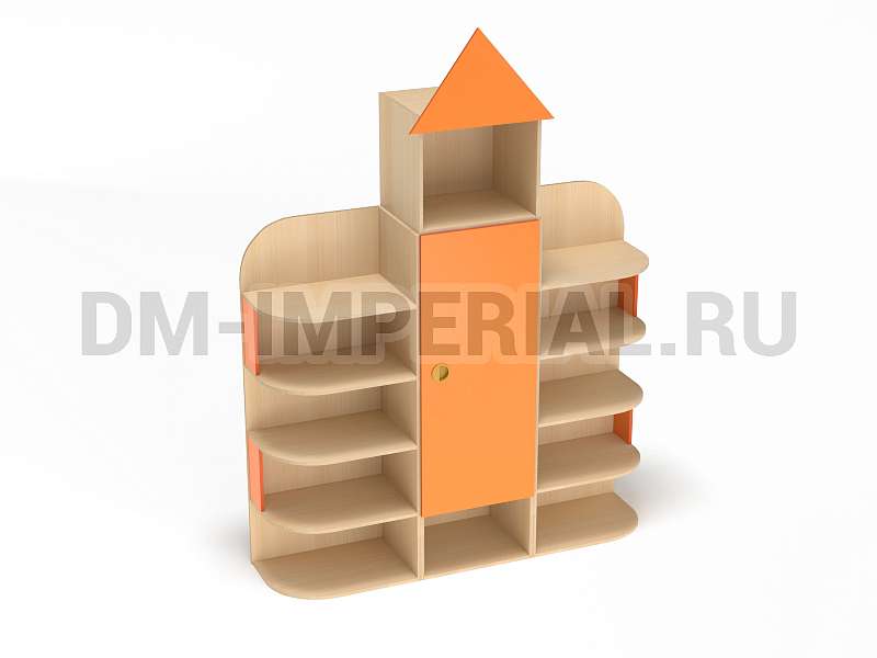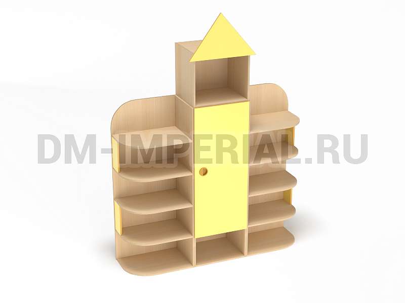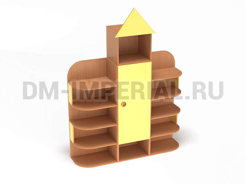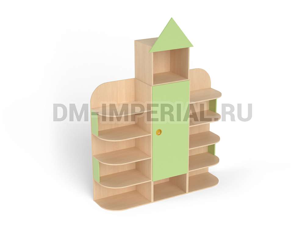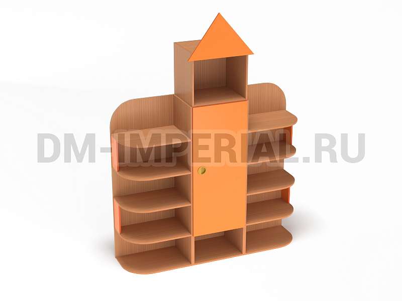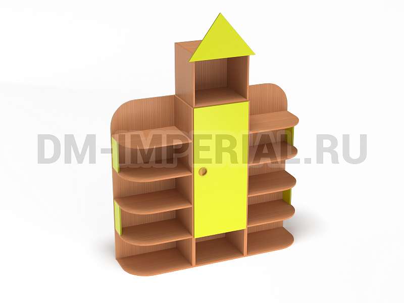 Форма, представленного на данной странице стеллажа, напоминает домик. Верхняя часть оригинально украшена «крышей», что придает конструкции забавный и интересный вид. Сделать дизайн шкафа еще более оригинальным можно с помощью различных окрашиваний. Мы предлагаем ознакомиться с палитрой цветов. В ней можно выделить оттенки под натуральное дерево (бук, дуб), а также необычные, насыщенные оттенки, например, лимонный или ярко-красный.