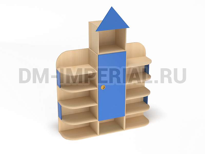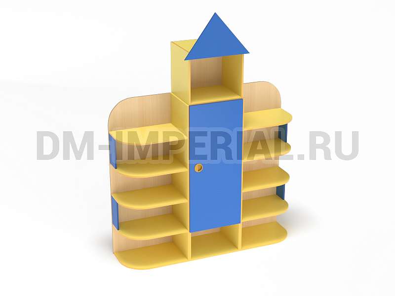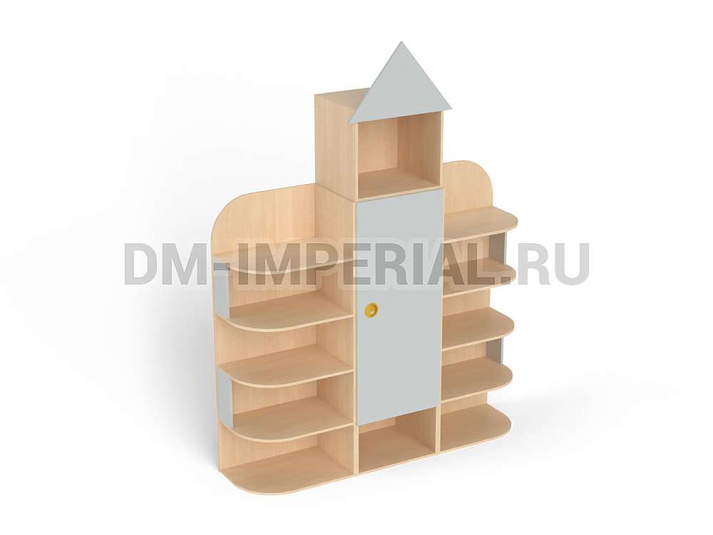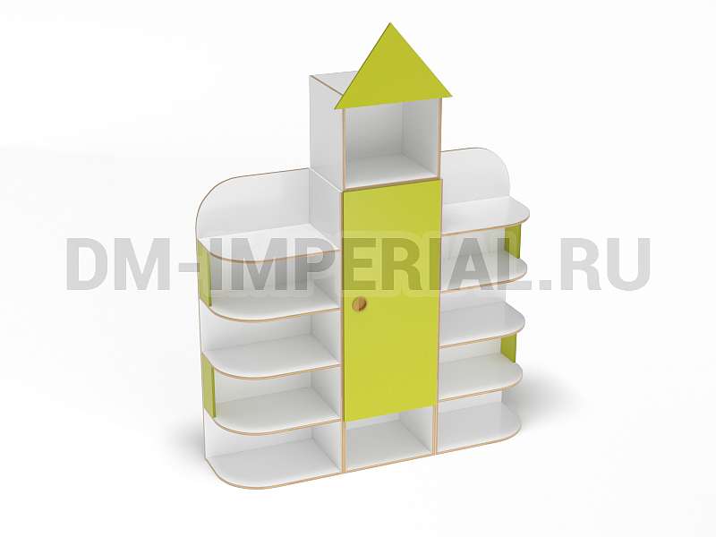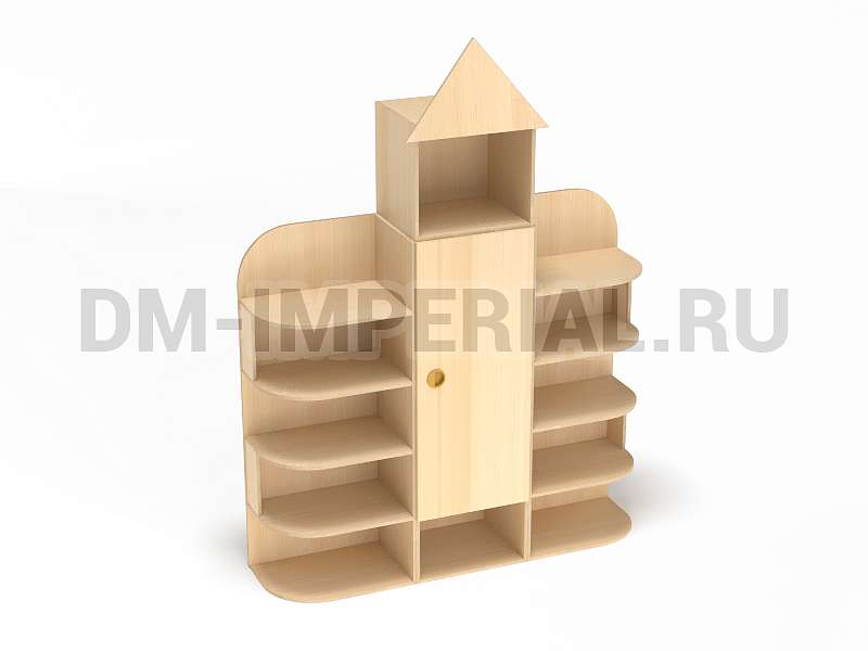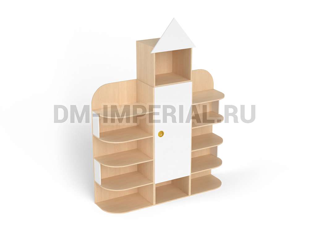 Форма, представленного на данной странице стеллажа, напоминает домик. Верхняя часть оригинально украшена «крышей», что придает конструкции забавный и интересный вид. Сделать дизайн шкафа еще более оригинальным можно с помощью различных окрашиваний. Мы предлагаем ознакомиться с палитрой цветов. В ней можно выделить оттенки под натуральное дерево (бук, дуб), а также необычные, насыщенные оттенки, например, лимонный или ярко-красный.
