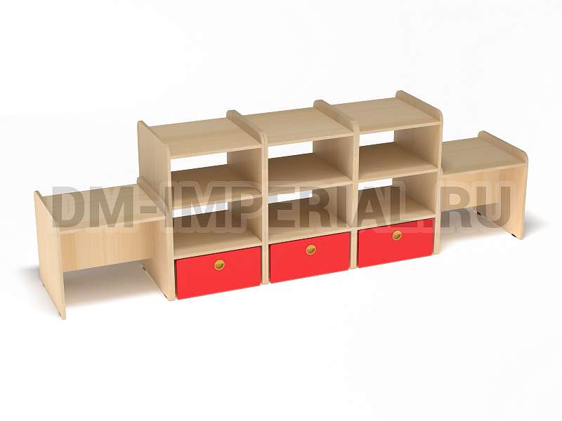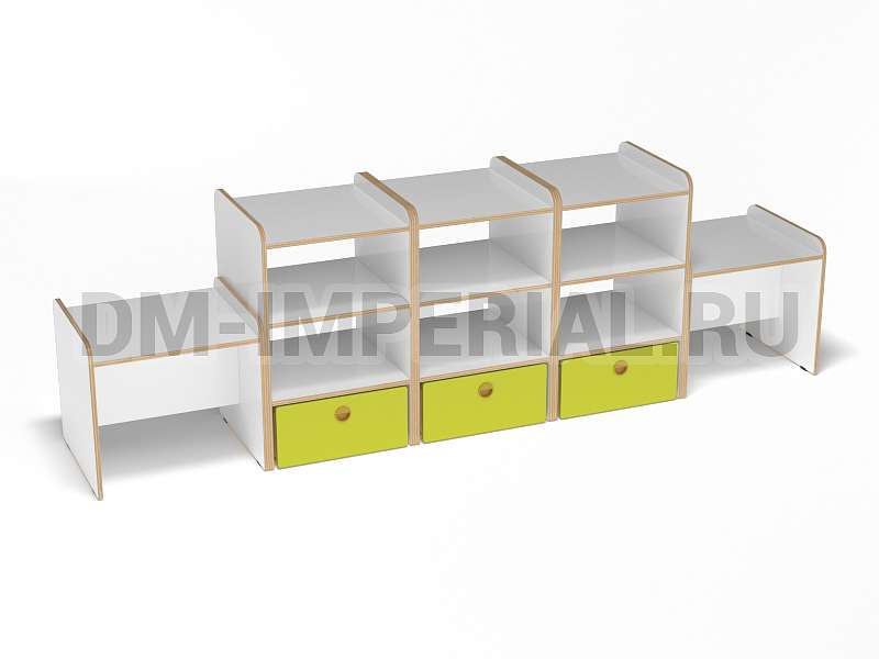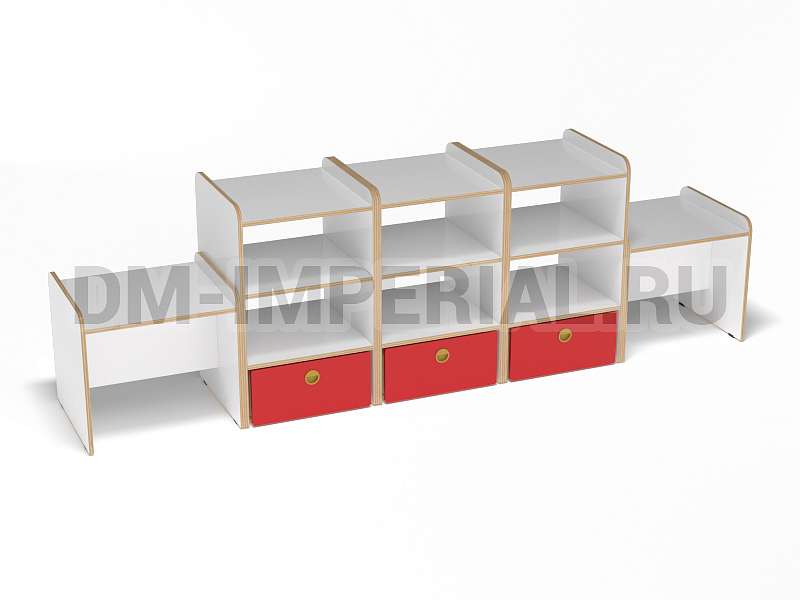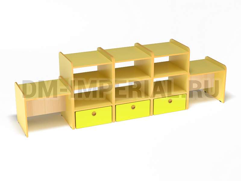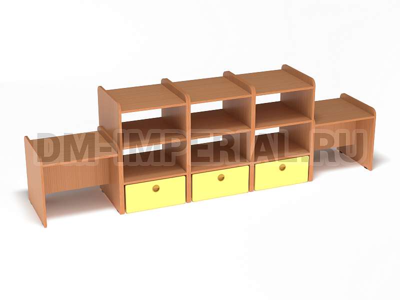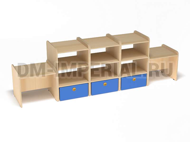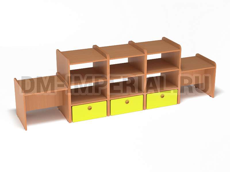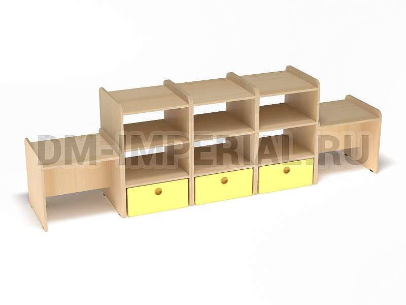 Данная модель представляет собой классическую стеллажную конструкцию, сочетающую открытые и закрытые секции хранения. В верхней части располагаются вместительные полки, в нижней – три закрытых дверцами шкафчика. По бокам располагаются дополнительные секции. Стеллаж достаточно крупный: габариты - 2600*500*800 мм. Размеры и глубина ячеек позволяют хранить внутри все необходимое для учебы, творчества и игр (учебники, художественная литература разных форматов, игрушки, спортинвентарь и т.д).