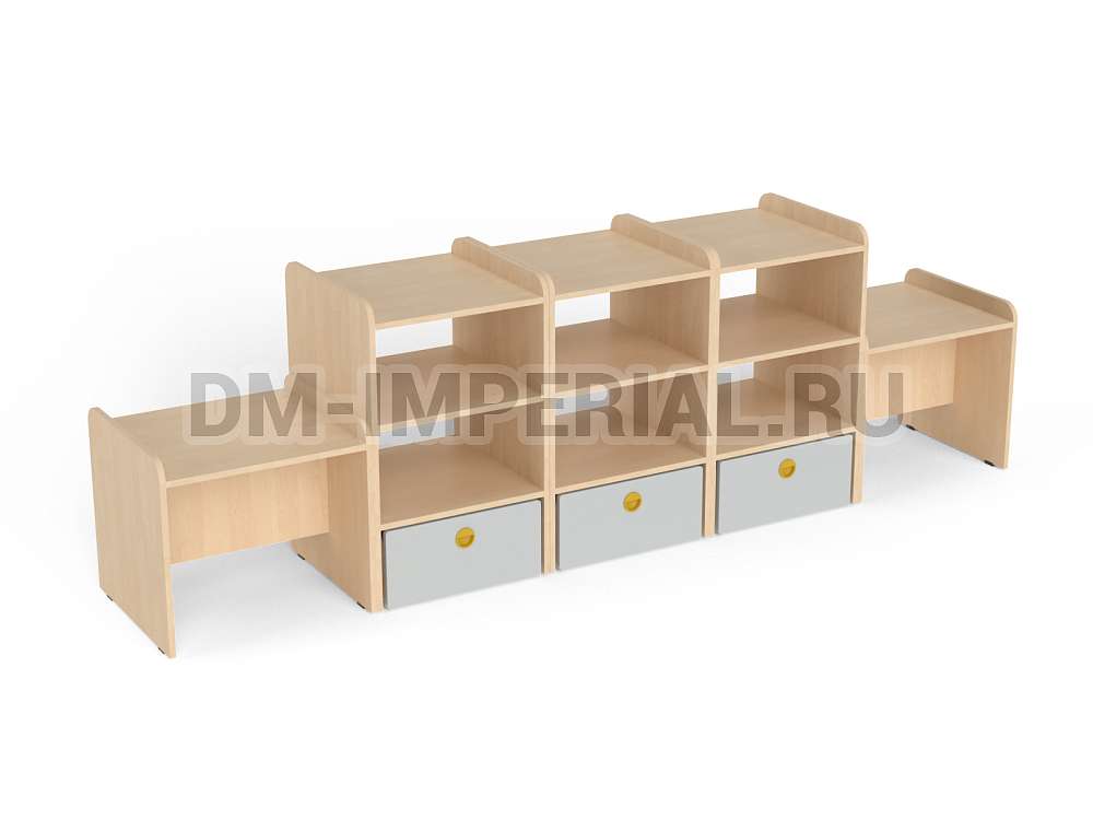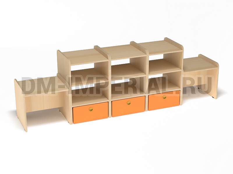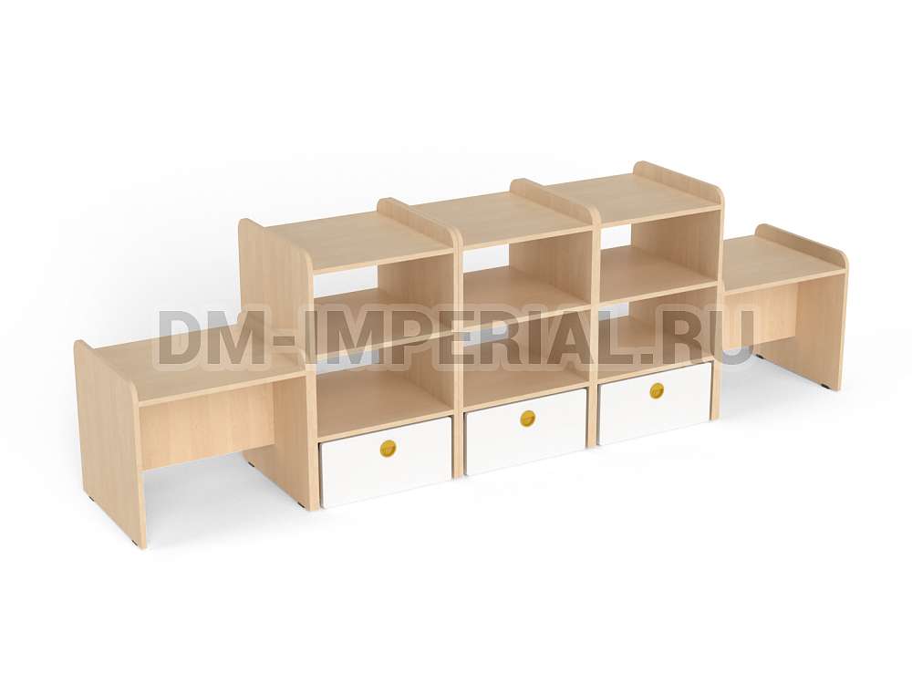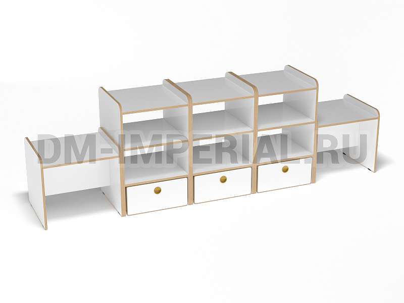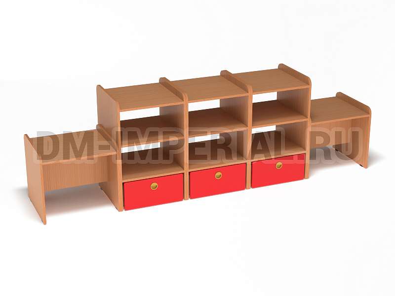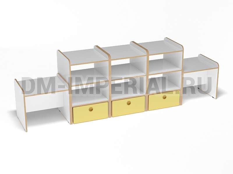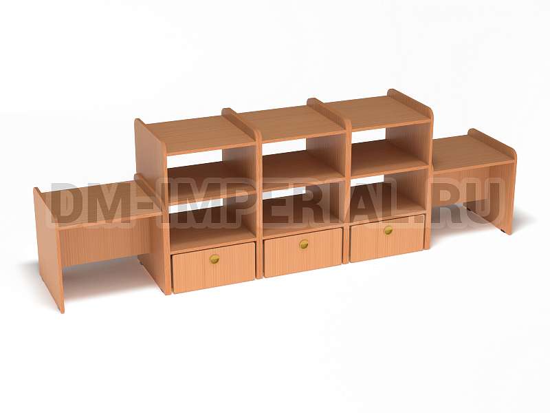 Данная модель представляет собой классическую стеллажную конструкцию, сочетающую открытые и закрытые секции хранения. В верхней части располагаются вместительные полки, в нижней – три закрытых дверцами шкафчика. По бокам располагаются дополнительные секции. Стеллаж достаточно крупный: габариты - 2600*500*800 мм. Размеры и глубина ячеек позволяют хранить внутри все необходимое для учебы, творчества и игр (учебники, художественная литература разных форматов, игрушки, спортинвентарь и т.д).