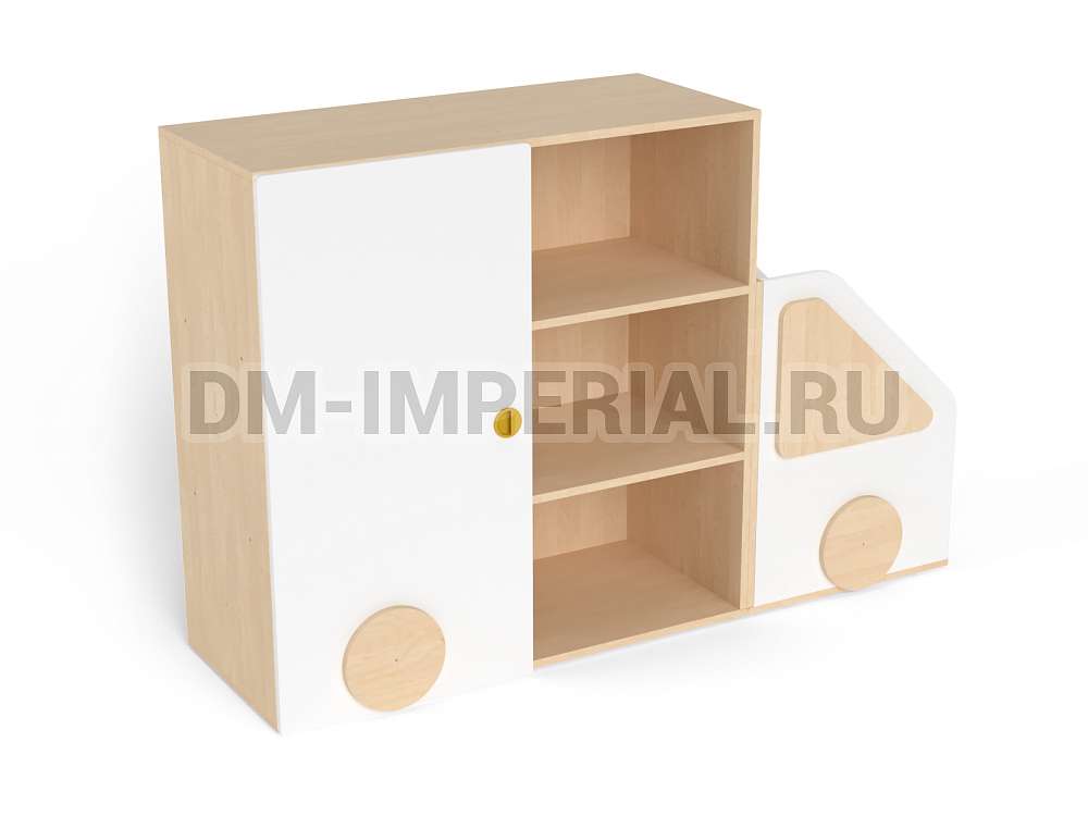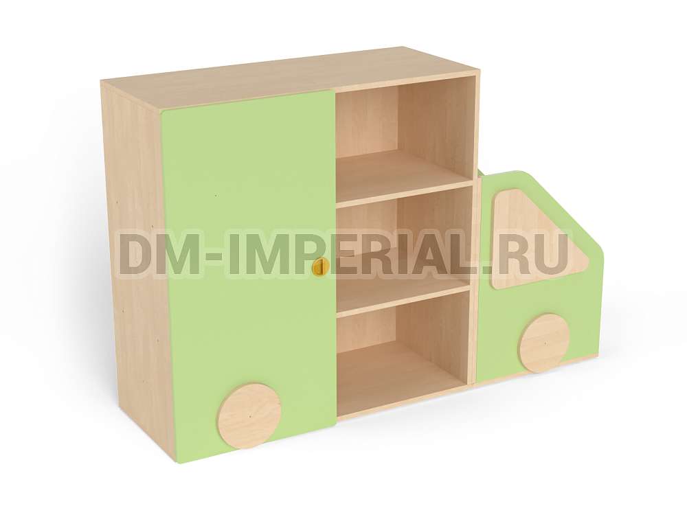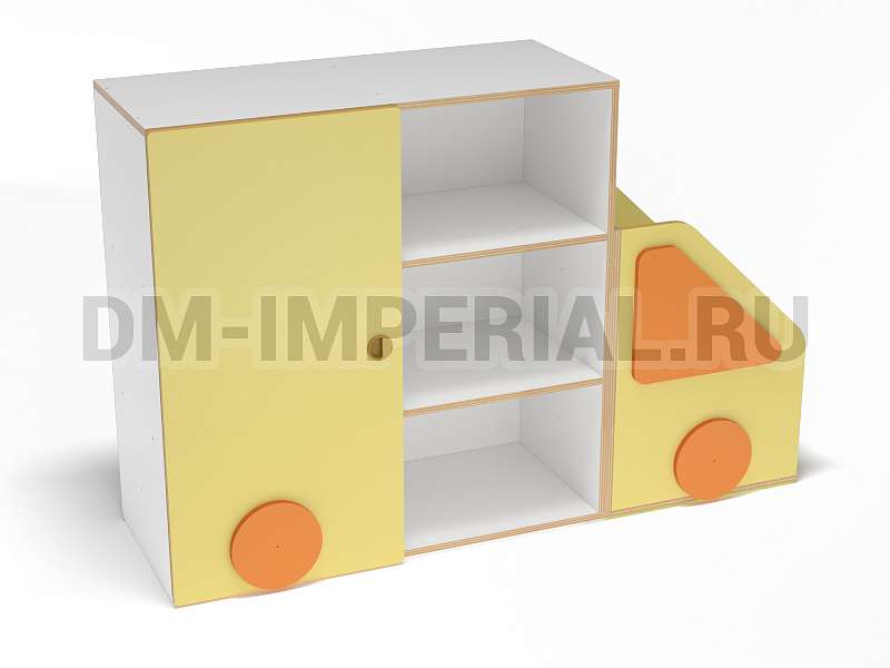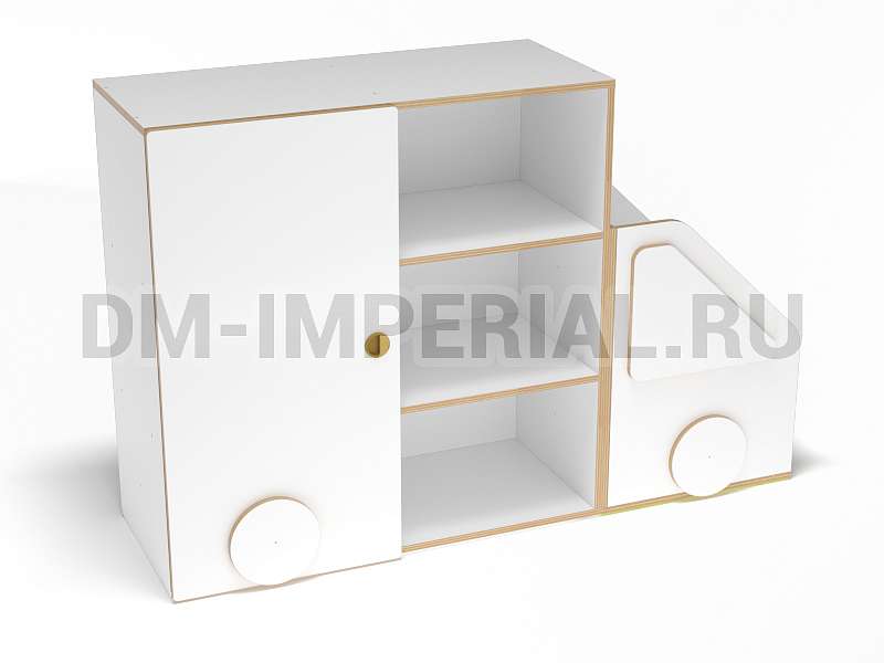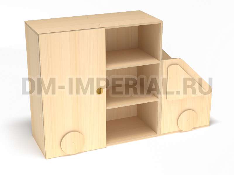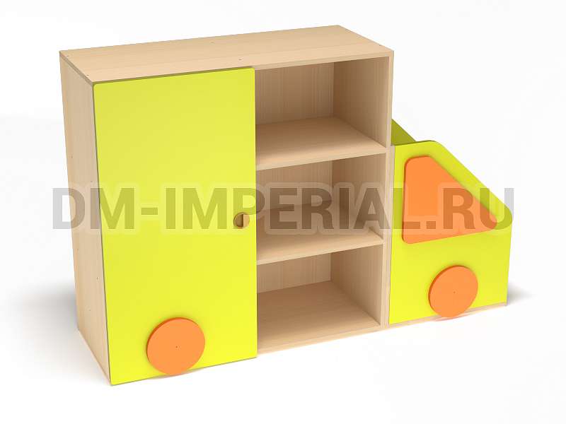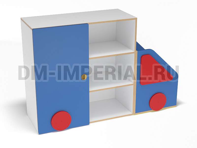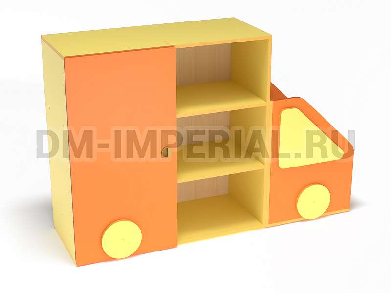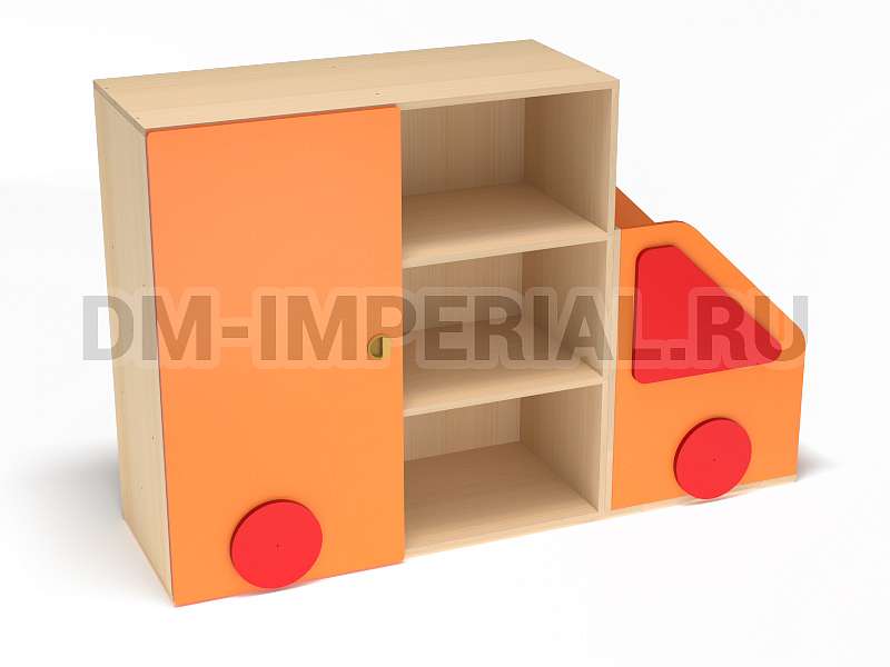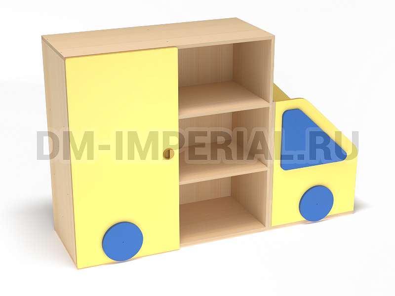 Данный стеллажик обладает необычным внешним видом. Он выполнен в виде грузовичка. В качестве декора используются элементы, которые имитируют фары и окошко. Такая мебель хорошо впишется в пространство для учебы и развлечений в ДОУ.