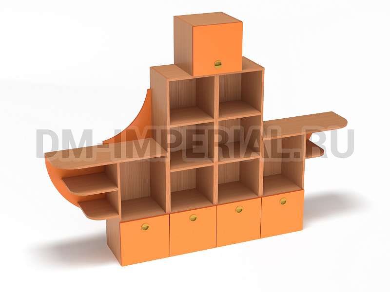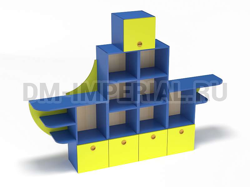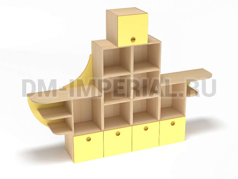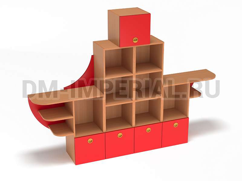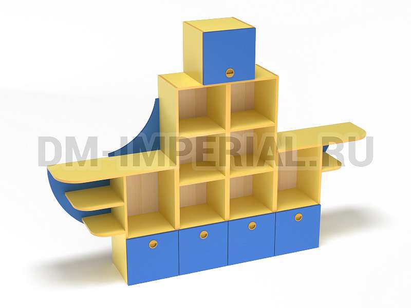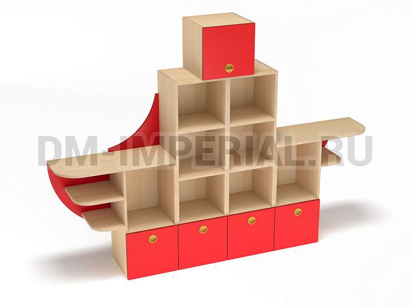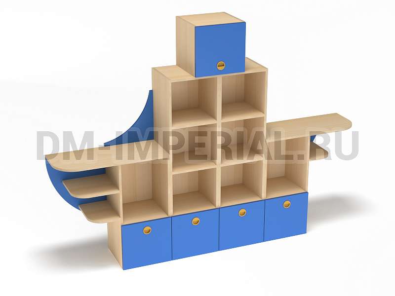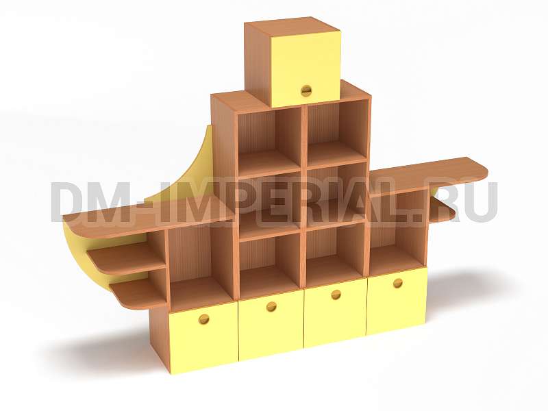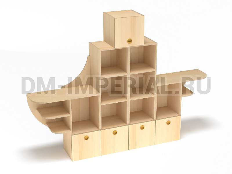 Дизайн данного детского стеллажа сразу привлекает внимание своим необычным внешним видом. Конструкция модели напоминает корабль. Если дополнить стеллаж окрашиваниями (ознакомьтесь с нашей цветовой палитрой подробнее), то он способен стать настоящим украшением пространства.
