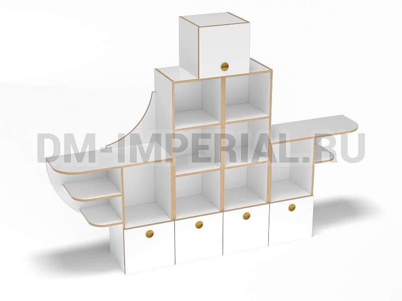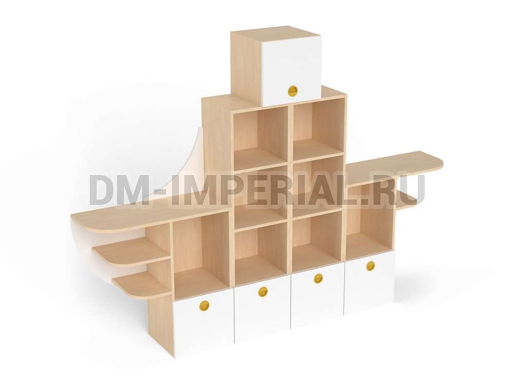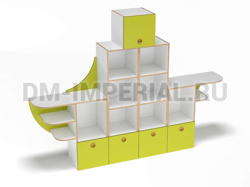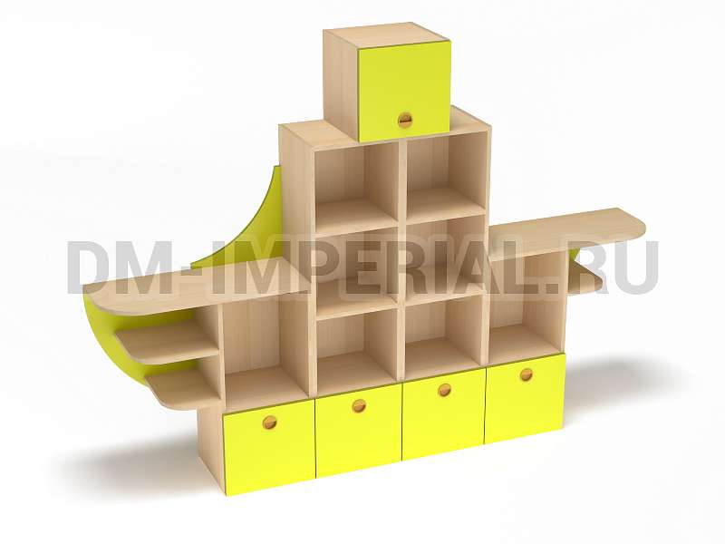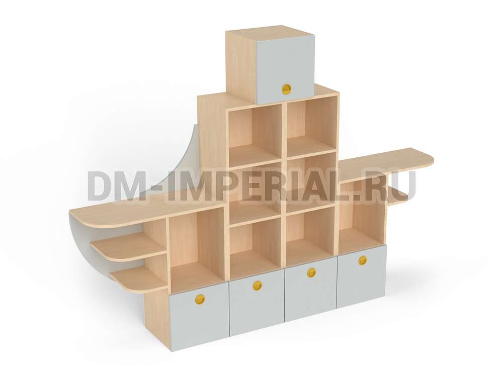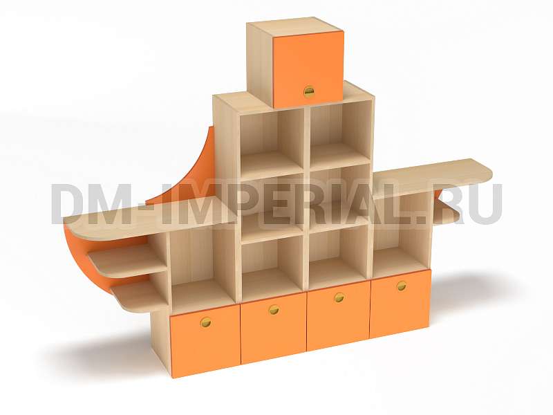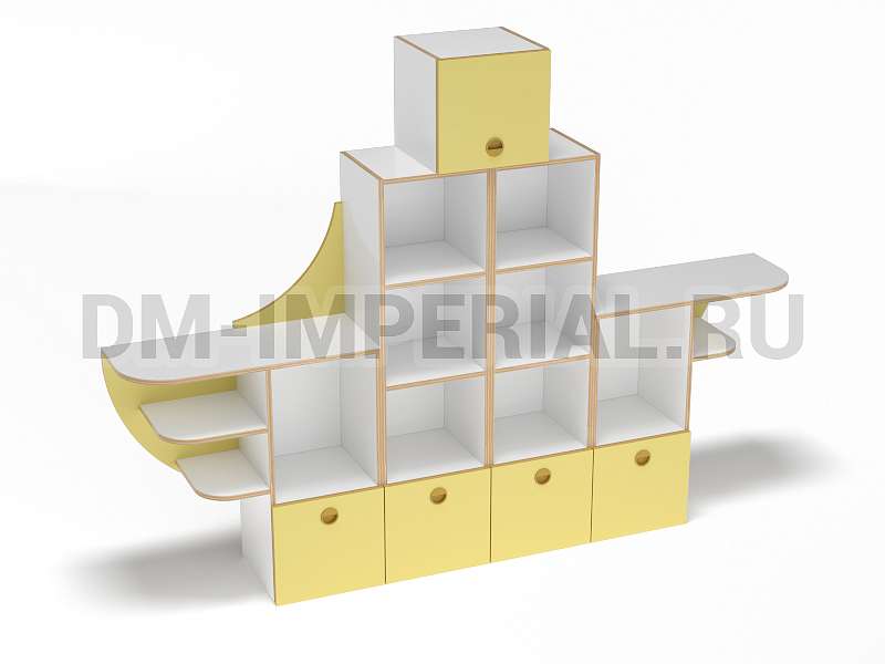 Дизайн данного детского стеллажа сразу привлекает внимание своим необычным внешним видом. Конструкция модели напоминает корабль. Если дополнить стеллаж окрашиваниями (ознакомьтесь с нашей цветовой палитрой подробнее), то он способен стать настоящим украшением пространства.
