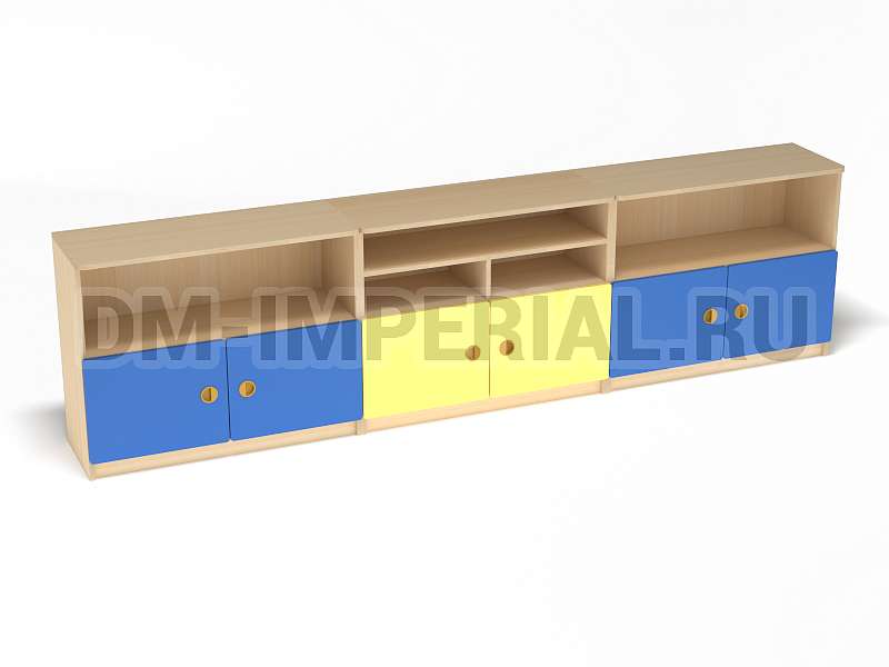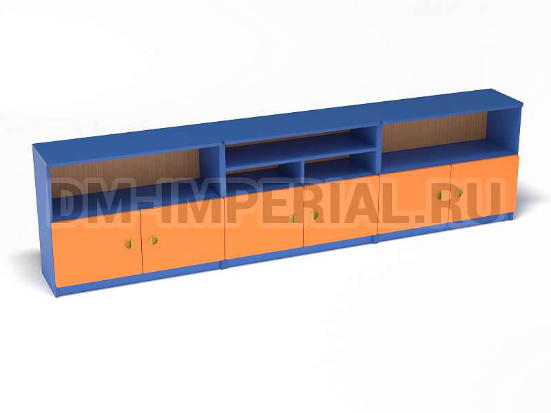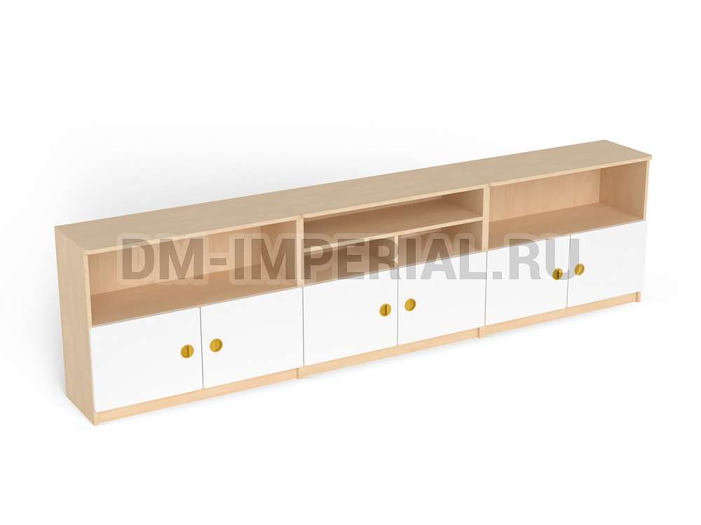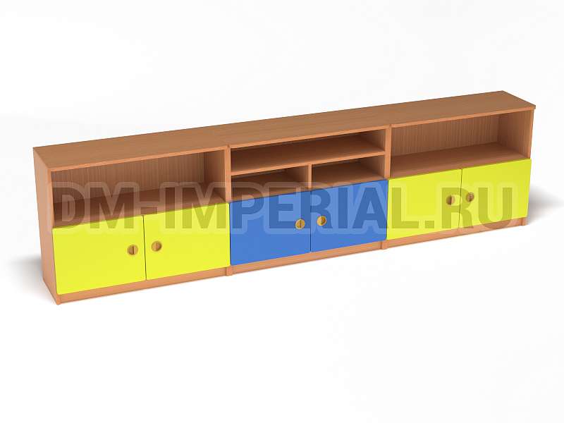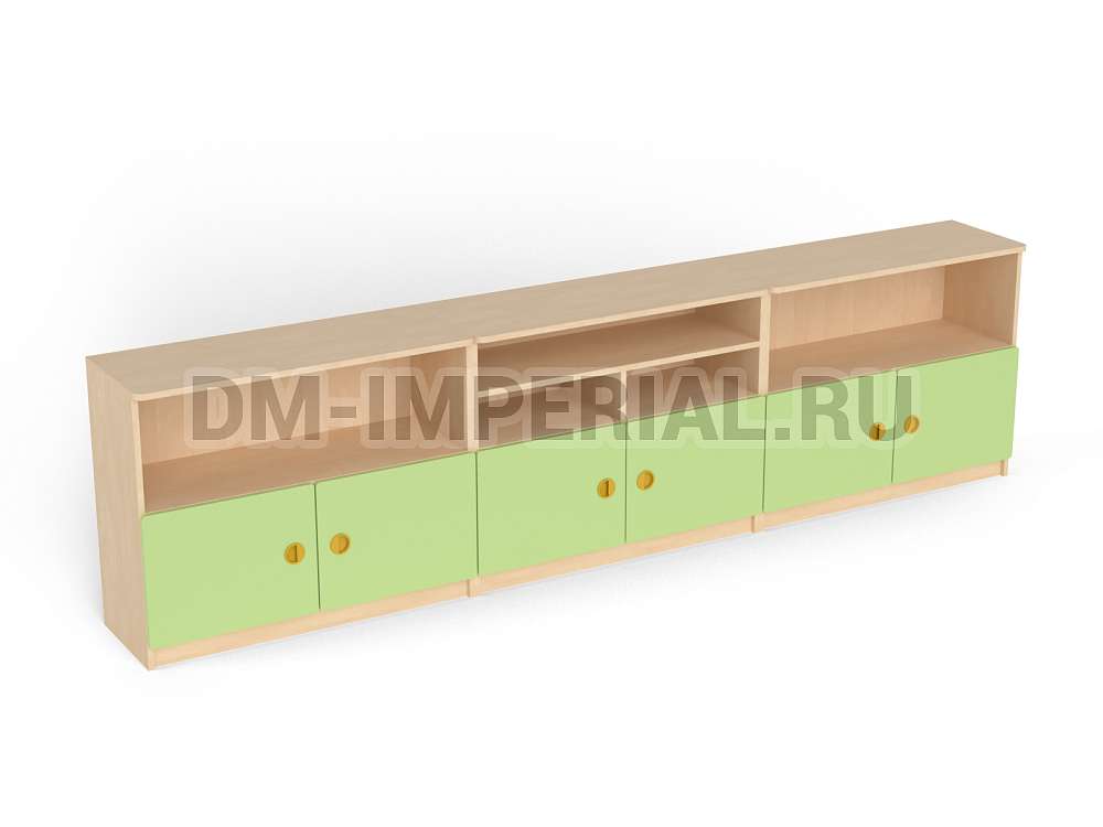 2700*340*700 мм). Стеллаж невысокий, но при этом вместительный. Задействует открытые и закрытые системы хранения: сверху располагаются полки, снизу – шкафчики с дверцами. Свободное пространство в верхней части можно использовать для размещения нужных для учебы и досуга предметов или для декора. Также подойдет для организации выставочного уголка, где детки могут похвастаться своими творческими успехами.