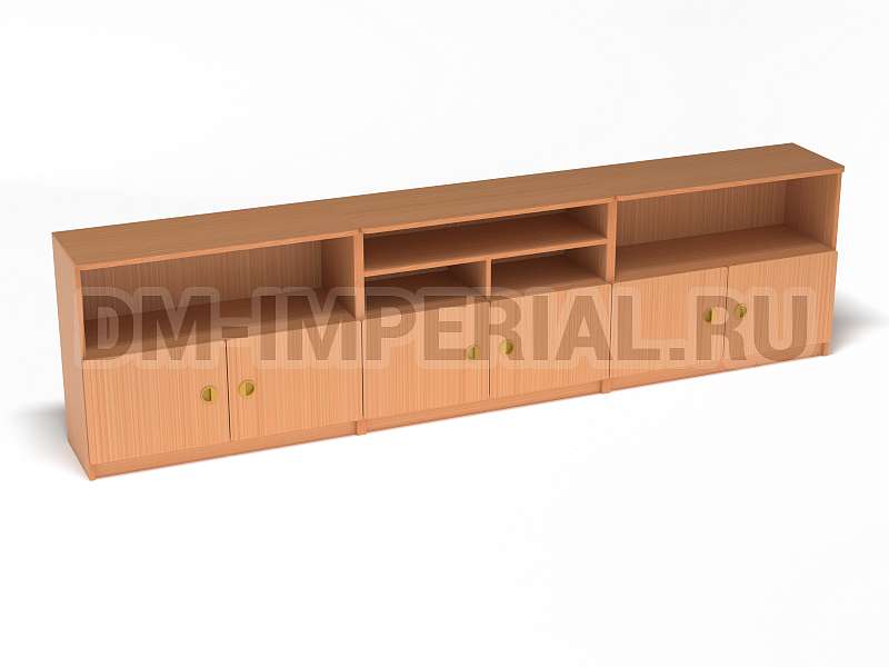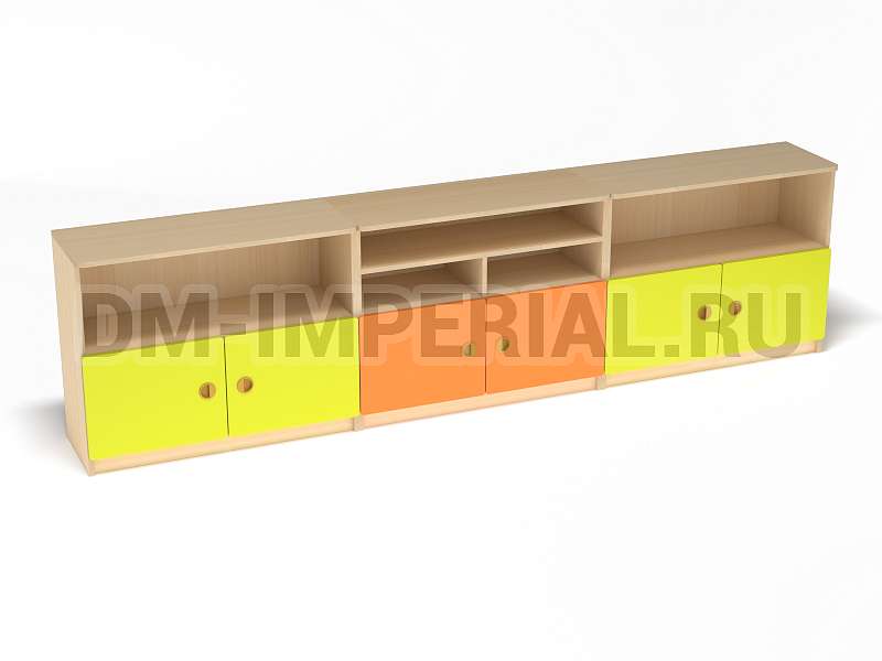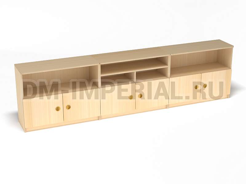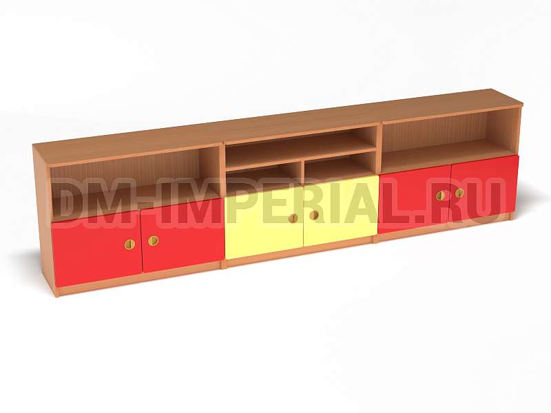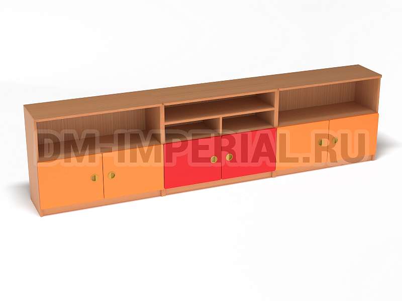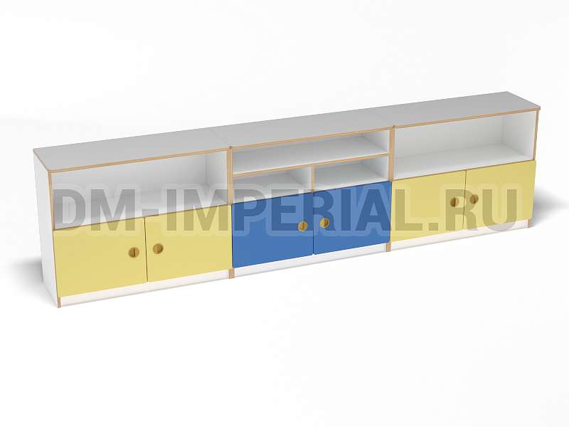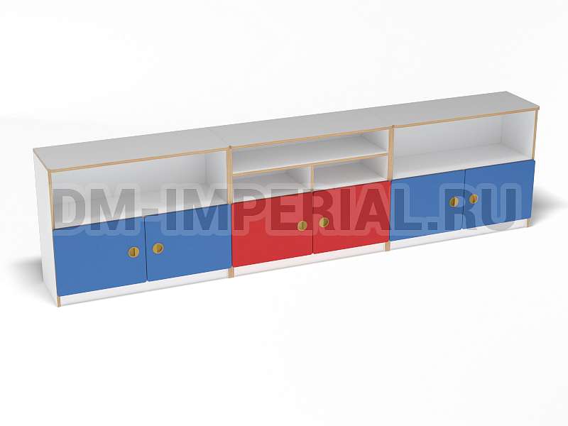 2700*340*700 мм). Стеллаж невысокий, но при этом вместительный. Задействует открытые и закрытые системы хранения: сверху располагаются полки, снизу – шкафчики с дверцами. Свободное пространство в верхней части можно использовать для размещения нужных для учебы и досуга предметов или для декора. Также подойдет для организации выставочного уголка, где детки могут похвастаться своими творческими успехами.