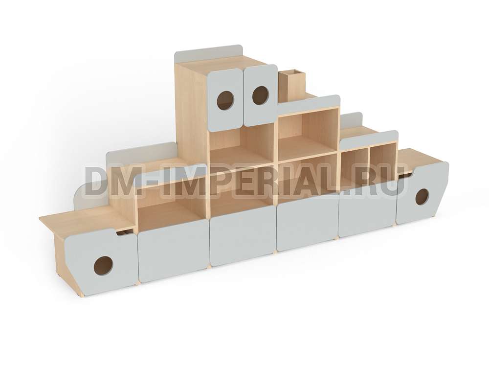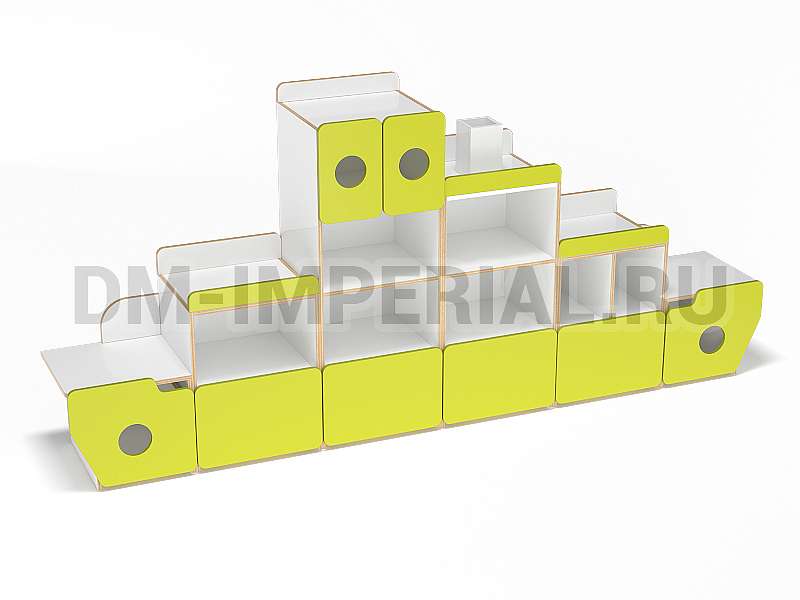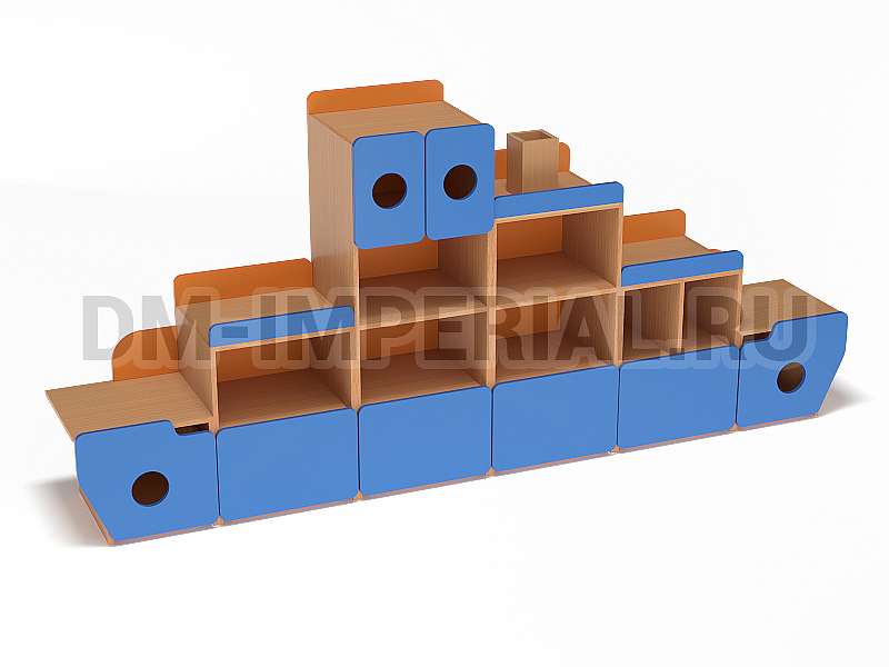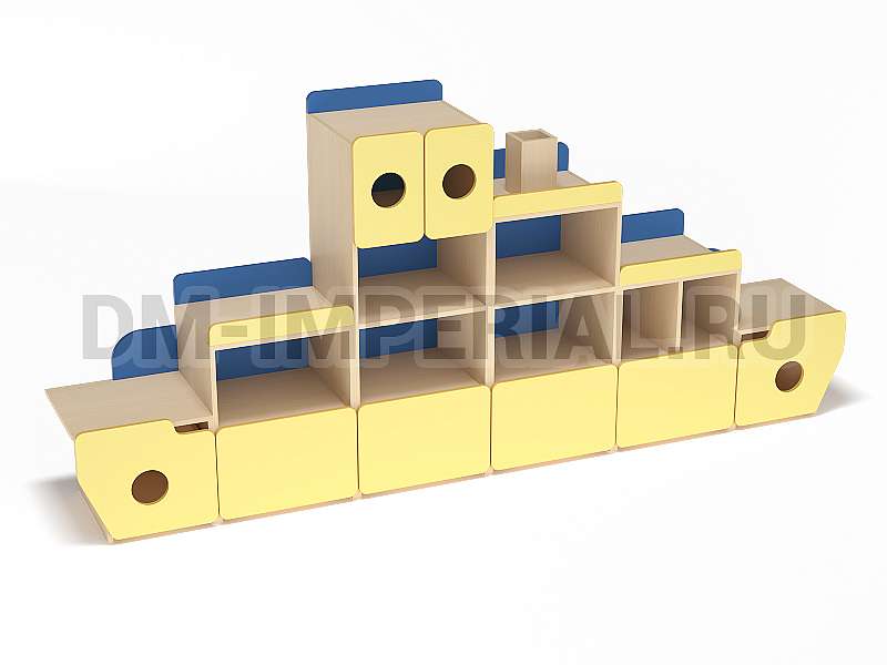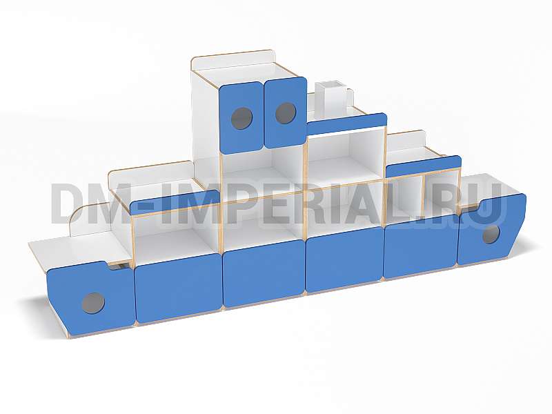 Стеллаж «Фрегат» - это мебель, предназначенная для оформления пространств для учебы и досуга в детских дошкольных учреждениях. Модель отвечает всем требованиям: вместительна, удобна и при этом весьма эстетична. Конструкция стеллажа интересна – напоминает кораблик. В некоторых дверцах даже присутствуют круглые отверстия, напоминающие иллюминаторы, а сверху располагается «труба».