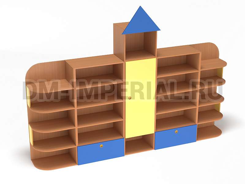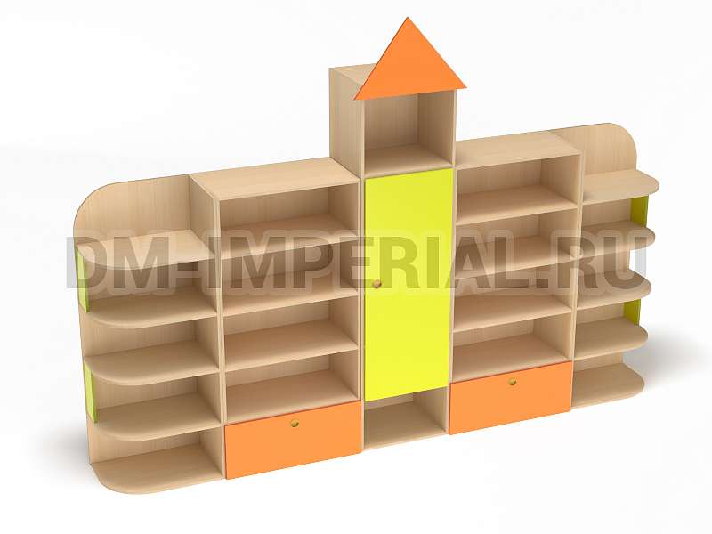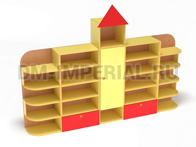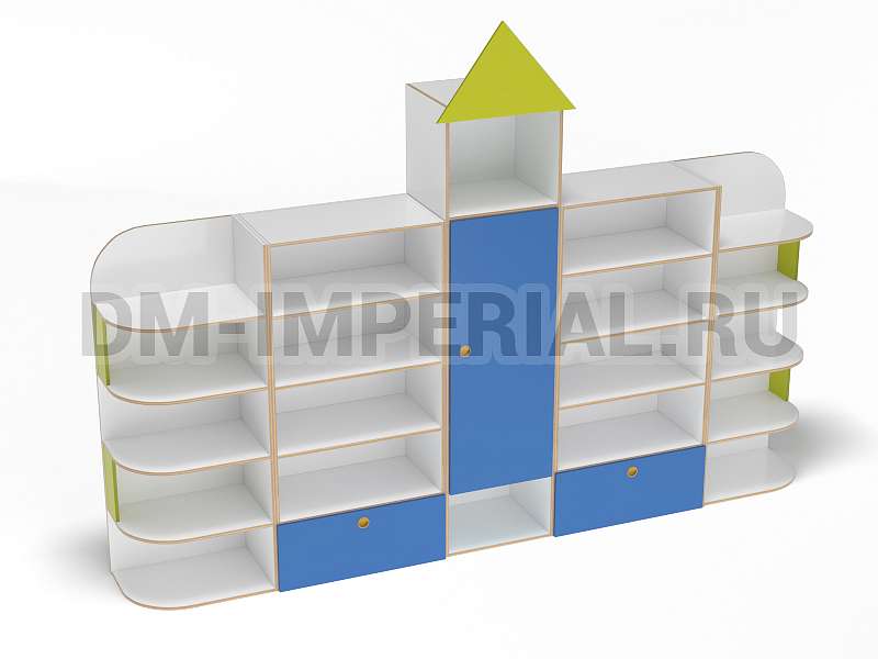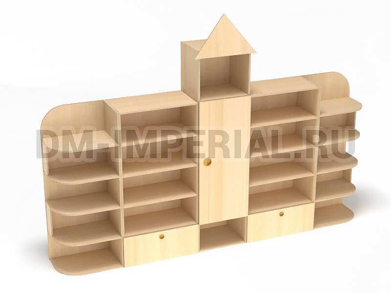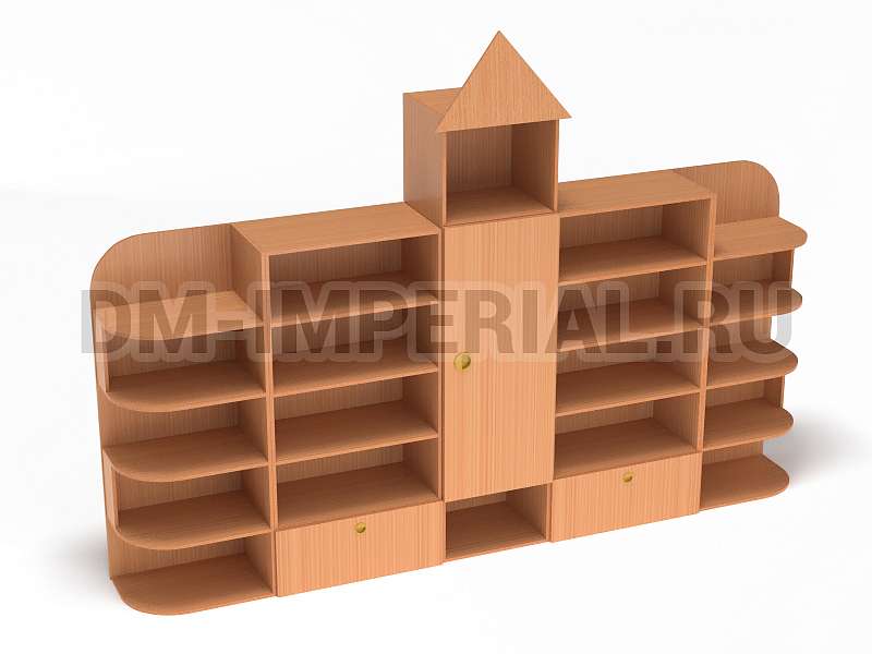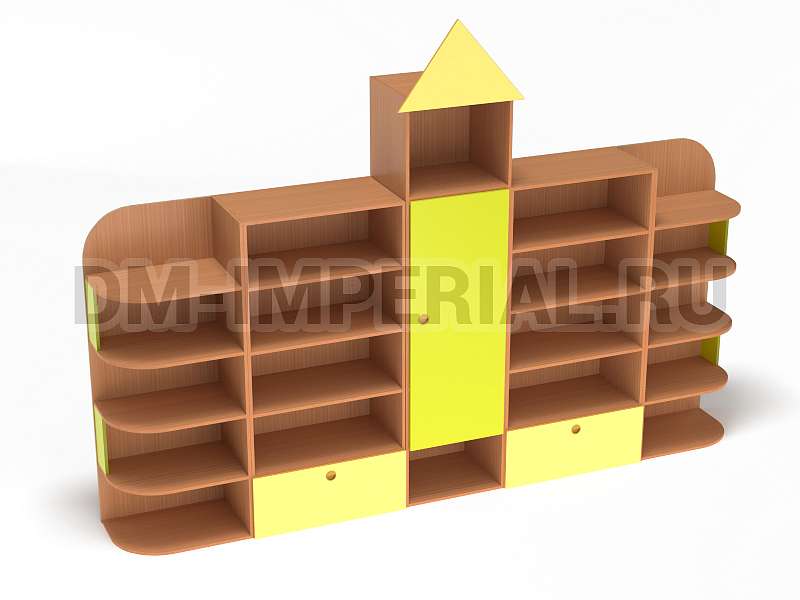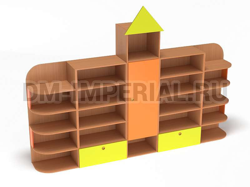 На данной странице представлен стеллаж «Теремок», чья конструкция визуально напоминает домик. Конструкционно модель напоминает шкафчик "Домик" (также представлен в каталоге), но отличается большим количеством секций для хранения вещей. Перед нами достаточно массивный стеллаж, хорошо подходящий для просторных помещений и способный вместить много необходимых для интересного досуга предметов. Габариты следующие - 3450*470*2440/1620 мм. Высота шкафа варьируется.