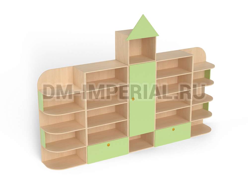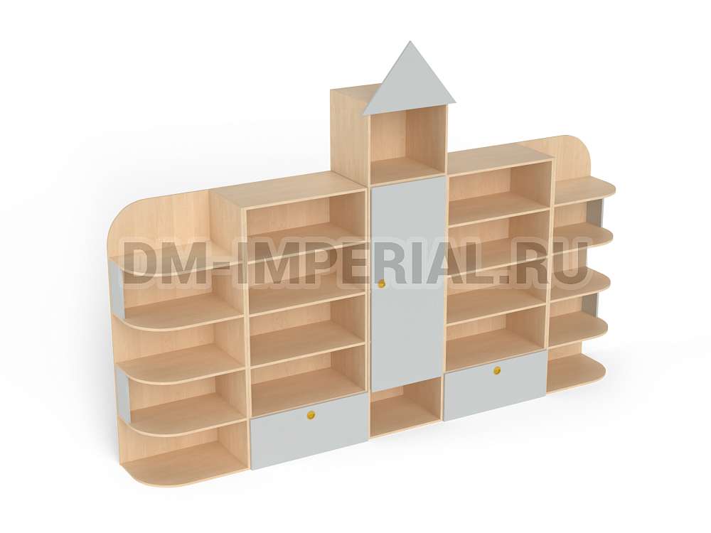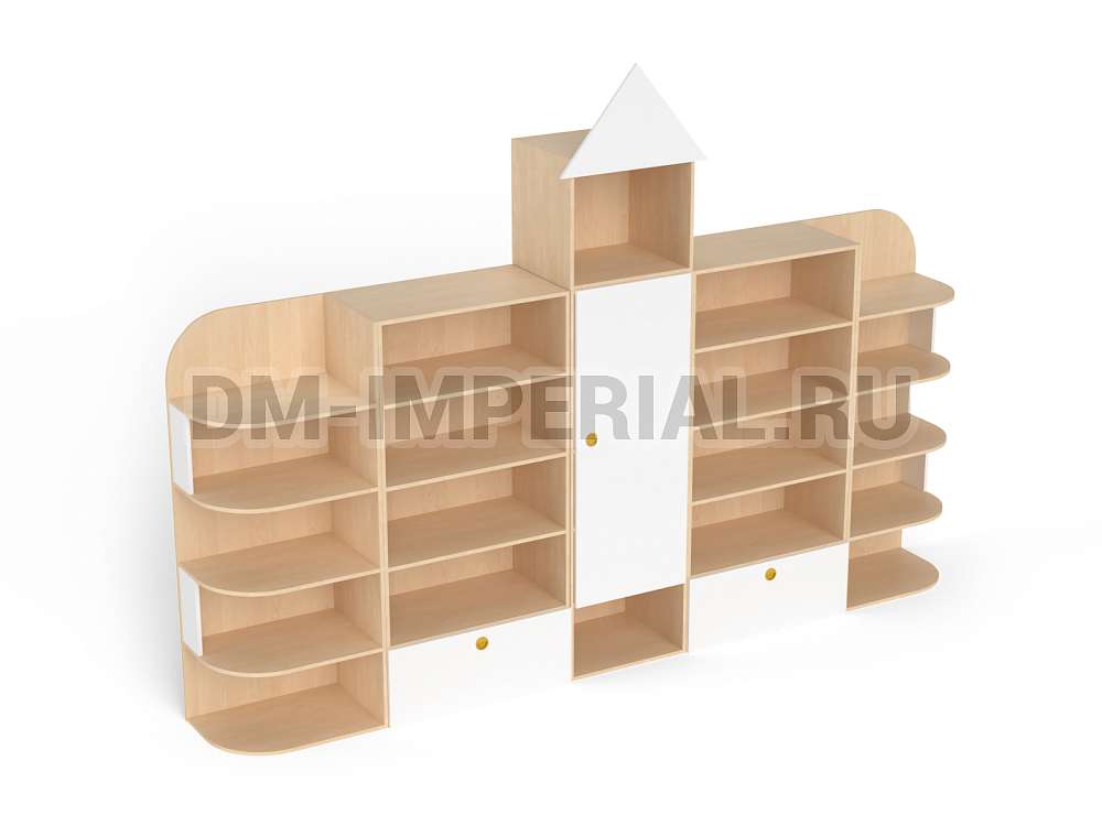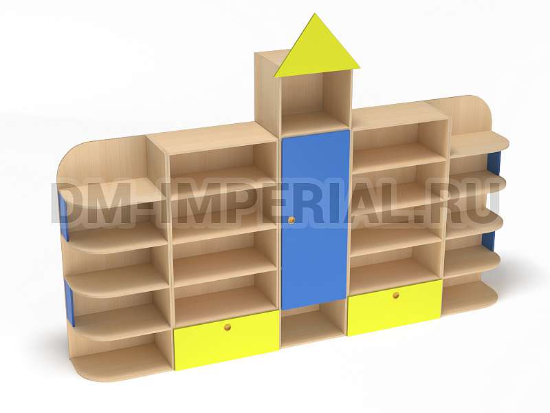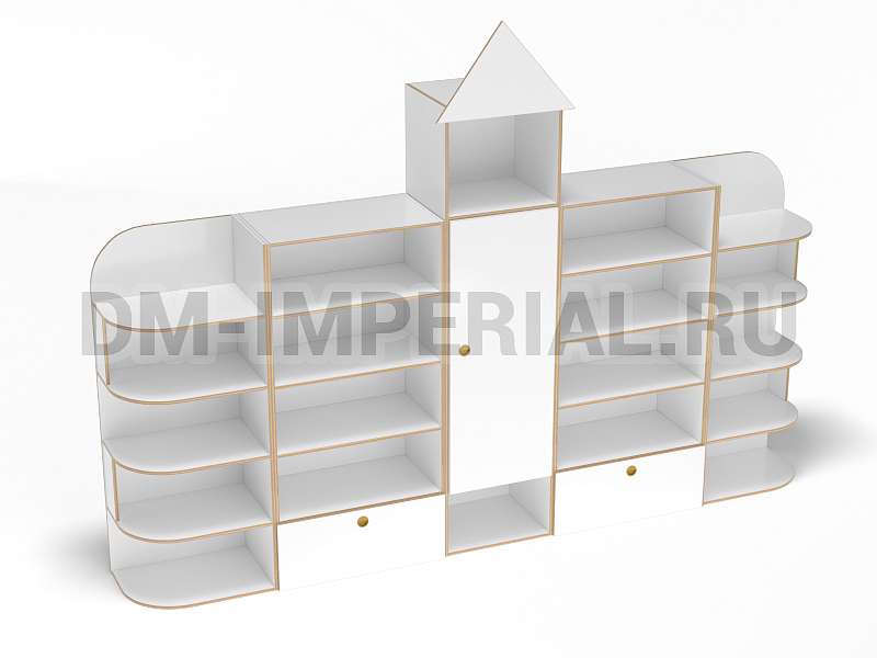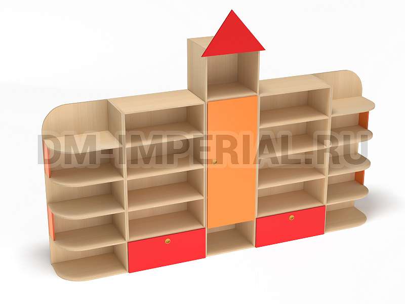 На данной странице представлен стеллаж «Теремок», чья конструкция визуально напоминает домик. Конструкционно модель напоминает шкафчик "Домик" (также представлен в каталоге), но отличается большим количеством секций для хранения вещей. Перед нами достаточно массивный стеллаж, хорошо подходящий для просторных помещений и способный вместить много необходимых для интересного досуга предметов. Габариты следующие - 3450*470*2440/1620 мм. Высота шкафа варьируется.