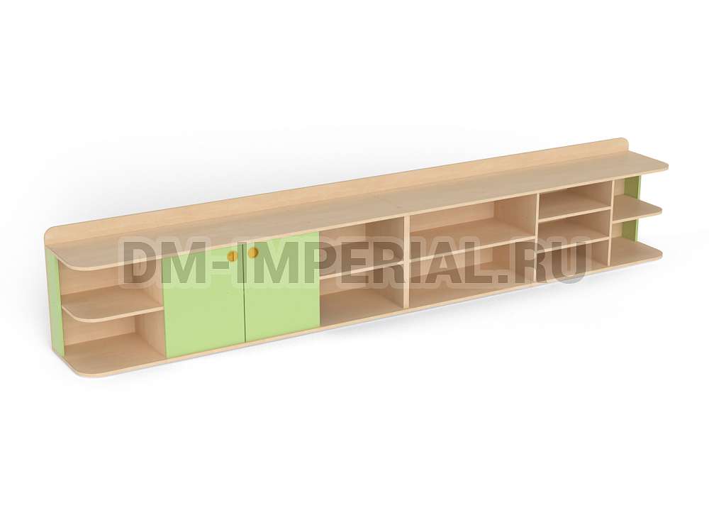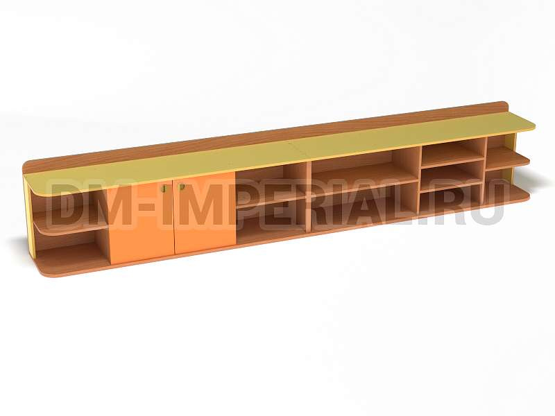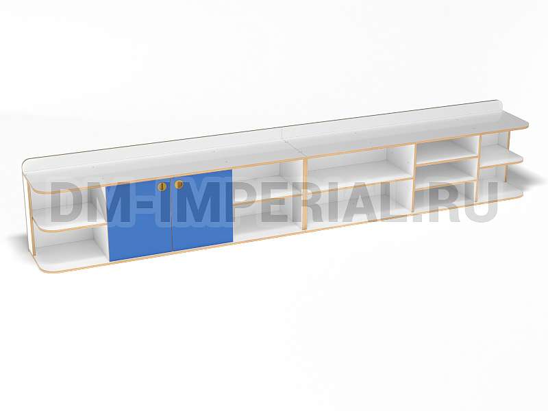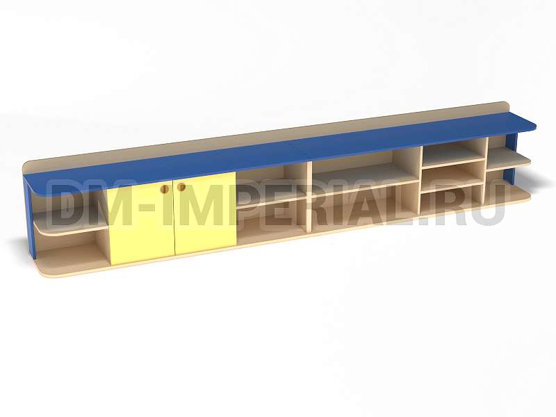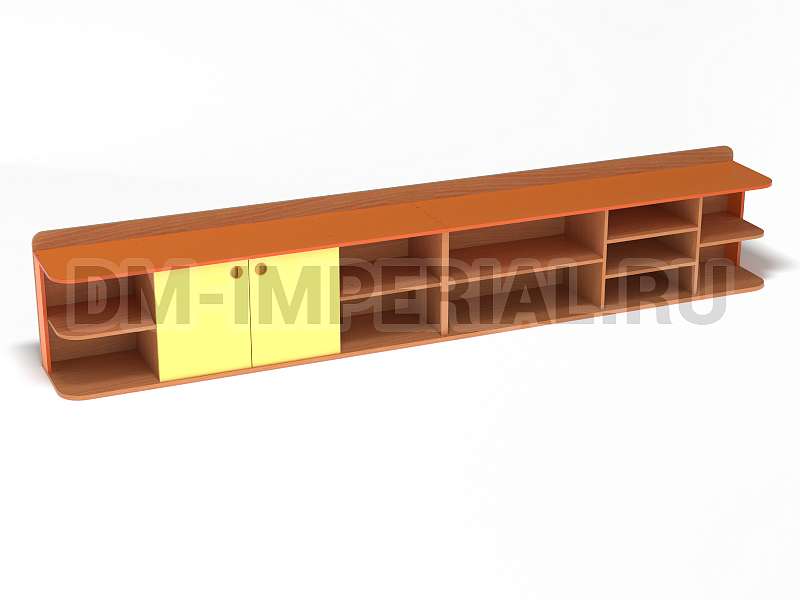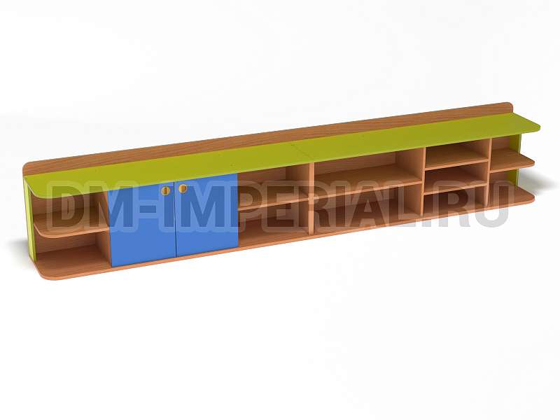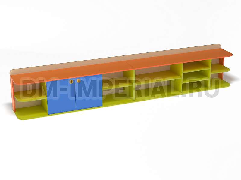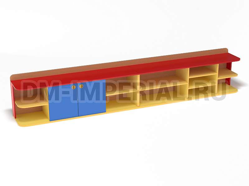 Данная модель игрового стеллажа имеет необычную конструкцию. Габариты: 3420х420х600 мм. Модель выполнена низкой, но длинной. Она отлично впишется в пространство комнаты, компактно и аккуратно располагаясь вдоль стены. Свободное пространство над стеллажом можно интересно оформить. Организовать дополнительную вертикальную систему хранения (например, с помощью полок) или остановиться на украшении декором (рамочками с изображениями, панно и т.д).