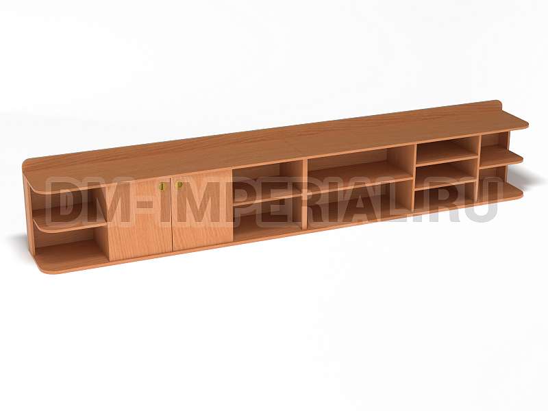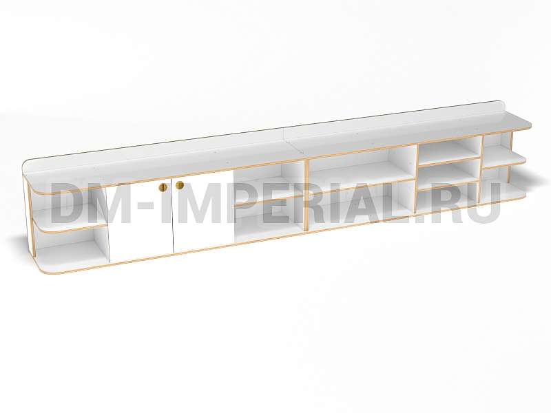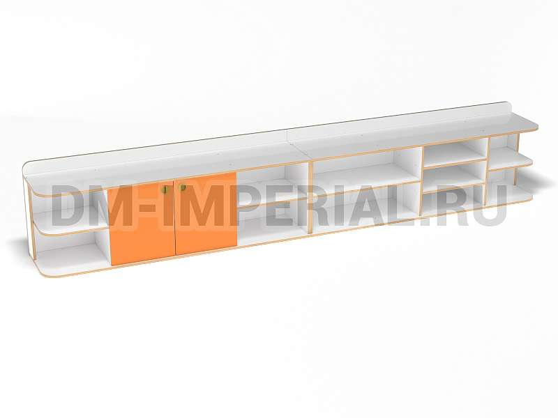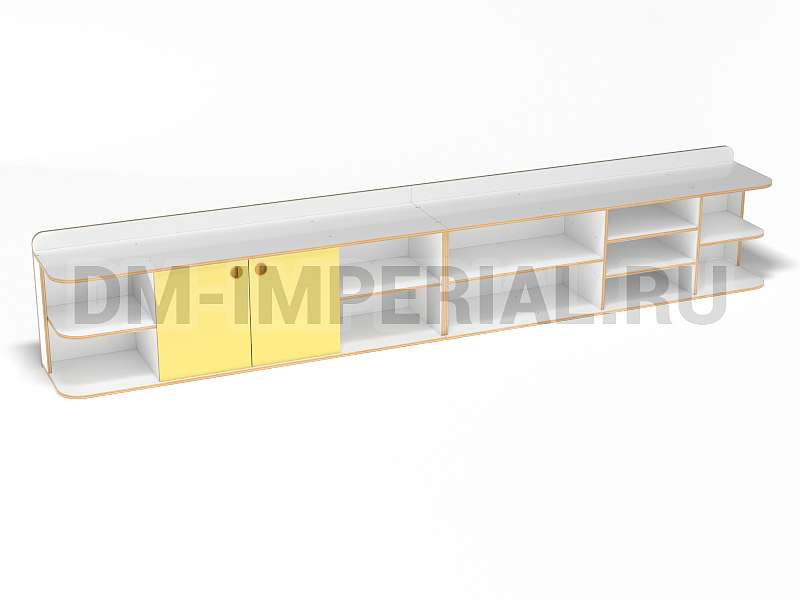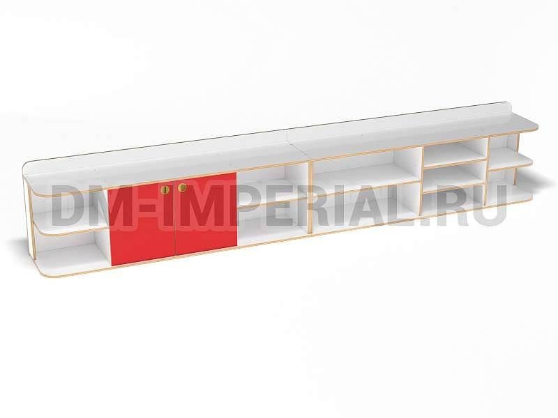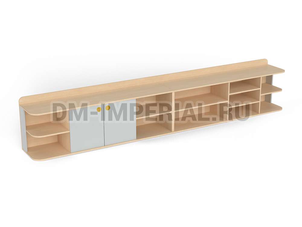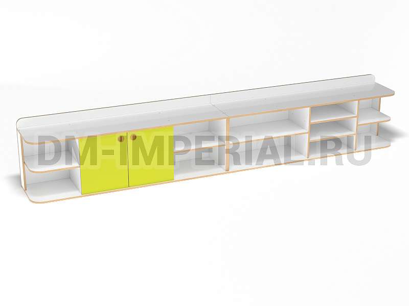 Данная модель игрового стеллажа имеет необычную конструкцию. Габариты: 3420х420х600 мм. Модель выполнена низкой, но длинной. Она отлично впишется в пространство комнаты, компактно и аккуратно располагаясь вдоль стены. Свободное пространство над стеллажом можно интересно оформить. Организовать дополнительную вертикальную систему хранения (например, с помощью полок) или остановиться на украшении декором (рамочками с изображениями, панно и т.д).