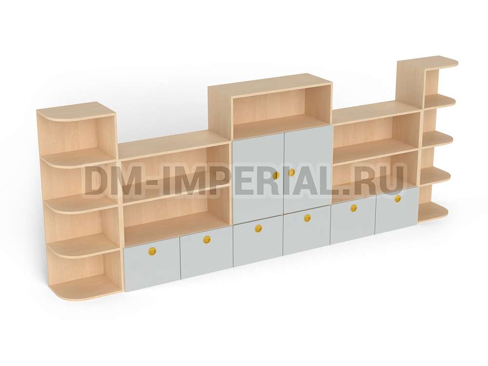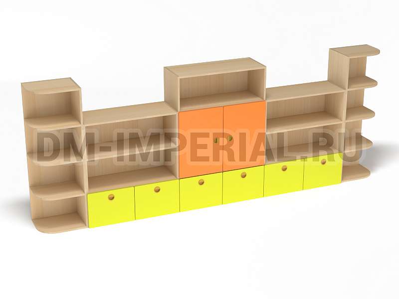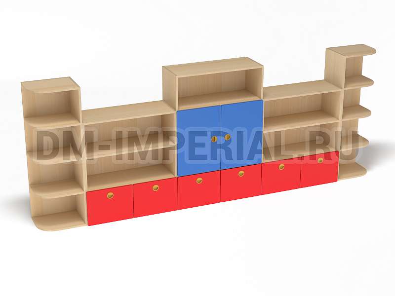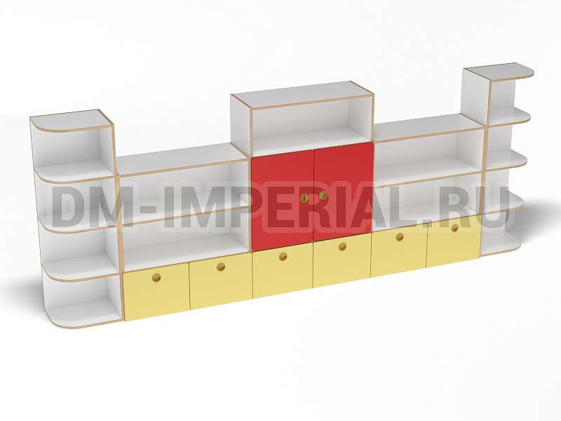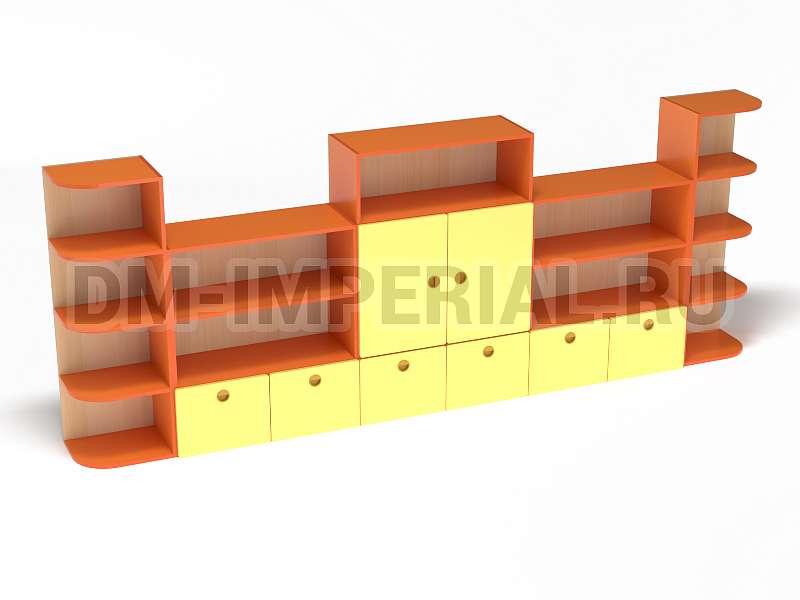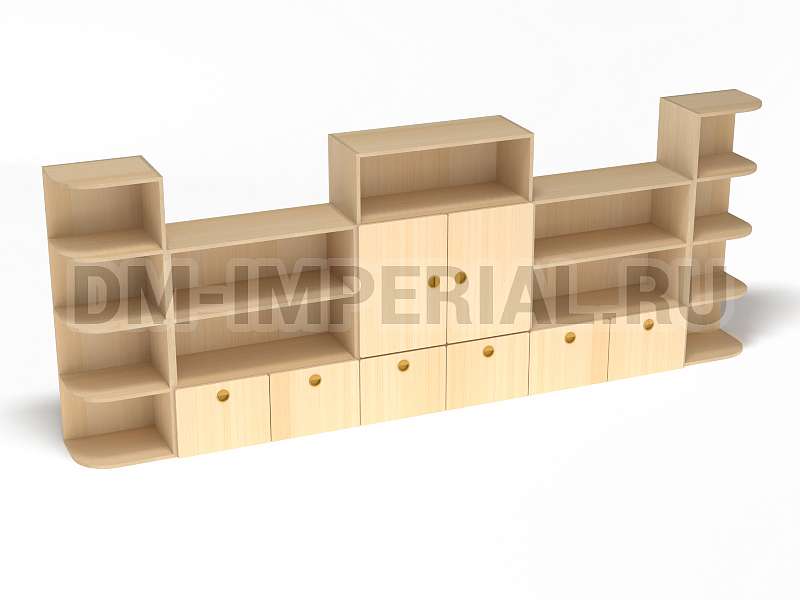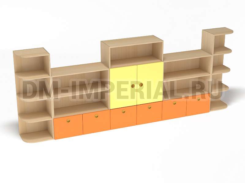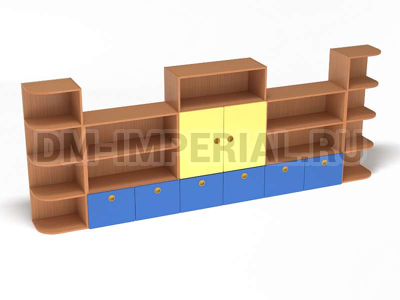 Стеллаж «Золушка» обладает стандартной конструкцией, в которой используется сочетание открытых и закрытых систем хранения. Габариты модели оптимальны: 3200*340*1200 мм. Глубины полок достаточно, чтобы разместить на них все необходимое детям и воспитателям. Дизайн довольно лаконичный и хорошо впишется в любой интерьер.