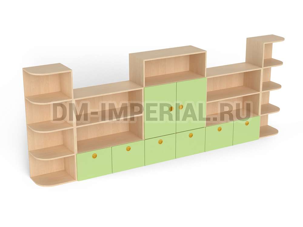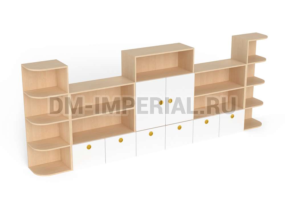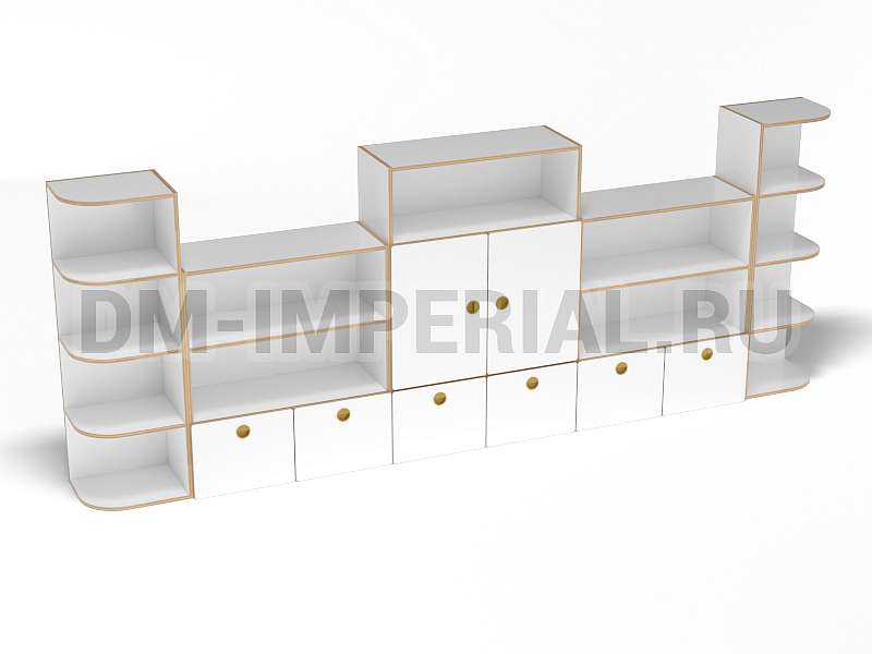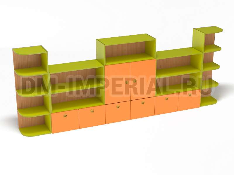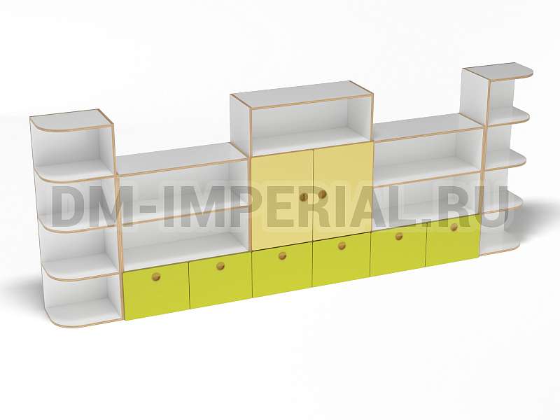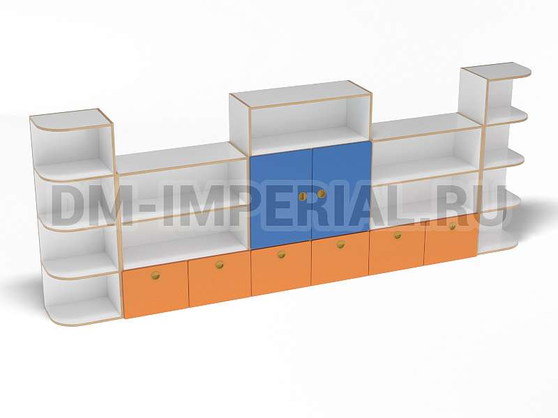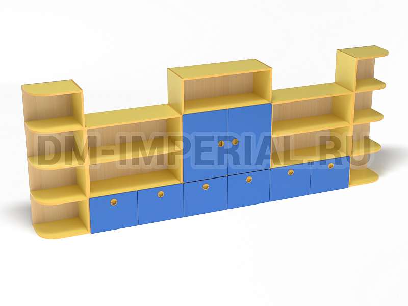 Стеллаж «Золушка» обладает стандартной конструкцией, в которой используется сочетание открытых и закрытых систем хранения. Габариты модели оптимальны: 3200*340*1200 мм. Глубины полок достаточно, чтобы разместить на них все необходимое детям и воспитателям. Дизайн довольно лаконичный и хорошо впишется в любой интерьер.