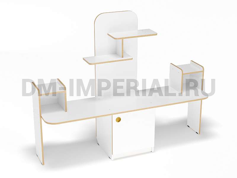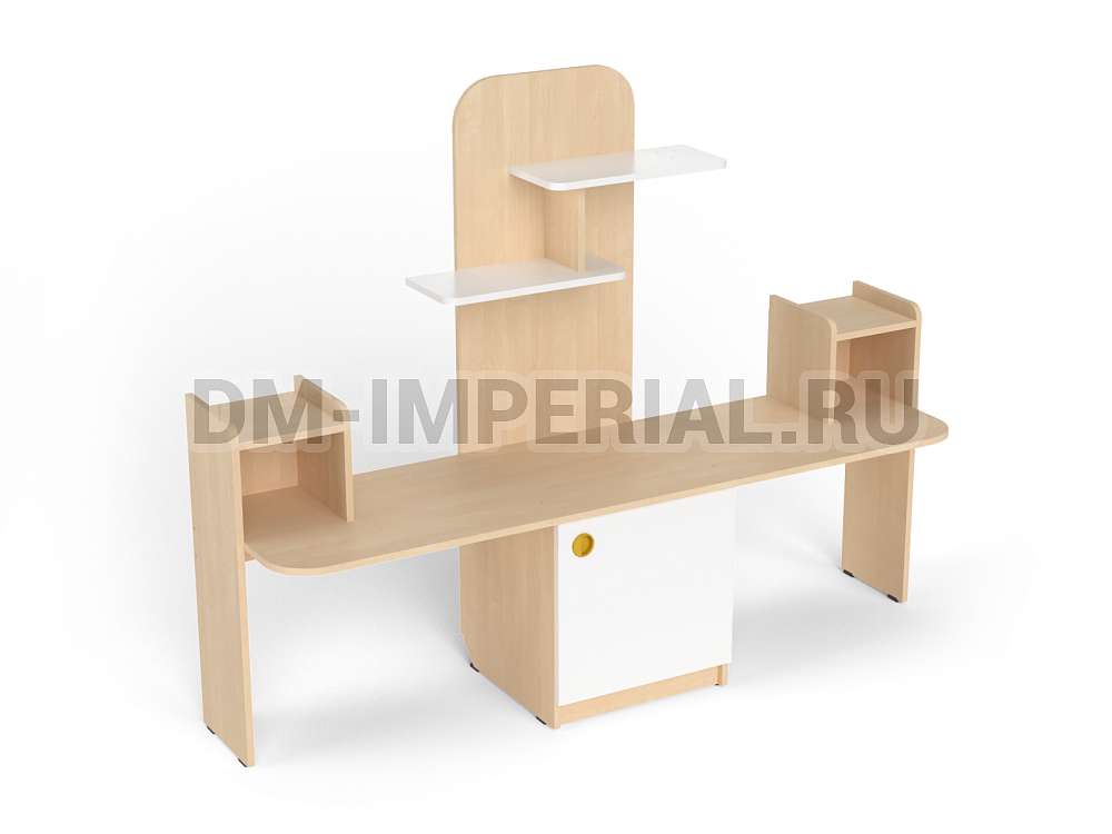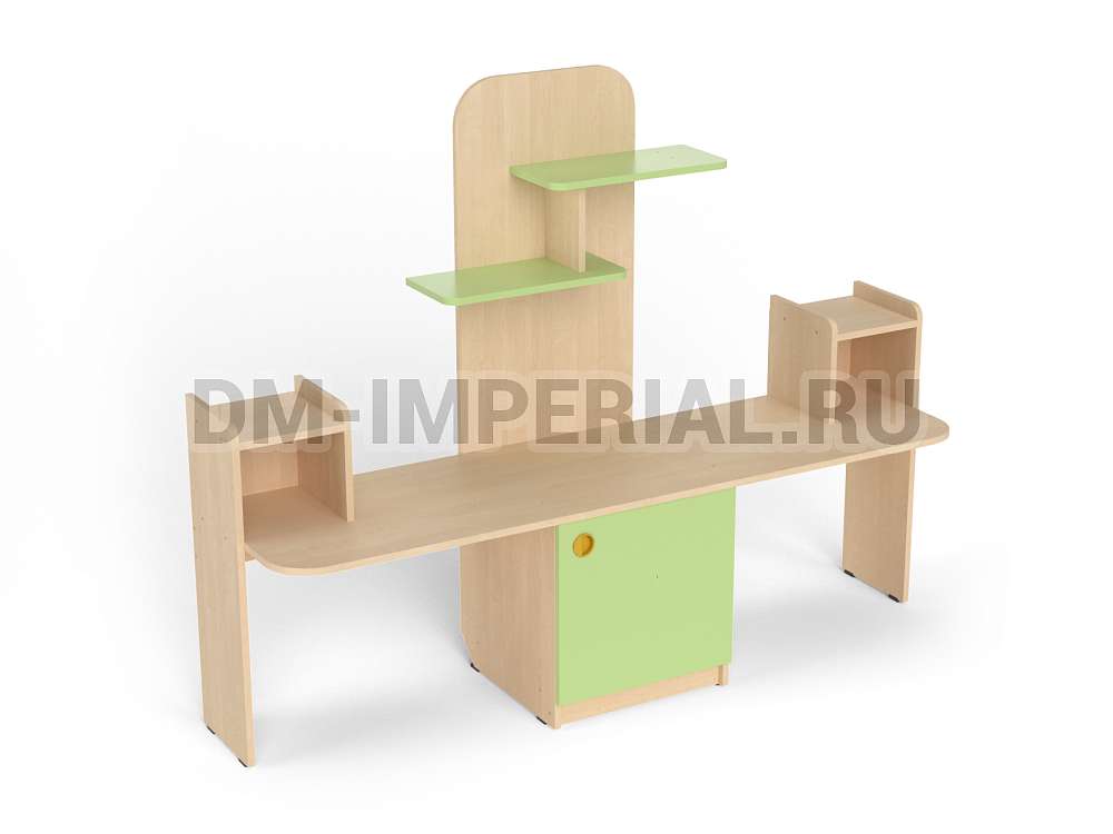 Уголок оснащается большой, просторной столешницей, двумя открытыми ячейками и закрытым шкафчиком в нижней части. В качестве декора предусмотрена настенная панель с полками, на которых можно разместить приятные мелочи – цветы, сувениры и т.д. Модель универсальна и подойдет для оформления различных тематических уголков. Например, творческой зоны. Здесь можно эстетично и интересно для ребенка разместить все необходимое для рисования, лепки, скрапбукинга, вышивания и прочих увлекательных занятий.