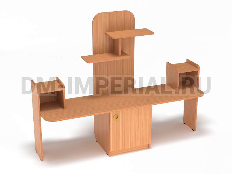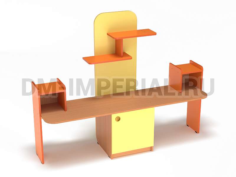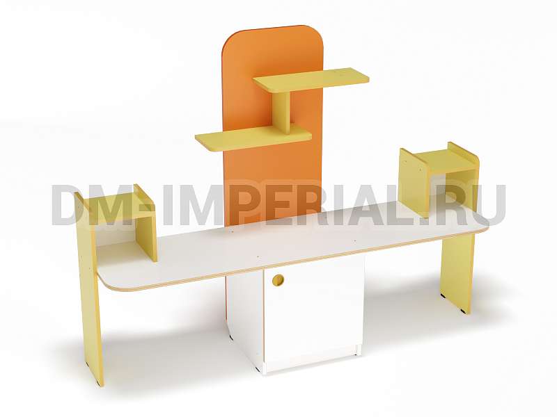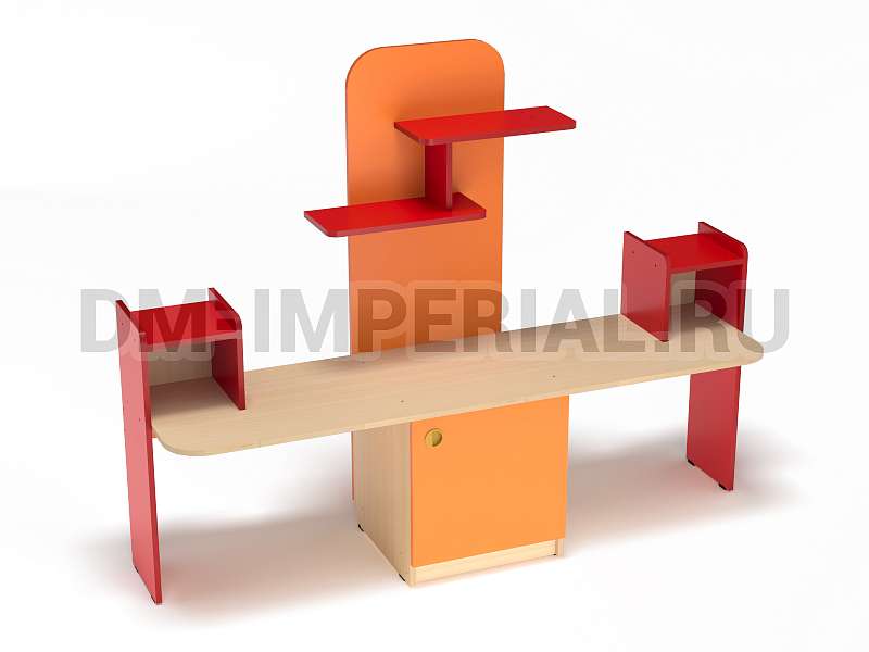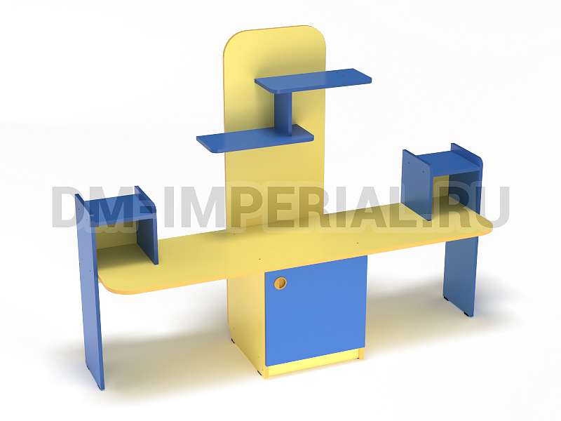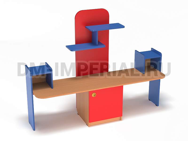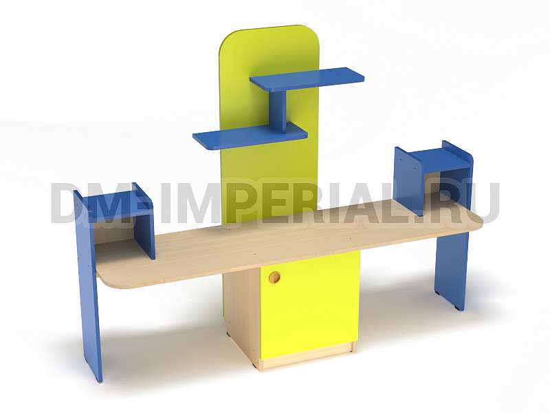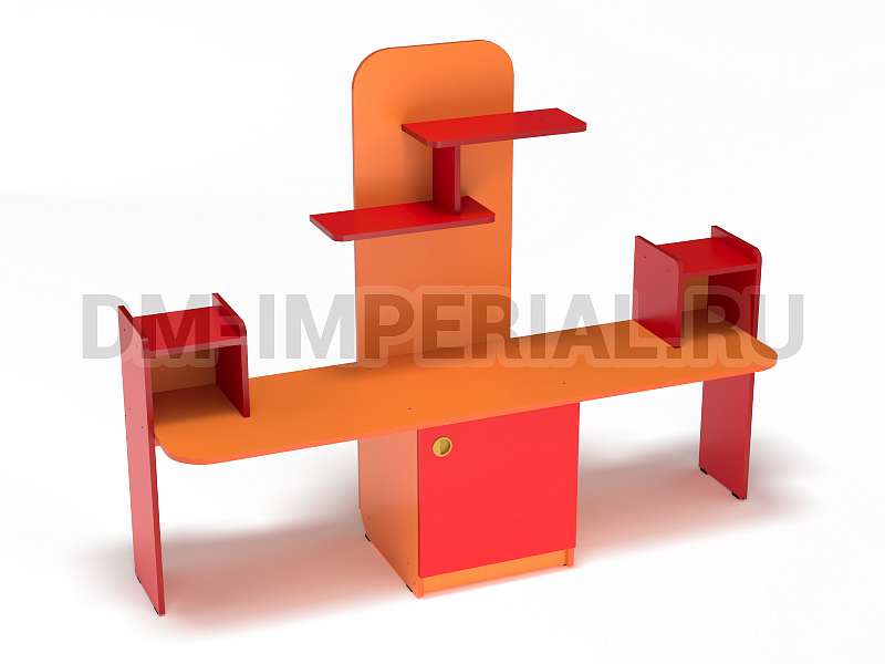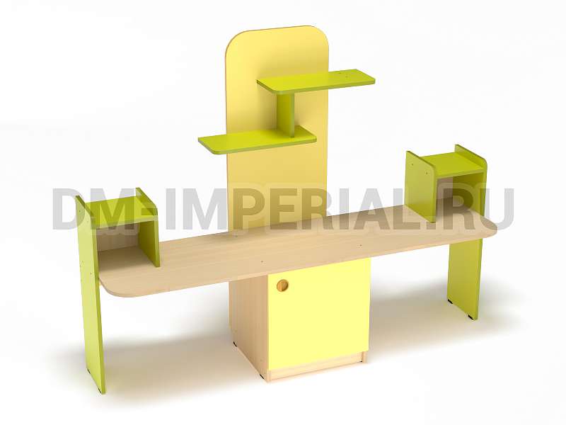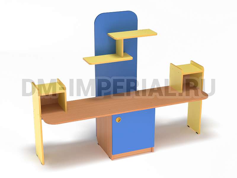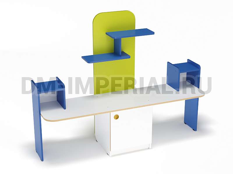 Данная модель выпускается в рамках серии детских уголков для дошкольных заведений. Обладает довольно большими размерами – 1740х470х1350 мм. Дизайн практичный: в конструкцию включено все необходимое для хранения предметов, которые могут понадобиться детям и воспитателям для проведения учебно-развлекательных мероприятий.