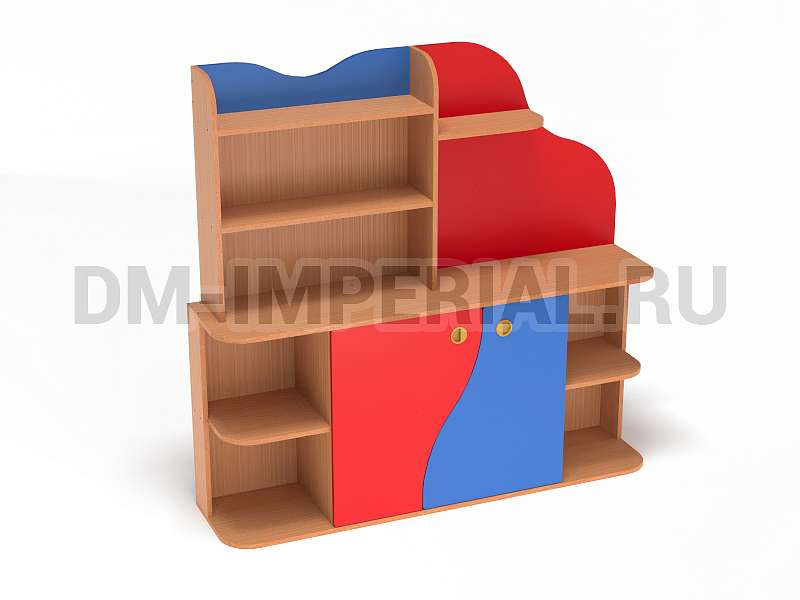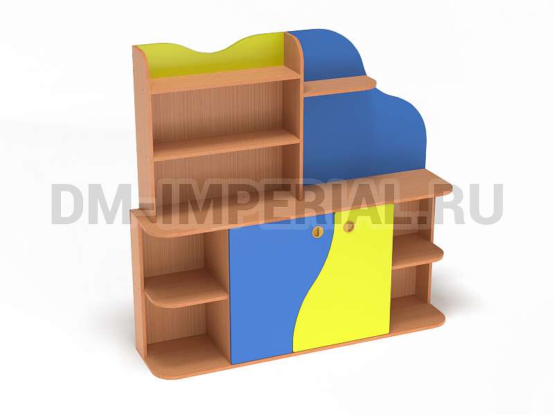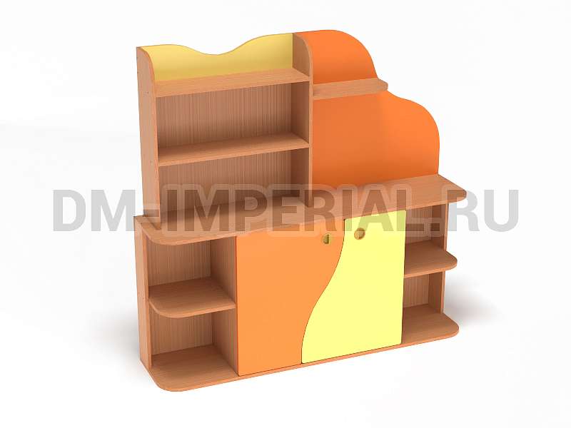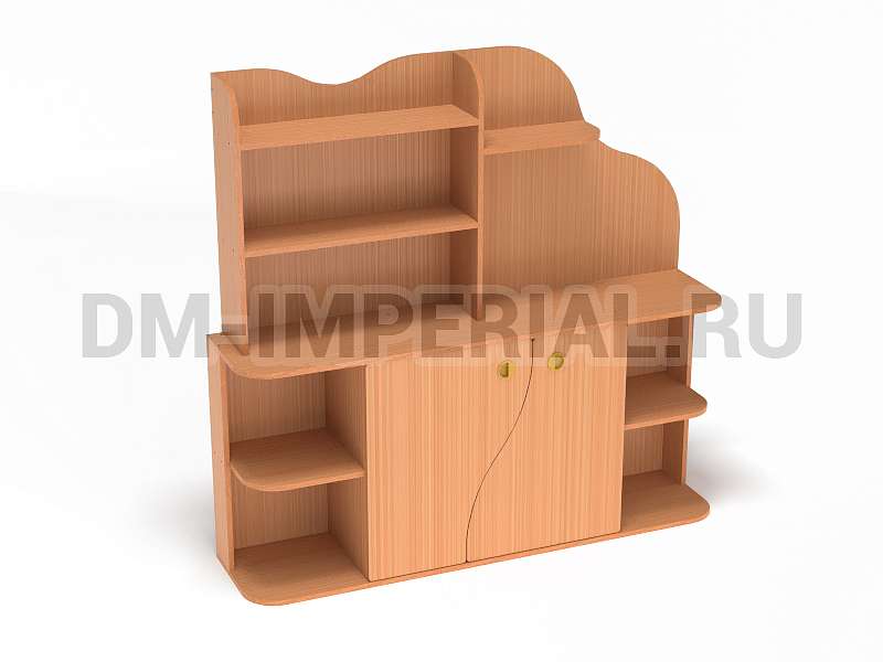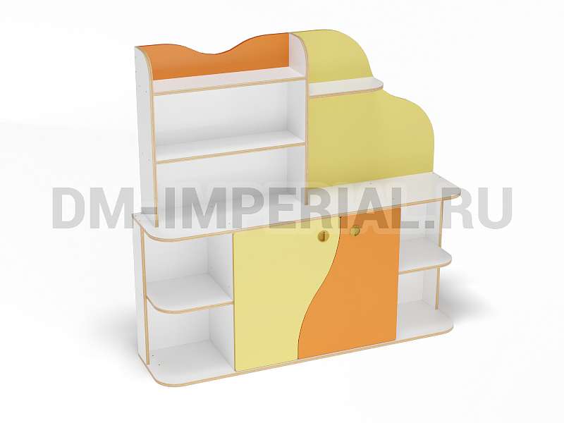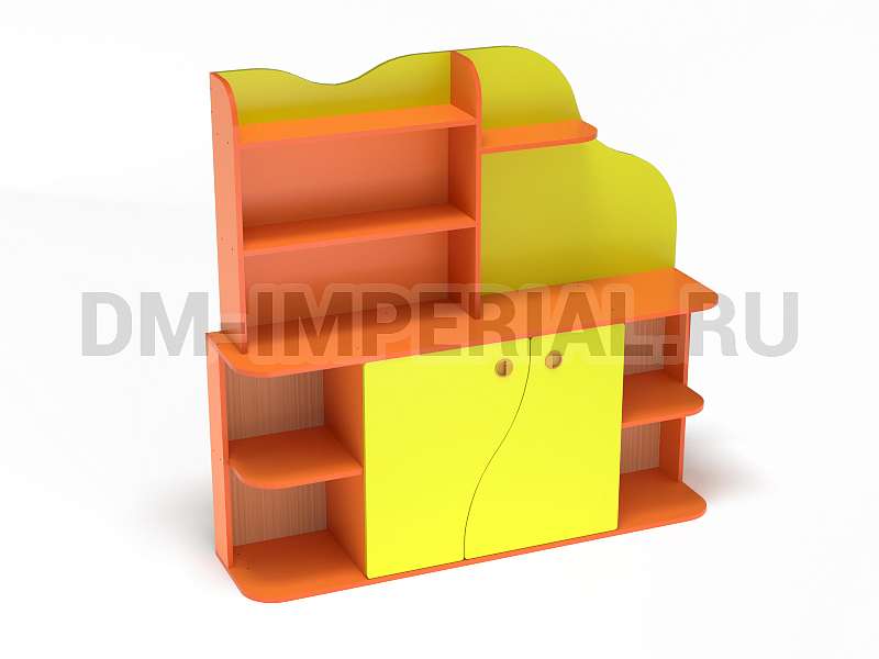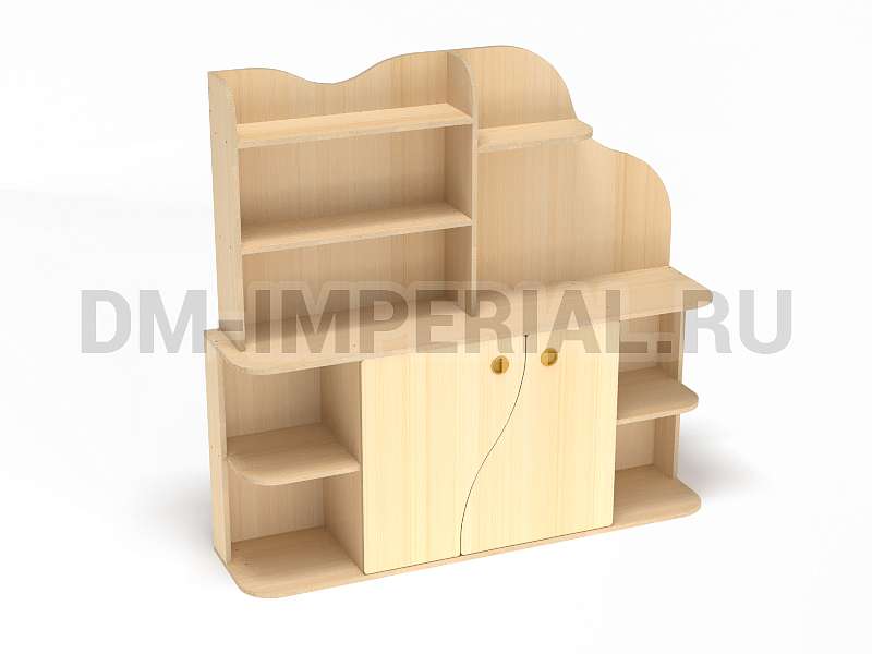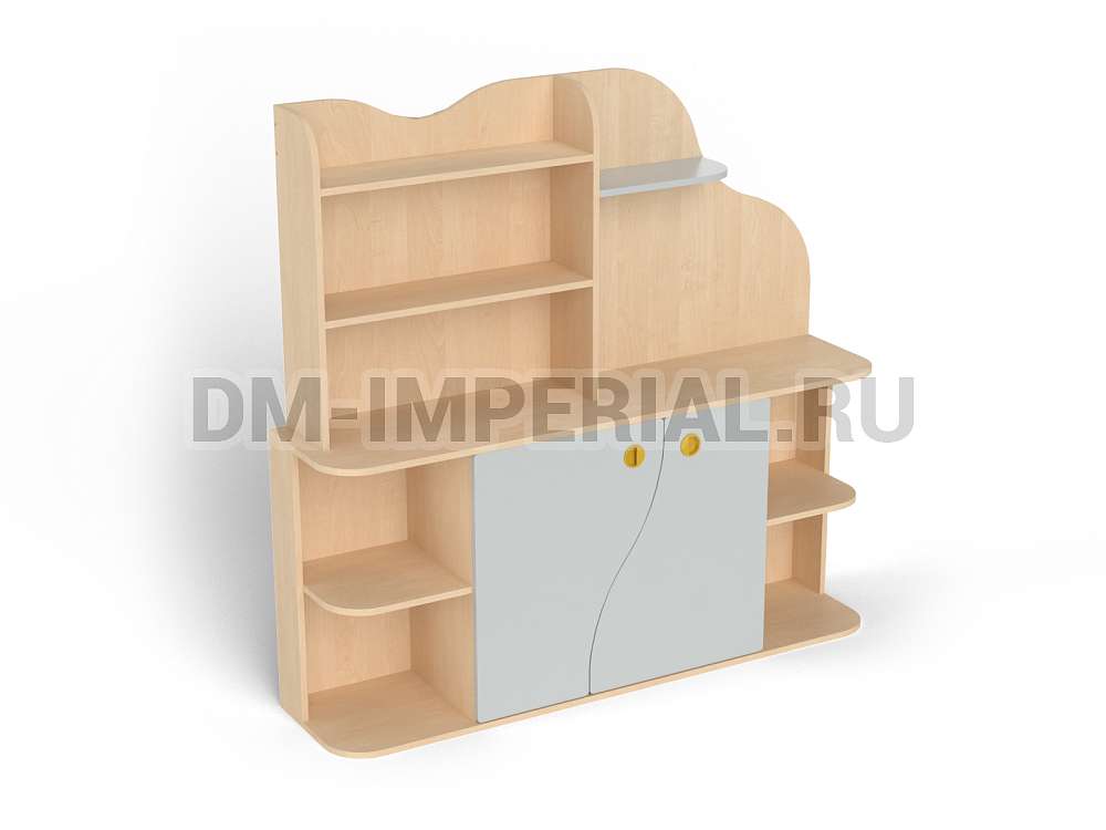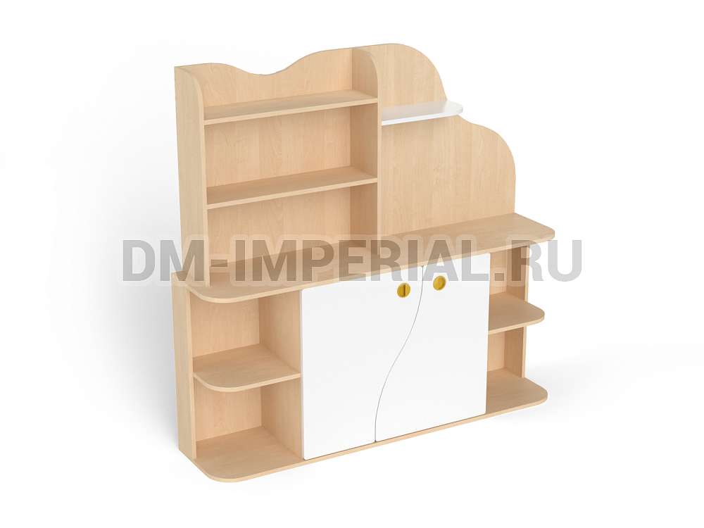 Данная модель уголка детского обладает необычным дизайном. В верхней части конструкции присутствует небольшая асимметрия: стандартный стеллажик с полками интересно дополняется панелью с фигурным краем. Нижняя часть стеллажа также содержит изюминку. Шкафчик с двумя дверцами декорирован фигурными панелями. Добавить акцентов можно при помощи окрашиваний. Палитра цветов DM Imperial разнообразна и позволяет реализовывать самые необычные идеи дизайна.