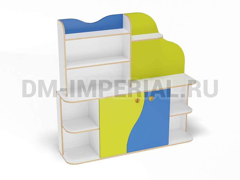 Модель уголка детского довольно большая. Габариты - 1500х350х1440 мм. Однако за счет асимметричных элементов вовсе не выглядит громоздкой. Количества мест для хранения достаточно, чтобы разместить все необходимое для обучения и развлечения ребенка. Обратите внимание что панель в верхней части можно декорировать рисунками, заметками, стикерами, открытками. Такой стеллаж хорошо подойдет для оформления тематической зоны, например, по изучению науки или природы. На панели можно разместить информационные плакаты, мотивирующие надписи и т.д.