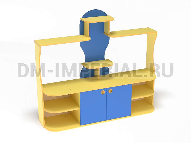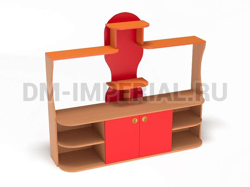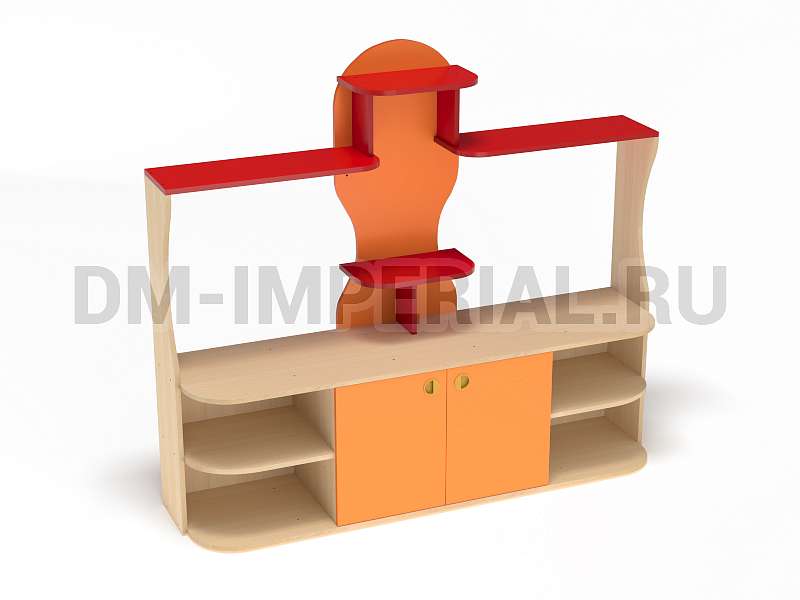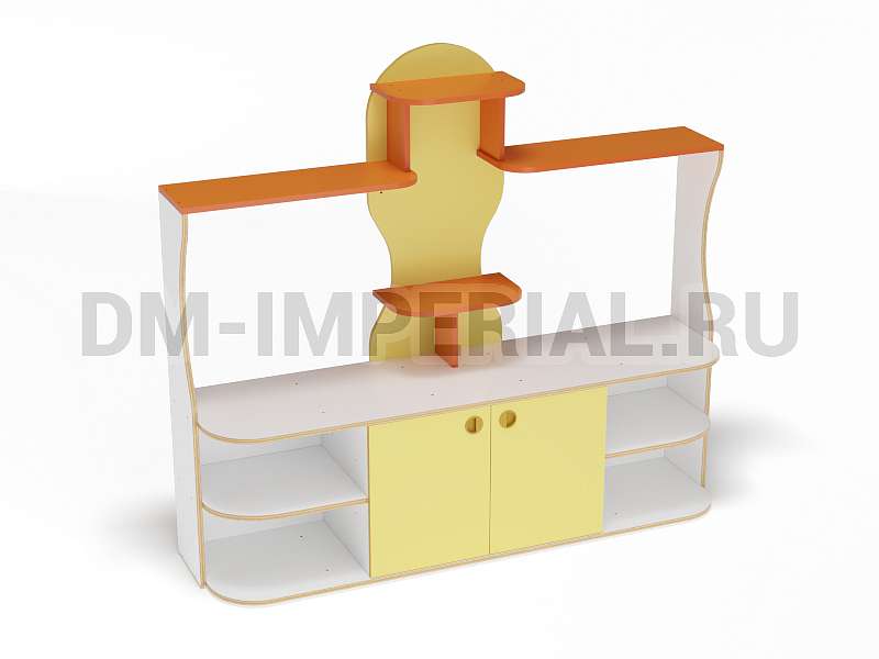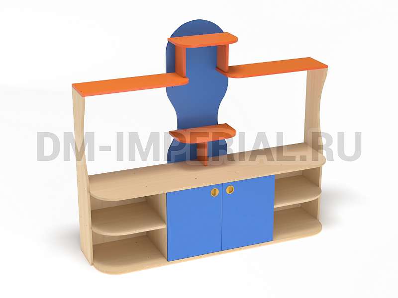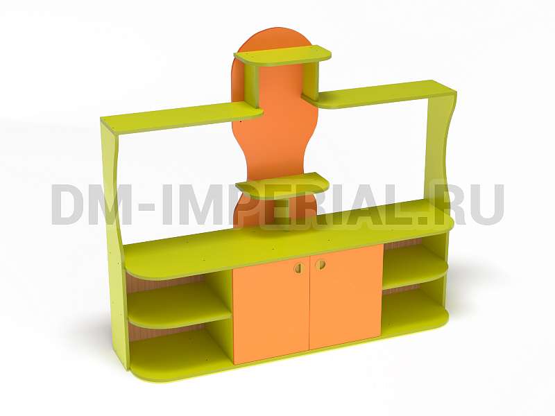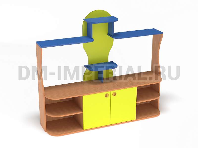 Данный детский уголок для ДОУ обладает довольно компактными размерами (1600х420х1400 мм) по сравнению с другими моделями в серии. Мебель хорошо впишется в любой интерьер благодаря универсальному дизайну, не будет занимать много места и смотреться громоздко. При этом конструкция уголка практична: предусмотрено много мест для хранения. Нижняя часть – вместительная тумба с открытыми полками и закрытым шкафчиком. Просторная столешница подойдет для расположения органайзеров с инструментами для творчества, выставок рисунков и поделок, а также небольших клеток и террариумов с питомцами для живого уголка. В верхней части предусмотрена система полок, которую можно оформить декором.