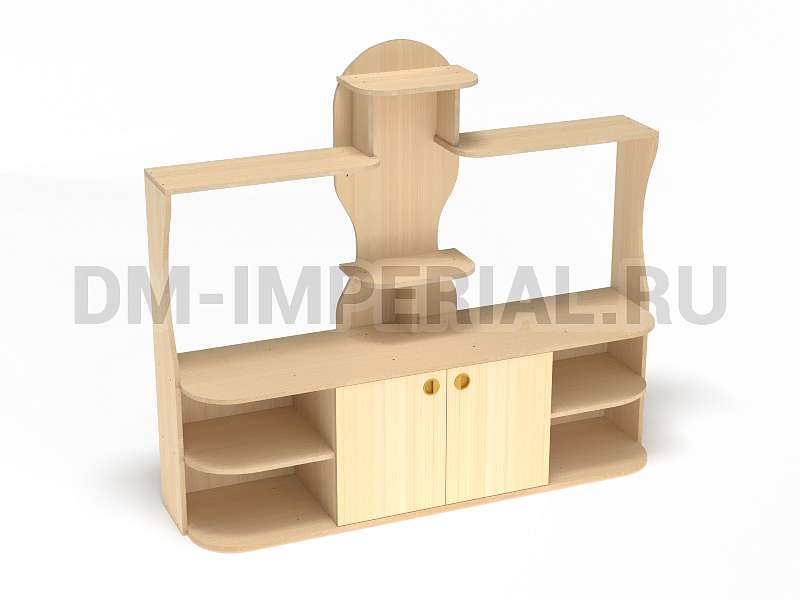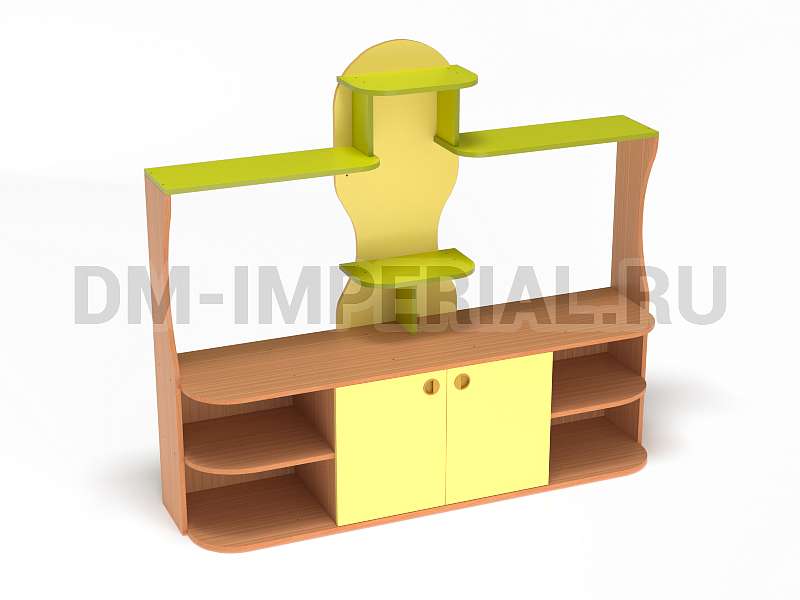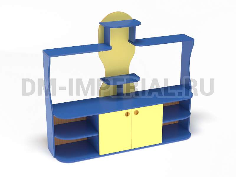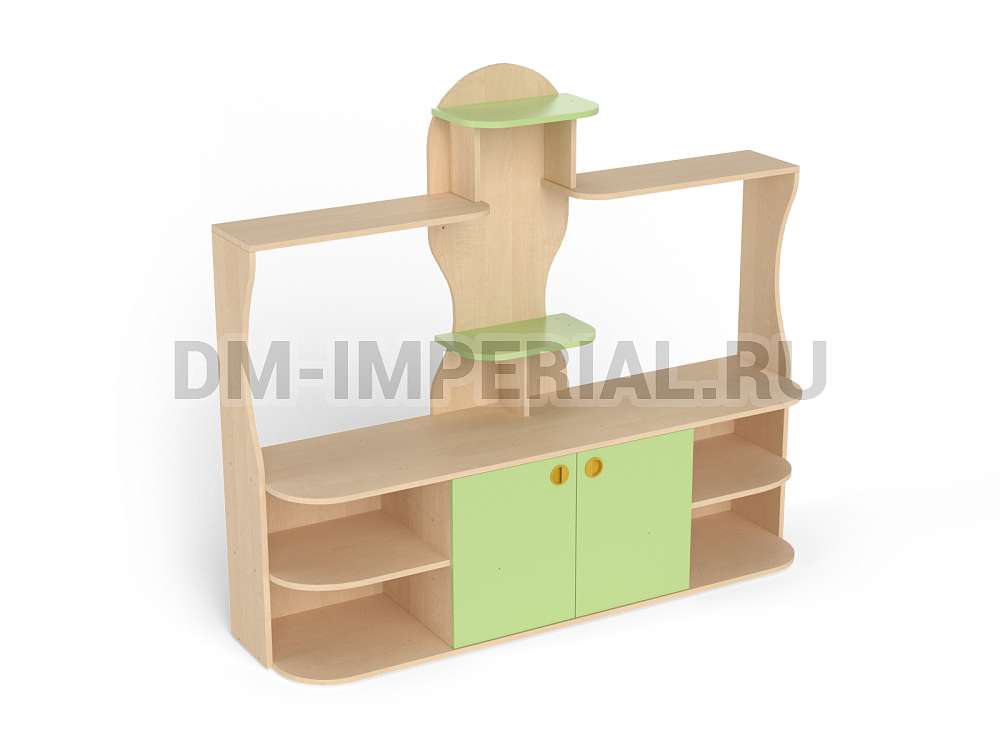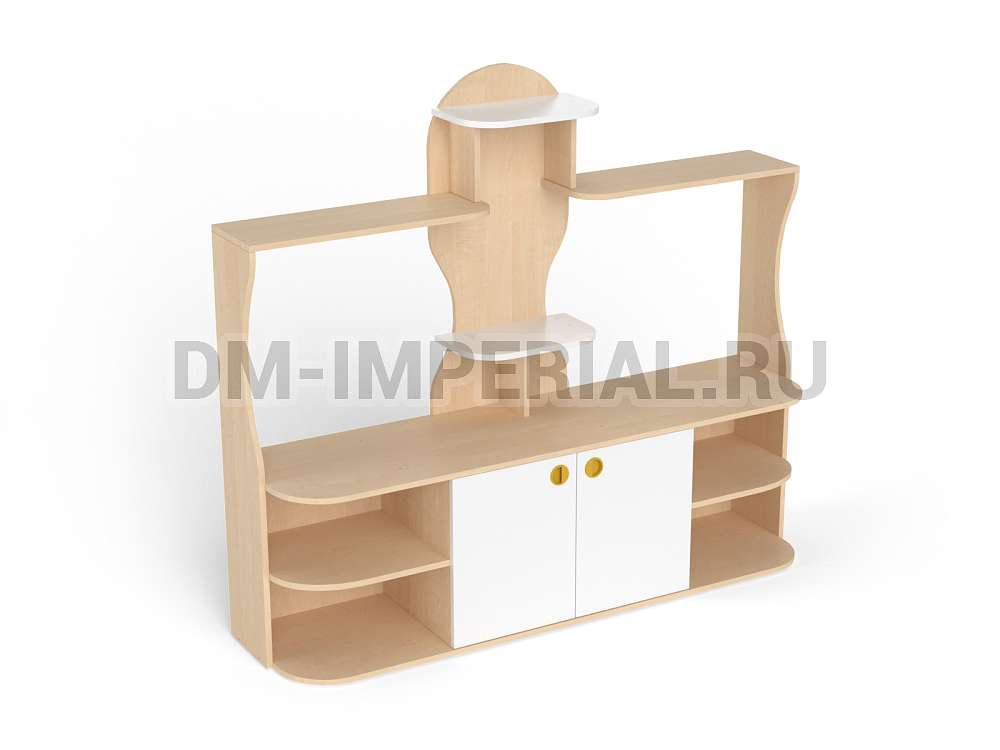 Данный детский уголок для ДОУ обладает довольно компактными размерами (1600х420х1400 мм) по сравнению с другими моделями в серии. Мебель хорошо впишется в любой интерьер благодаря универсальному дизайну, не будет занимать много места и смотреться громоздко. При этом конструкция уголка практична: предусмотрено много мест для хранения. Нижняя часть – вместительная тумба с открытыми полками и закрытым шкафчиком. Просторная столешница подойдет для расположения органайзеров с инструментами для творчества, выставок рисунков и поделок, а также небольших клеток и террариумов с питомцами для живого уголка. В верхней части предусмотрена система полок, которую можно оформить декором.