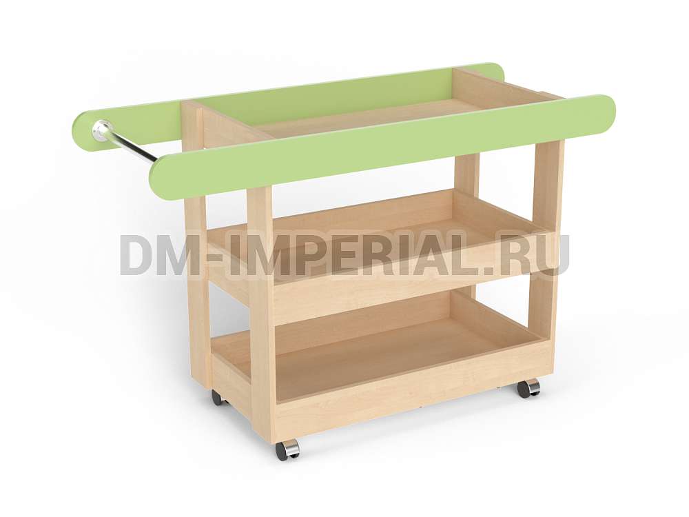 Модель изготавливается из прочного, износо- и влагостойкого ЛДСП толщиной 16 мм. Торцы облицовываются кромками ПВХ толщиной 2 мм. Уникальность данной конструкции - в мобильности. Модель оснащается четырьмя вращающимися колесиками и удобной рукоятью, что позволяет ее легко перемещать по помещению, исходя из нужд воспитателей и детей. Тележка небольшая и обладает небольшим весом, что позволяет ребенку старшего возраста самостоятельно двигать ее.