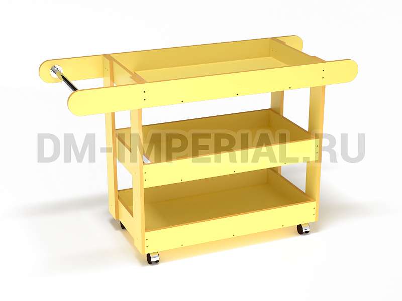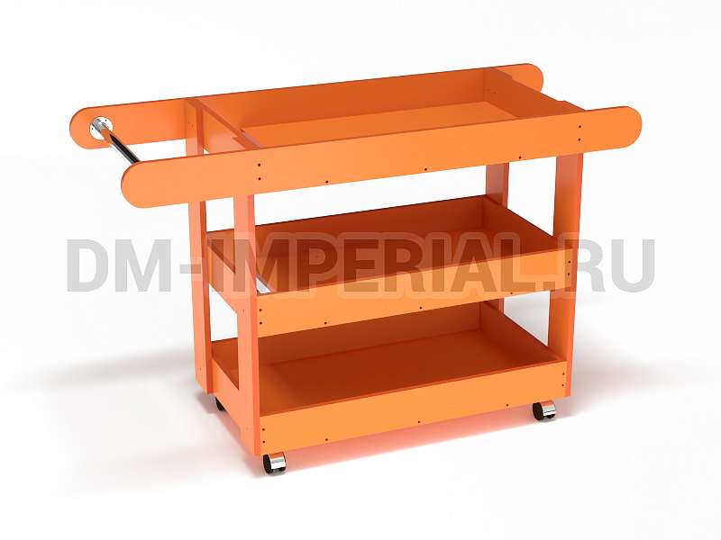 Данный стеллаж выполнен в форме тележки. Габариты конструкции 1280х500х800 мм. Модель небольшая, однако очень вместительная. Тележка оснащается тремя ярусами для различных предметов. Изначально стеллаж проектировался для обустройства спортивных пространств. Такой предмет мебели хорошо подходит для аккуратного и эстетичного хранения мячиков, воланчиков, ракеток, бит и прочего инвентаря. Однако, безусловно, спектр применения тележки гораздо шире.
