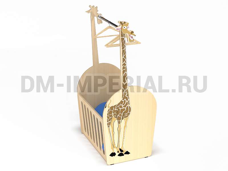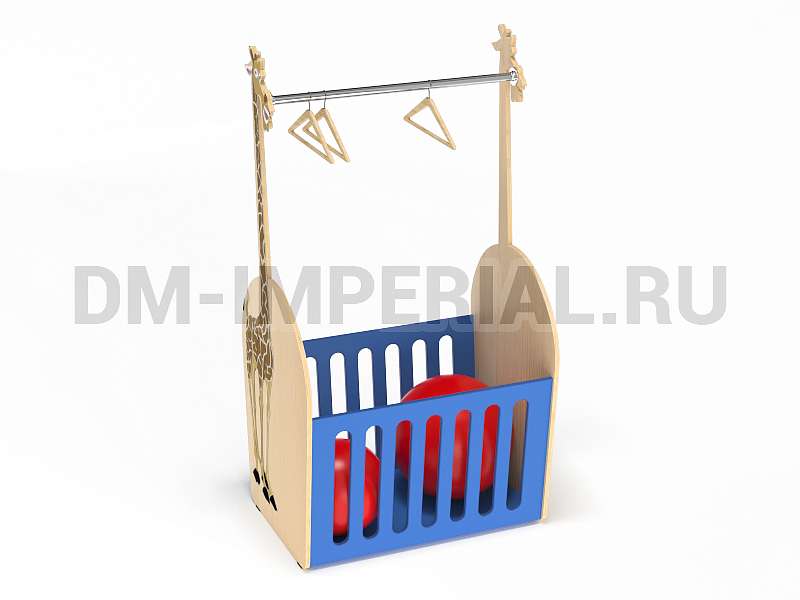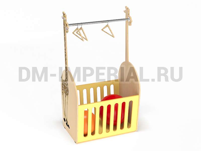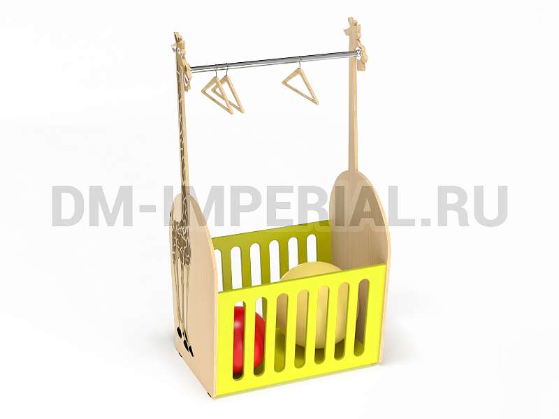 Представленный на этой странице ящик обладает очень необычным дизайном. Оснащается декоративными стенками с перфорацией, а также высокими стойками с рисунками жирафов. В верхней части предусмотрена небольшая перекладина с вешалками, на которой удобно оставлять личные вещи детей. Такой ящичек подойдет для хранения различного инвентаря и оборудования для активных, спортивных игр. Например, мячиков, ракеток и прочих вещиц, хранение которых сложно организовать аккуратно.